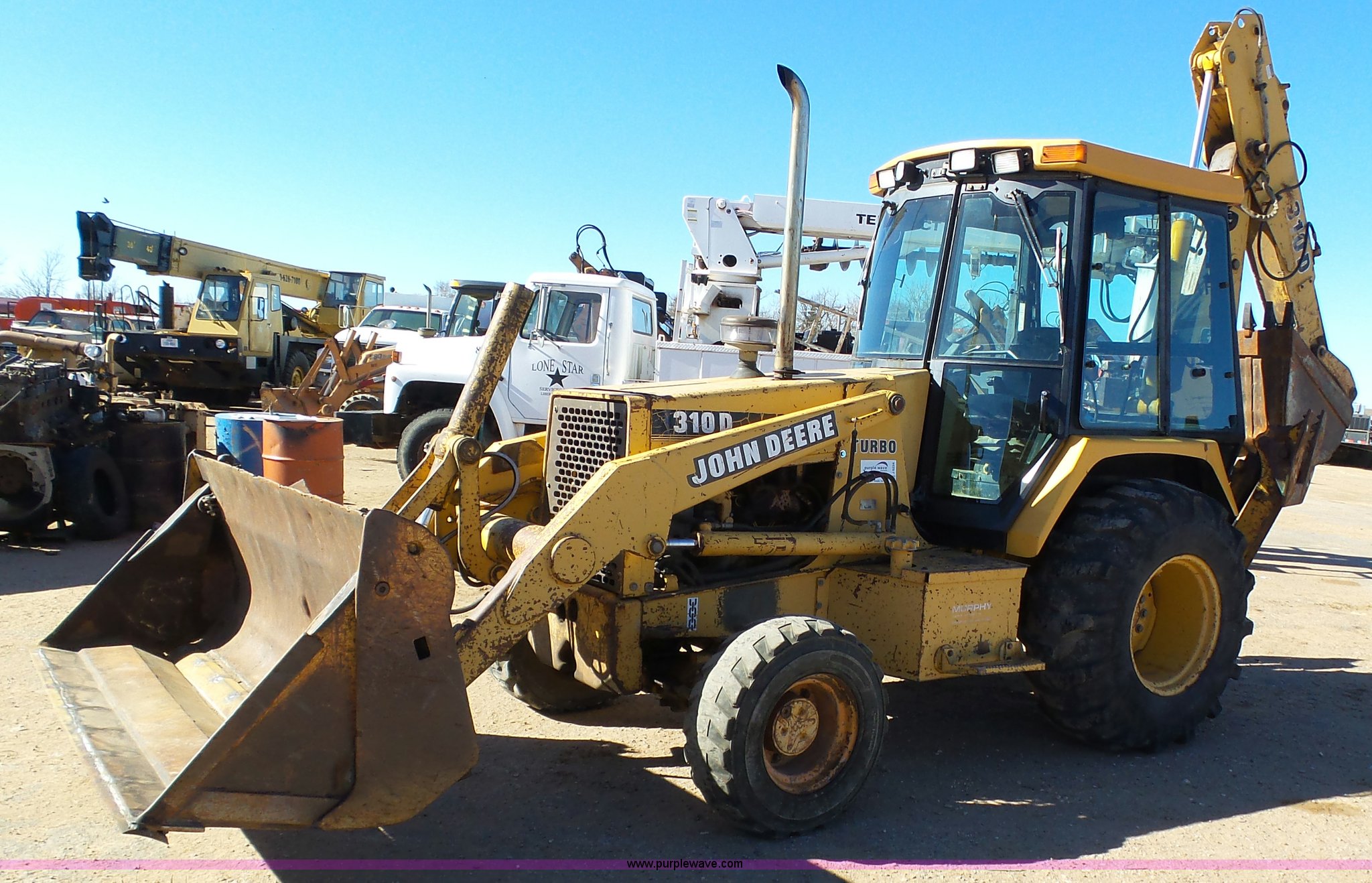 Purple Wave is selling a used Tractor Loader Backhoe in Kansas. This item is a 1994 John Deere 310D backhoe with the following: 9,876 hours on meter, John Deere 4039TT004 four cylinder turbo diesel engine, Serial T04039T461726, Powershift transmission, 4F-4R gears, Four wheel drive, EROPS, AC and heat, AM/FM, Suspension seat, Wobble stick backhoe controls, Wipers, Clamshell 90"W loader bucket, Weld-on cutting edge, E-stick, 24"W backhoe bucket, Model AT162621, 7.5 cubic foot capacity, (5) teeth, Block heater, Hydraulic outriggers, 12-16.5 front tires, 19.5-24 rear tires, 13,600 lbs. base operating weight, Cylinder leaks, Oil leaks, Non-operational radio, Non-operational AC, Serial T0310DB802208