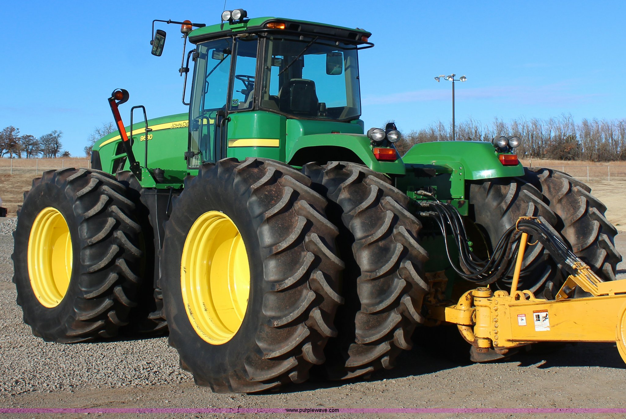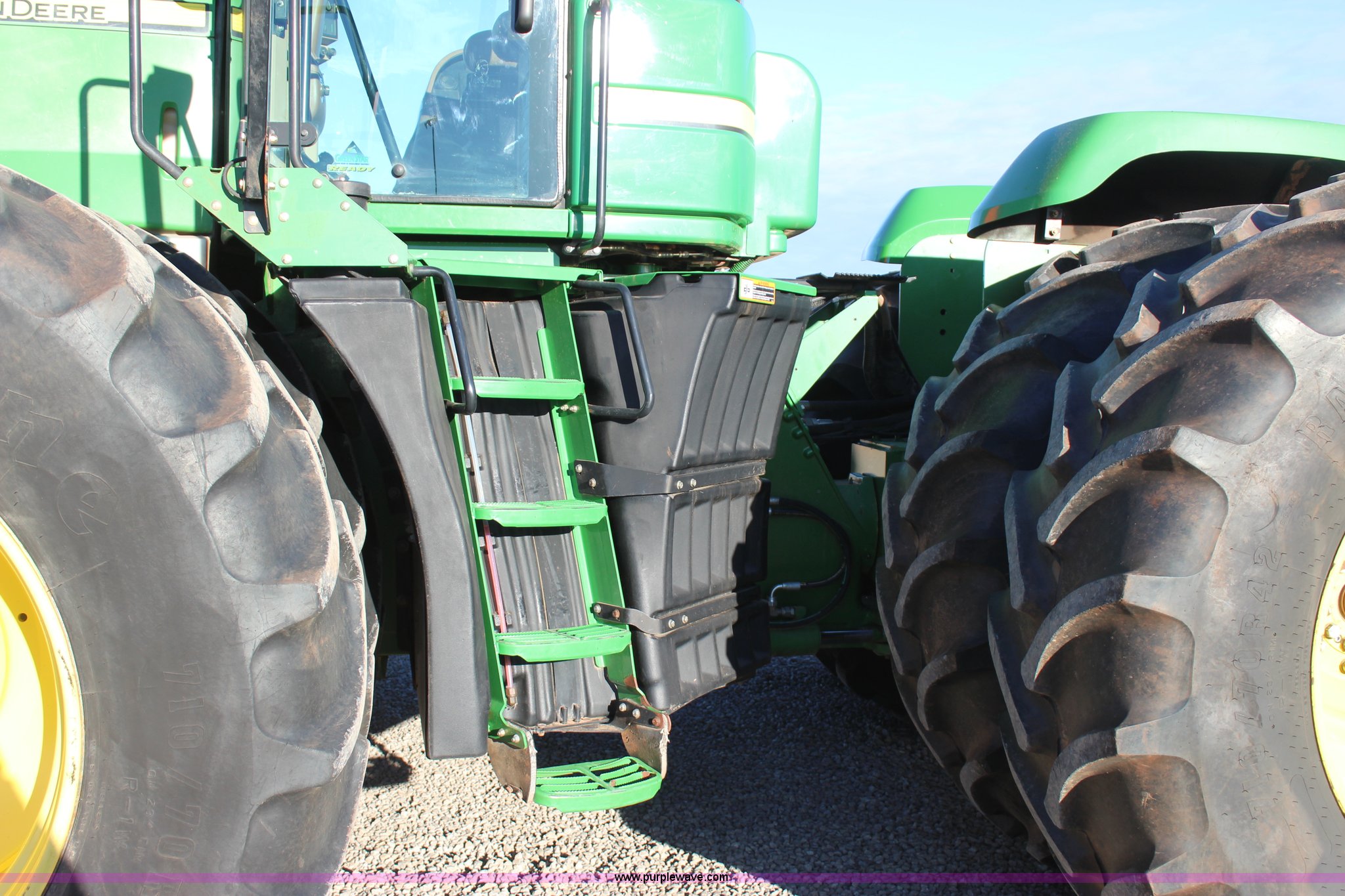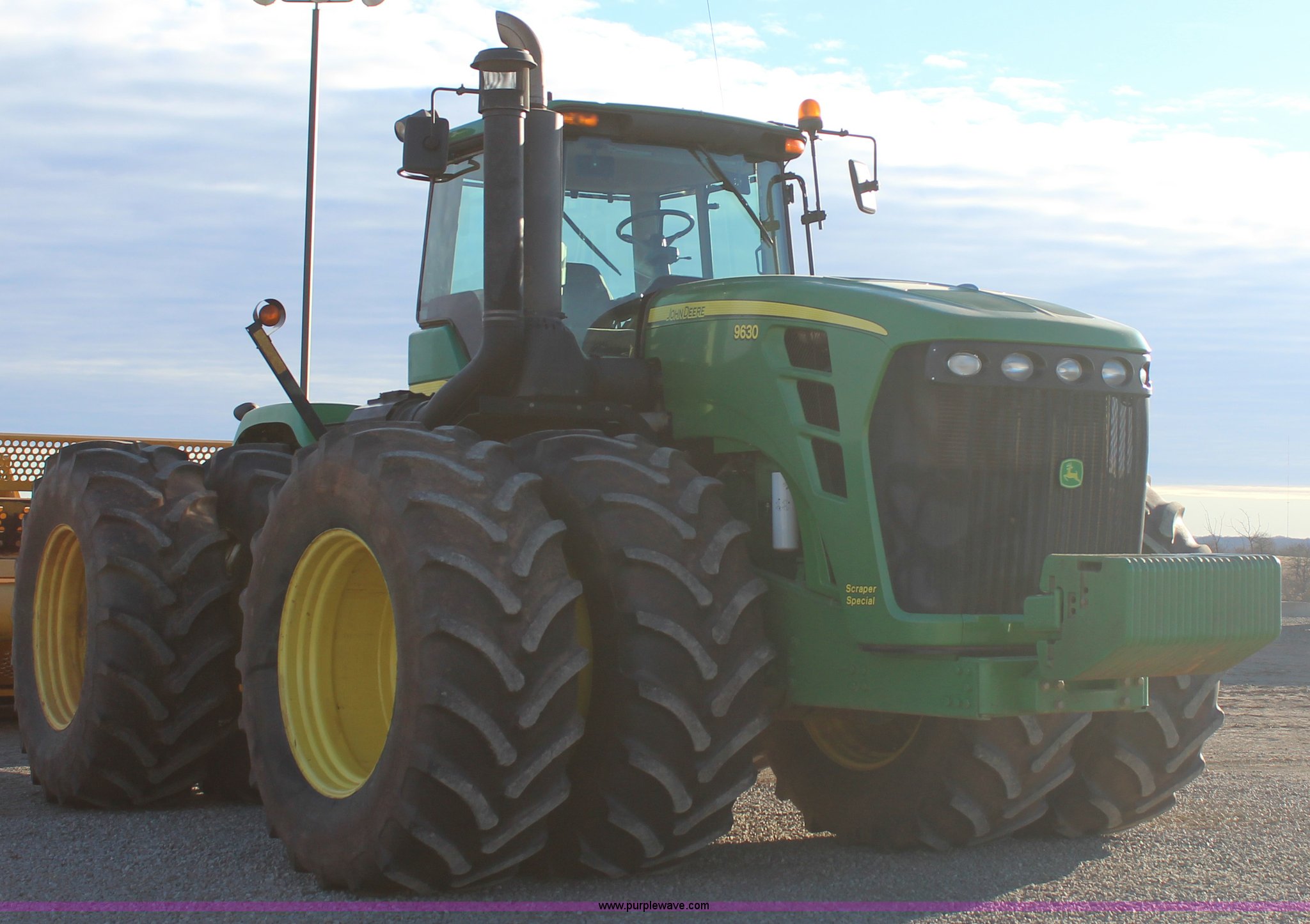 Purple Wave is selling a used Articulated 4-Wheel Drive Tractor in Oklahoma. This item is a 2009 John Deere 9630 4WD tractor with the following: 630 hours on meter, Approx. 6,399 total hours, John Deere 13.5L six cylinder diesel engine, Engine replaced at 5,769 hours in December 2014, 630 hours of use since engine was replaced, Serial SE6135L127699, Powershift transmission, 18F-6R gears, Transmission replaced approx. 1,500 hours ago in June 2013, Differential lock, AC and heat, Tilt steering wheel, AM/FM, Air suspension seat, Instructor's seat, Shade, GreenStar ready, (4) rear hydraulic remote sets, (22) suitcase weights, 710/70R42 dual tires, Front axle replaced in June 2015, Serial RW9630E010185