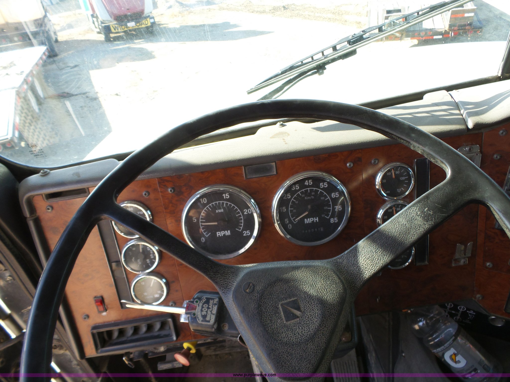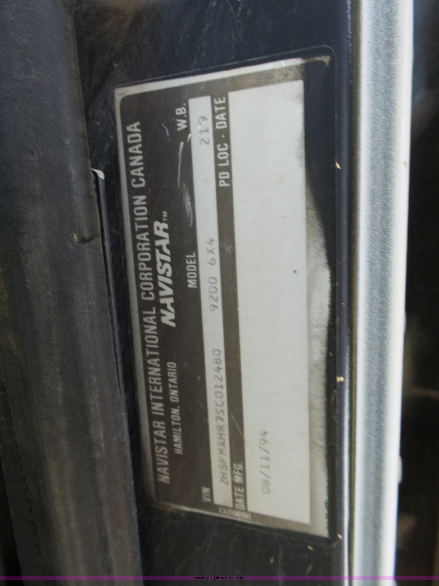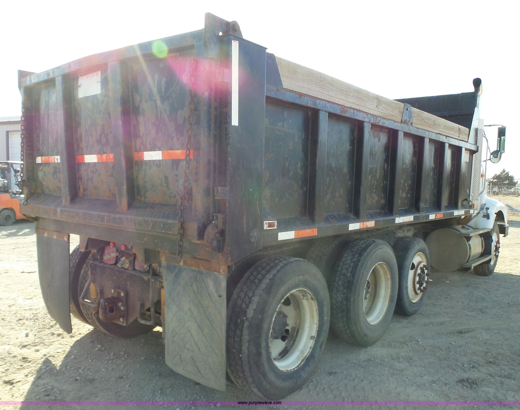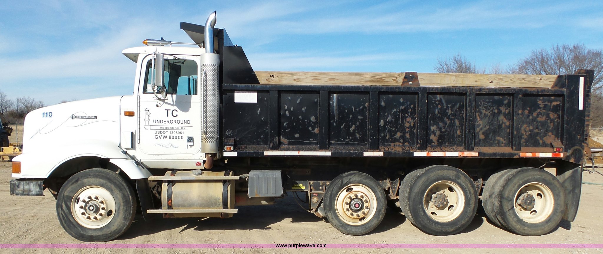 Purple Wave is selling a used Construction Dump Truck in Kansas. This item is a 1995 International 9200 dump truck with the following: 942,062 miles on odometer, Cummins M11 10.8L L6 turbo diesel engine, Nine speed manual transmission, Inter-axle differential lock, Tandem axle, AC and heat, Cruise, AM/FM/cassette, Heated mirrors, Air suspension seat, Trailer brake controller, PTO, Davis steel dump bed, 17'L x 96"W, 36" side height, 8" side board height, Single ram hoist, Air operated end gate, Pintle hitch, Air suspension, Air brakes, Engine brake, 11R22.5 front tires, 295/75R22.5 rear tires, GVWR 52,000 lbs, FAWR 12,000 lbs, IAWR 20,000 lbs, RAWR 20,000 lbs