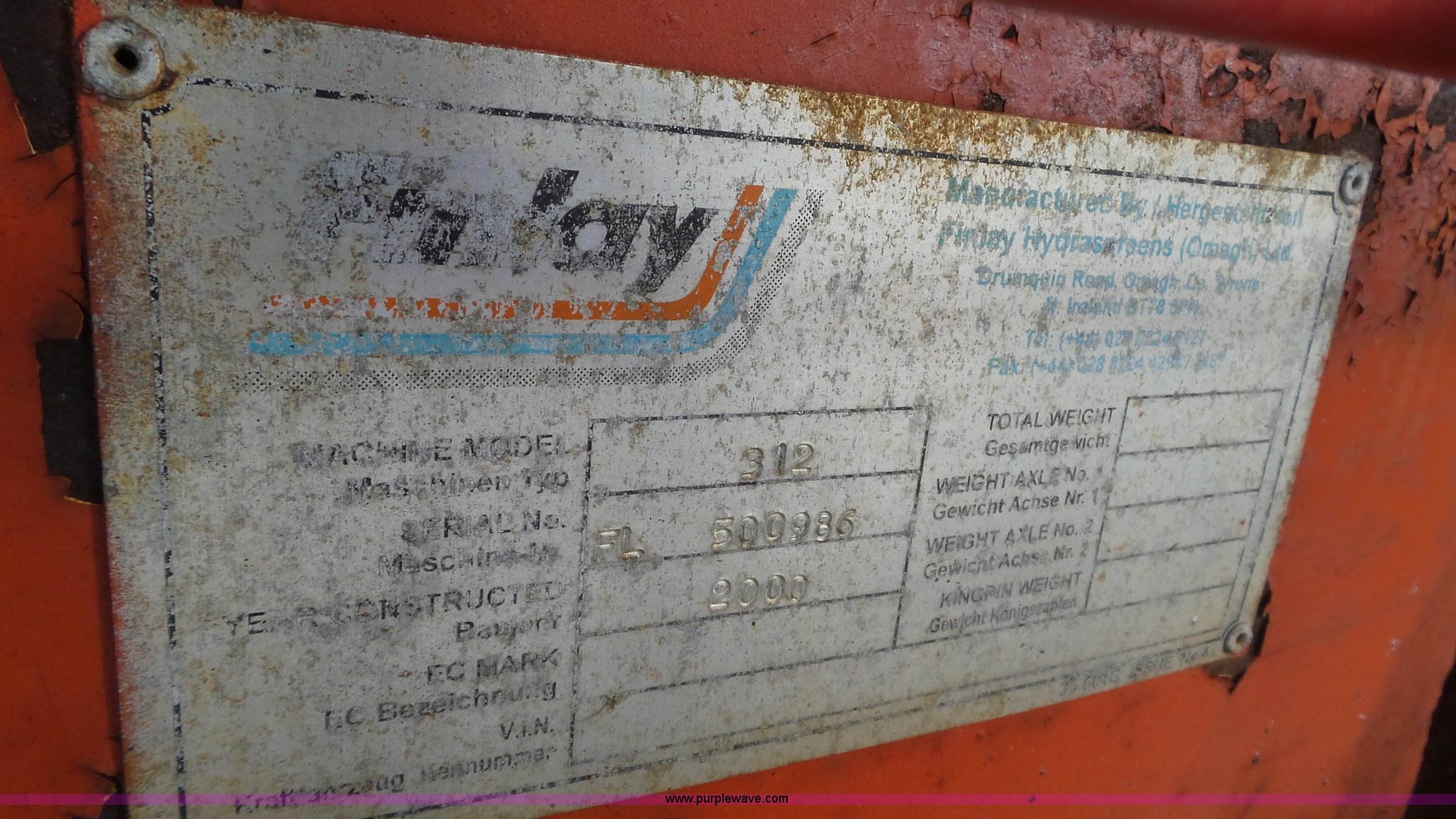 Purple Wave is selling a used Screen or Screening Plant in Wisconsin. This item is a 2000 Finlay C312 screen with the following: Deutz four cylinder diesel engine, 4' x 8' dual screens, 6' x 12' hopper, 30"W conveyor, Hydraulic leveling, Hydraulic grizzly's, Pintle hitch, 235/75R17.5 tires, Serial 500986