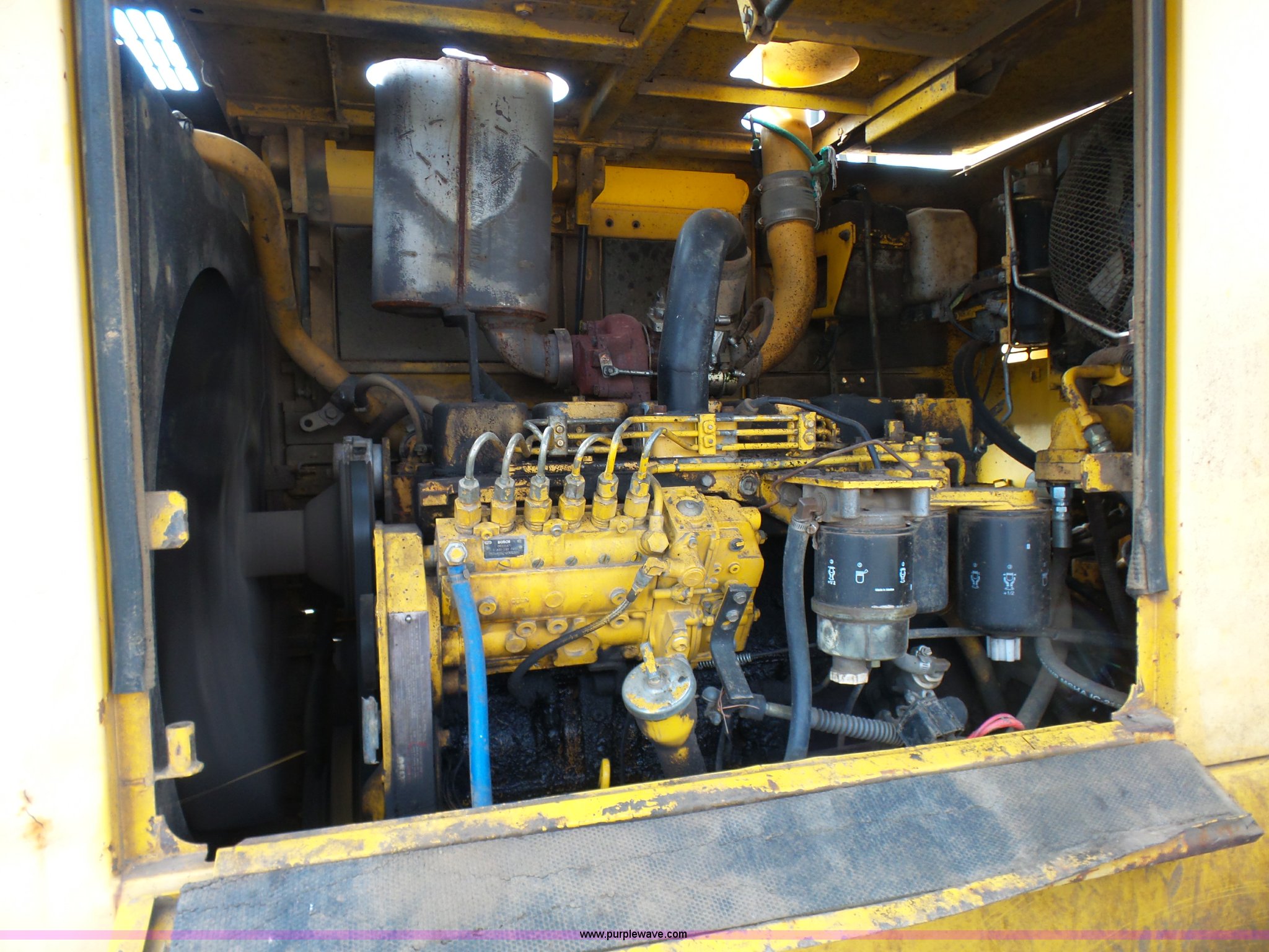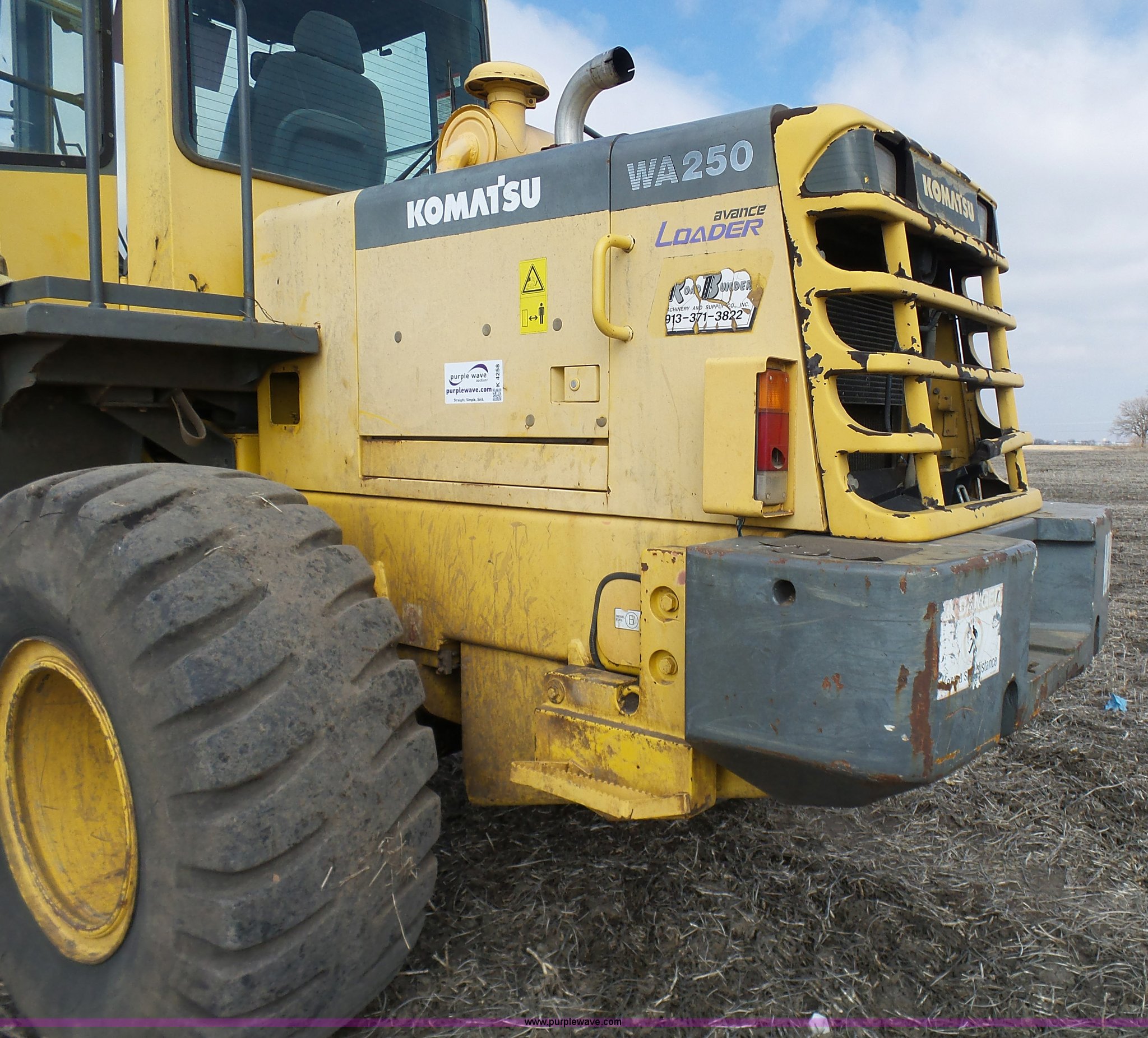 Purple Wave is selling a used Wheel Loader in Missouri. This item is a 2000 Komatsu WA250-3MC wheel loader with the following: 12,976 hours on meter, Cummins 5.9L L6 turbo diesel engine, 135 HP, Powershift transmission, 4F-4R gears, Enclosed cab, AC and heat, AM/FM, Tilt steering wheel, Suspension seat, Joystick bucket controls, Wipers, Front and rear work lights, Manual quick coupler, Counterweights, 20.5R25 tires, Transmission issues, First and second gear do not function properly, Serial 71081