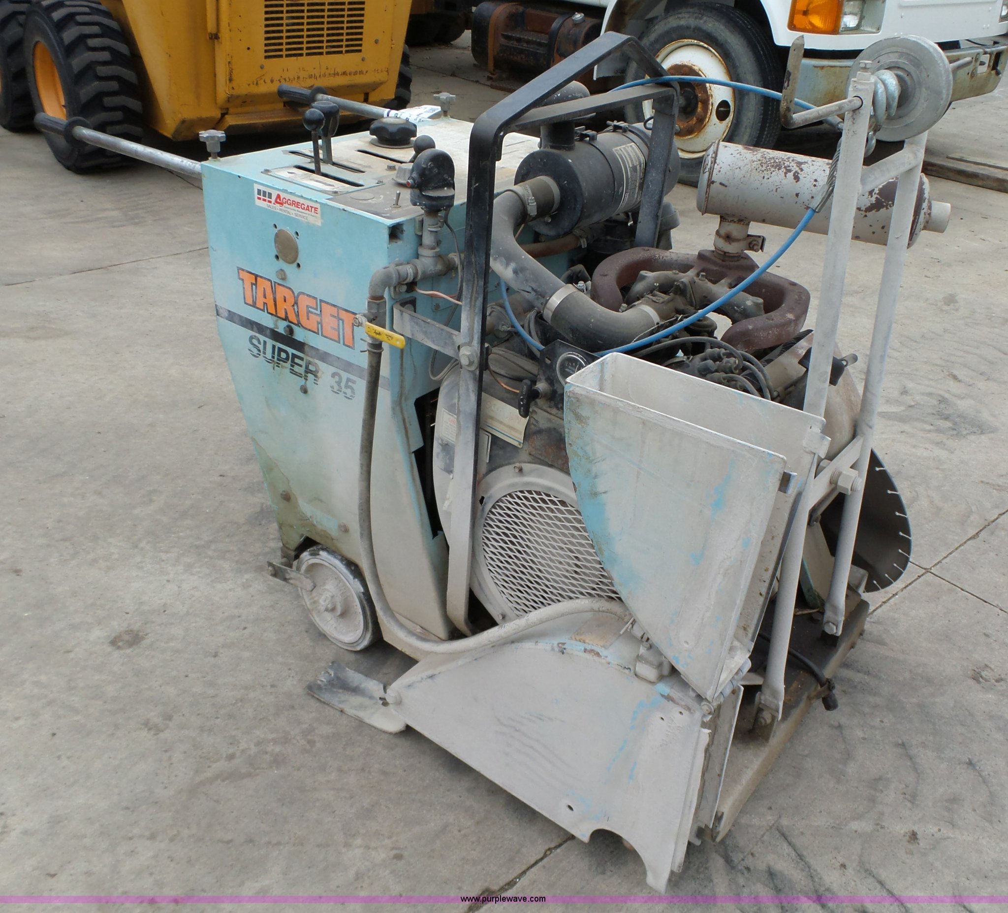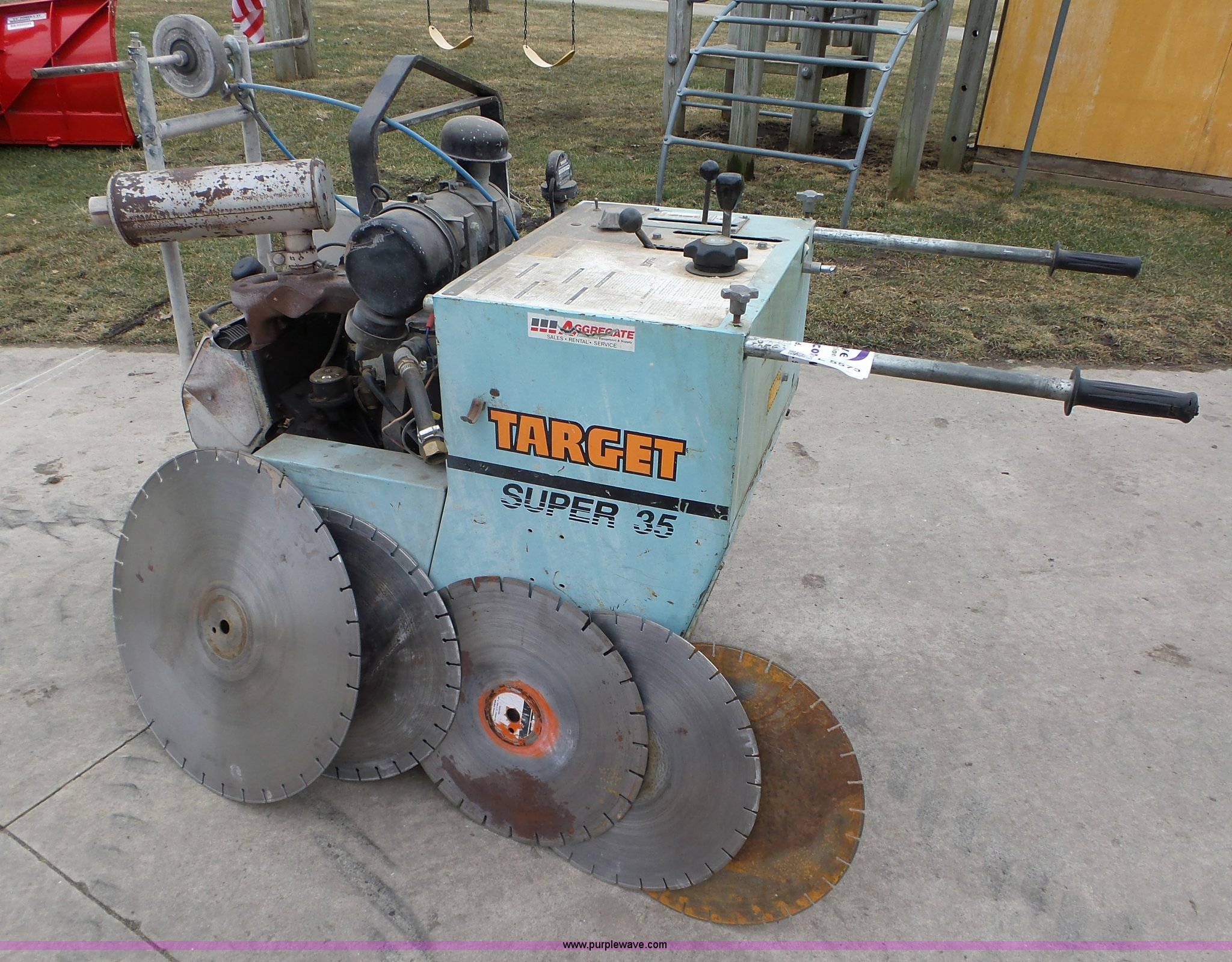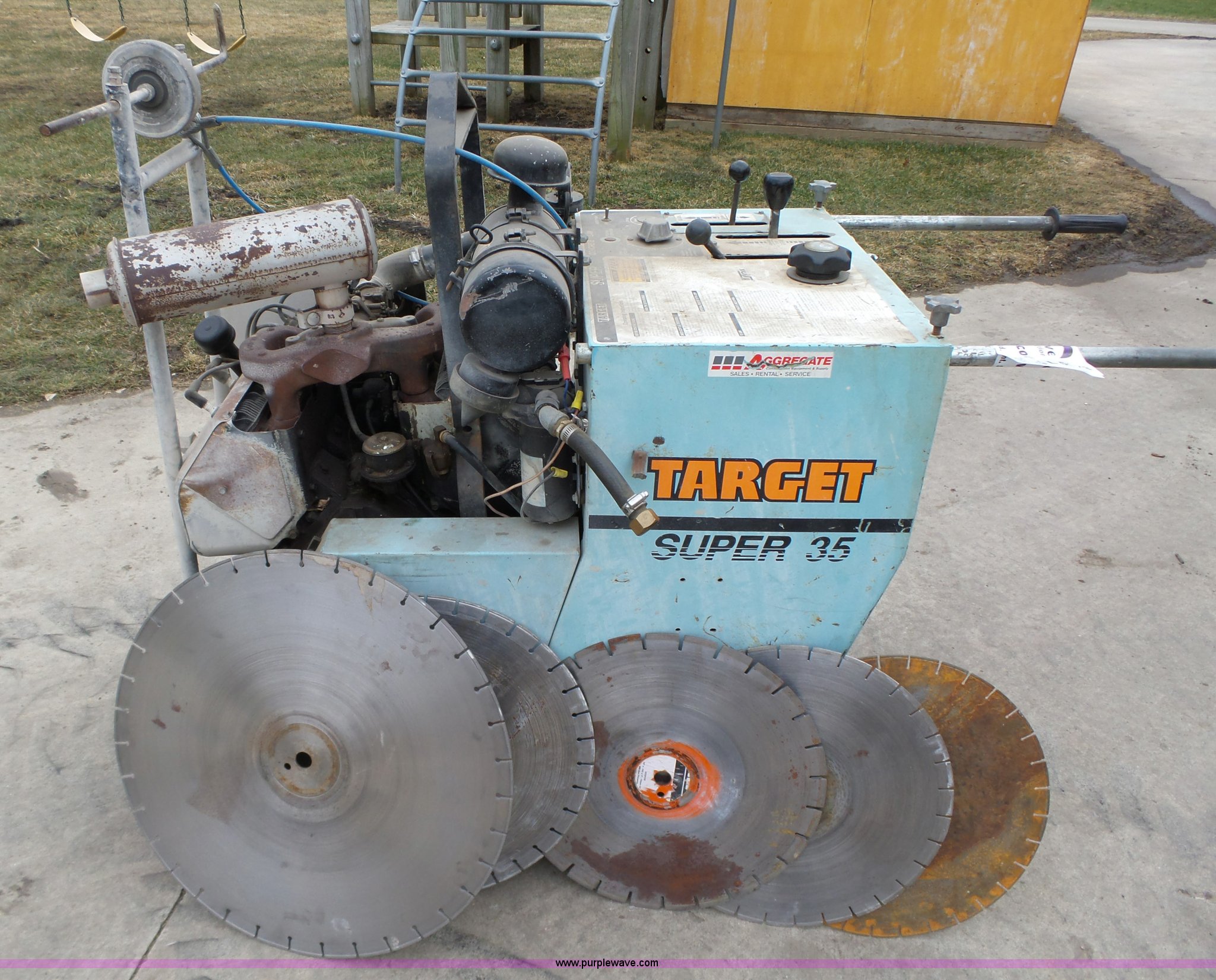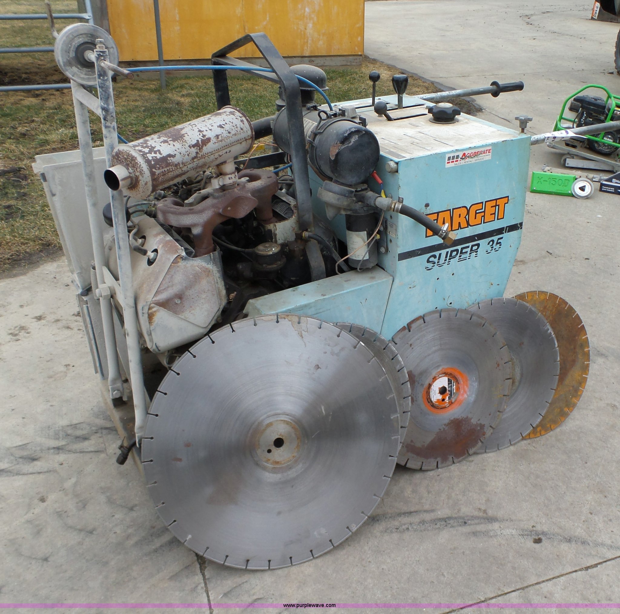 Target Super 35 concrete saw. Wisconsin four cylinder gas engine Serial 103232, Water spray system, Power blade depth control, 24" blade, 20" blade, (3) 18" blades. View equipment video. Gallant Construction. 2868 NE 56th Street. Altoona, IA 50009