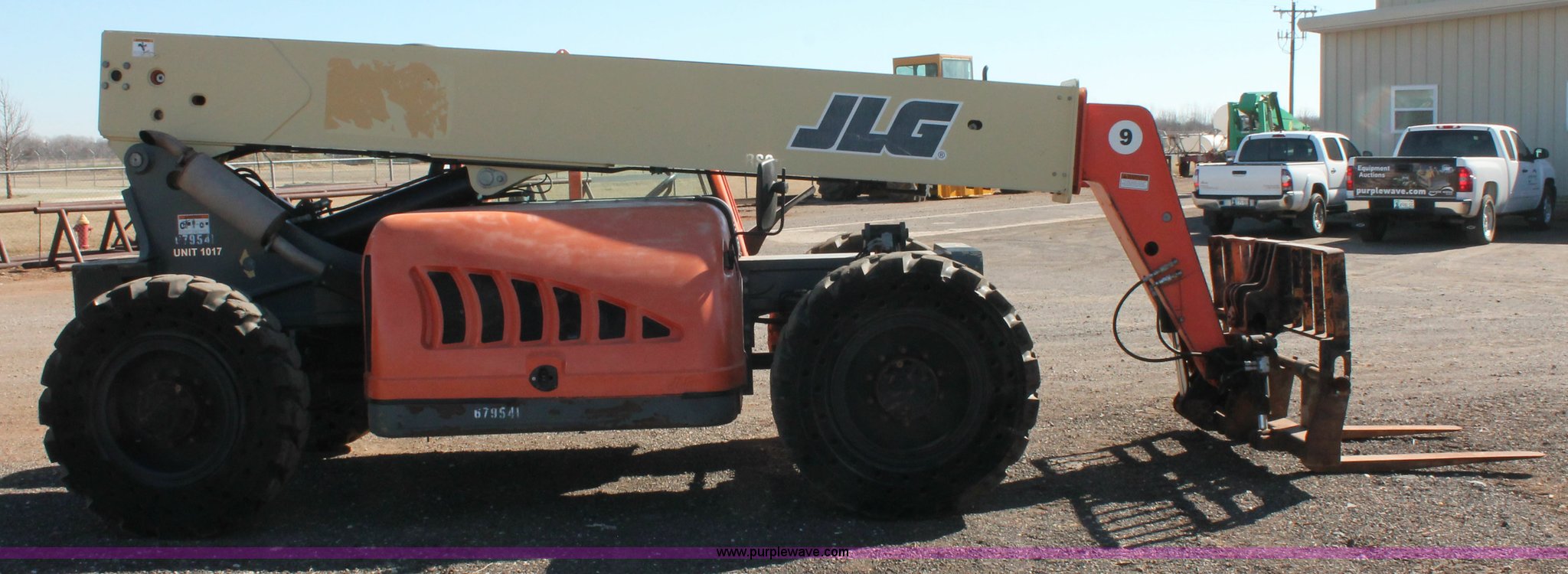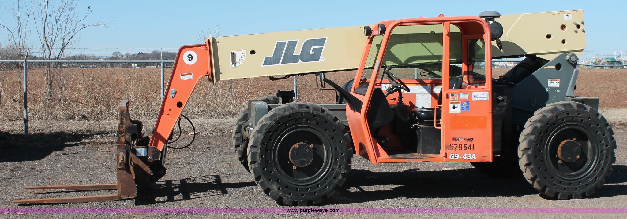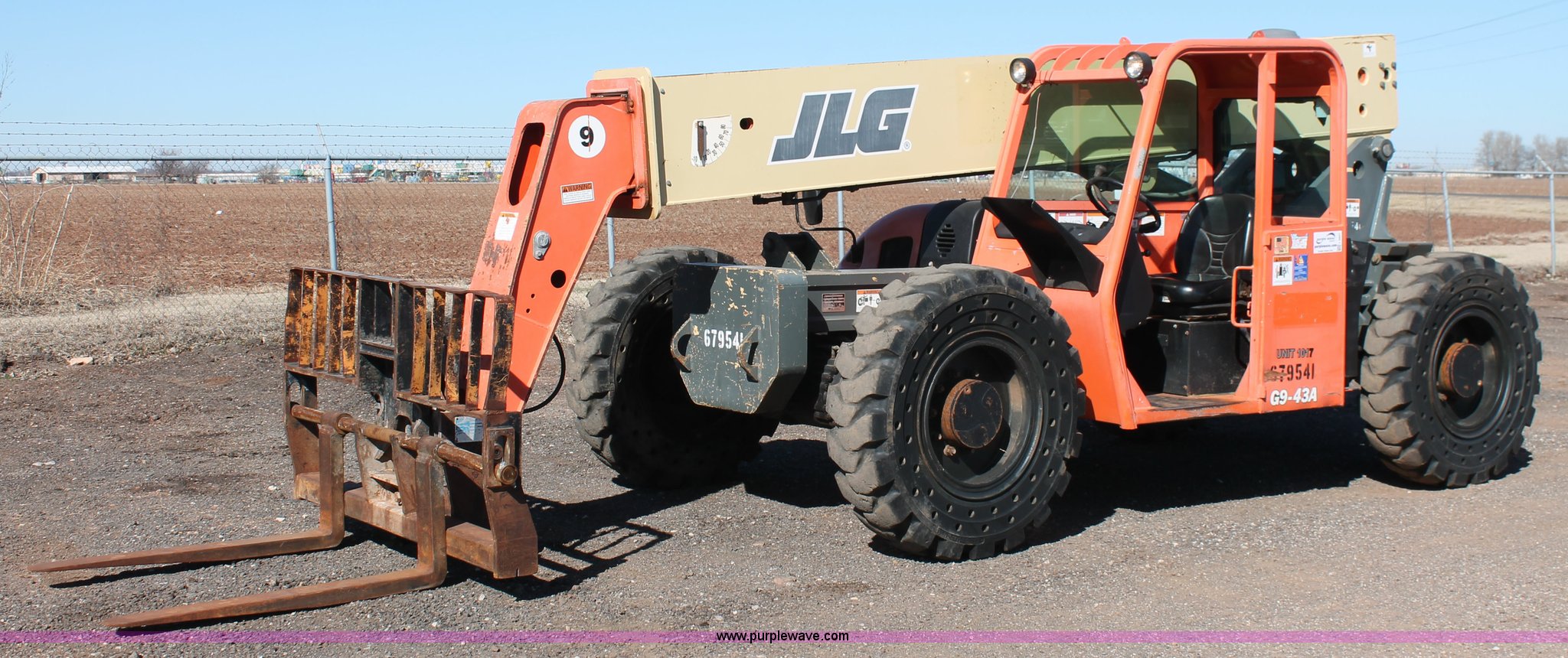 Purple Wave is selling a used Telehandler in Oklahoma. This item is a 2007 JLG G9-43A telehandler with the following: 6,765 hours on meter, Perkins 2168/2400 4.4L four cylinder diesel engine, 99 HP, Powershift transmission, 4F-4R gears, Four wheel drive, OROPS, Tilt cab, Work lights, Backup alarm, Crab steer, Four wheel steer, 9,000 lbs maximum lift capacity, 43' maximum lift height, Three boom sections, 48"L x 5"W forks, Auxiliary hydraulics, 72"W tilt carriage, Hydraulic leveling, Quick attach, Gradall 9140-5079 slope piler, Carriage side tilt, 13.00-24 solid tires, 25,907 lbs. base operating weight, Serial 0160026364