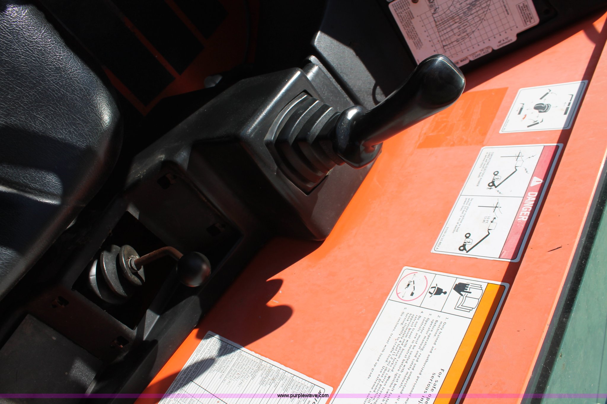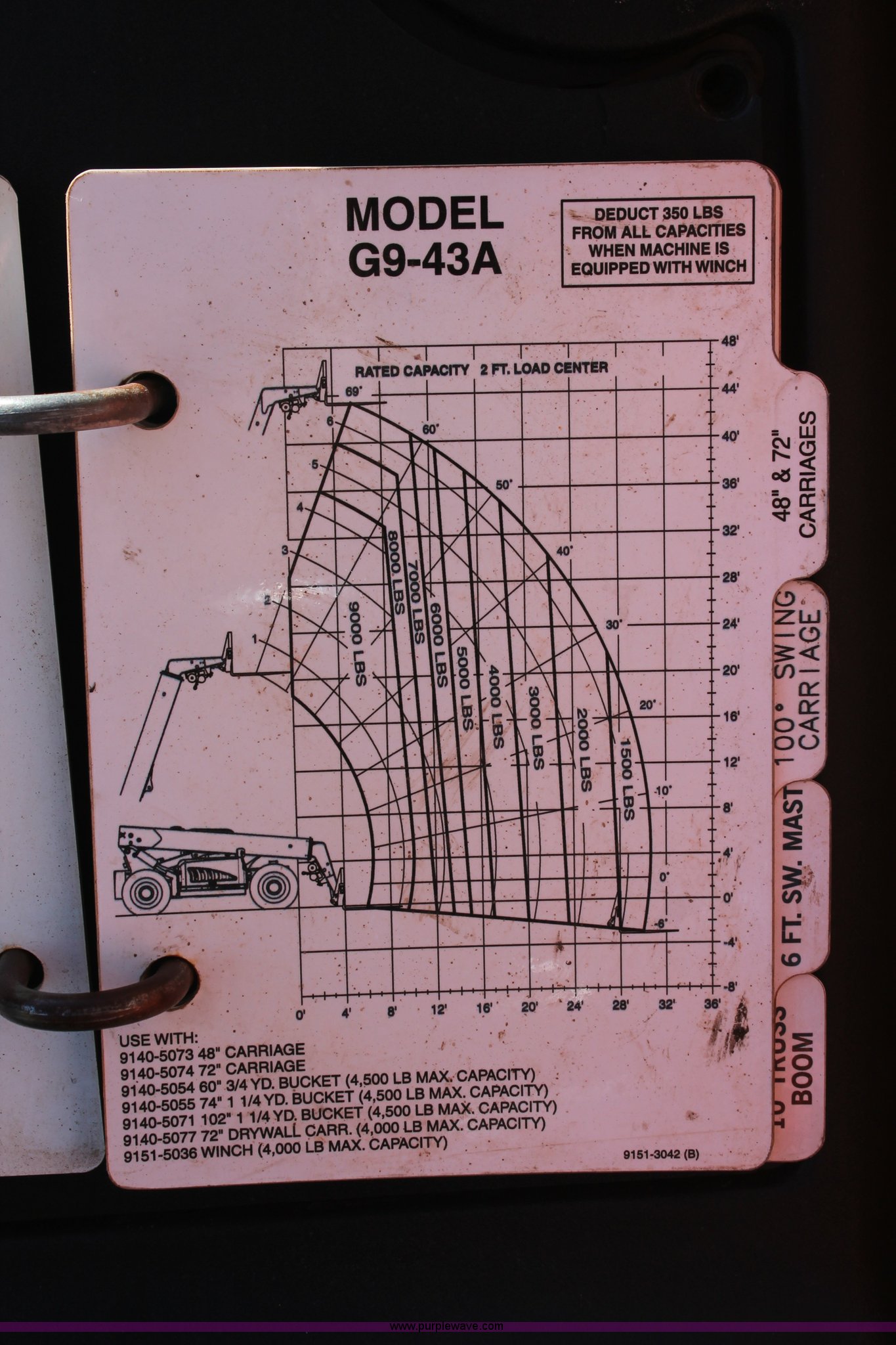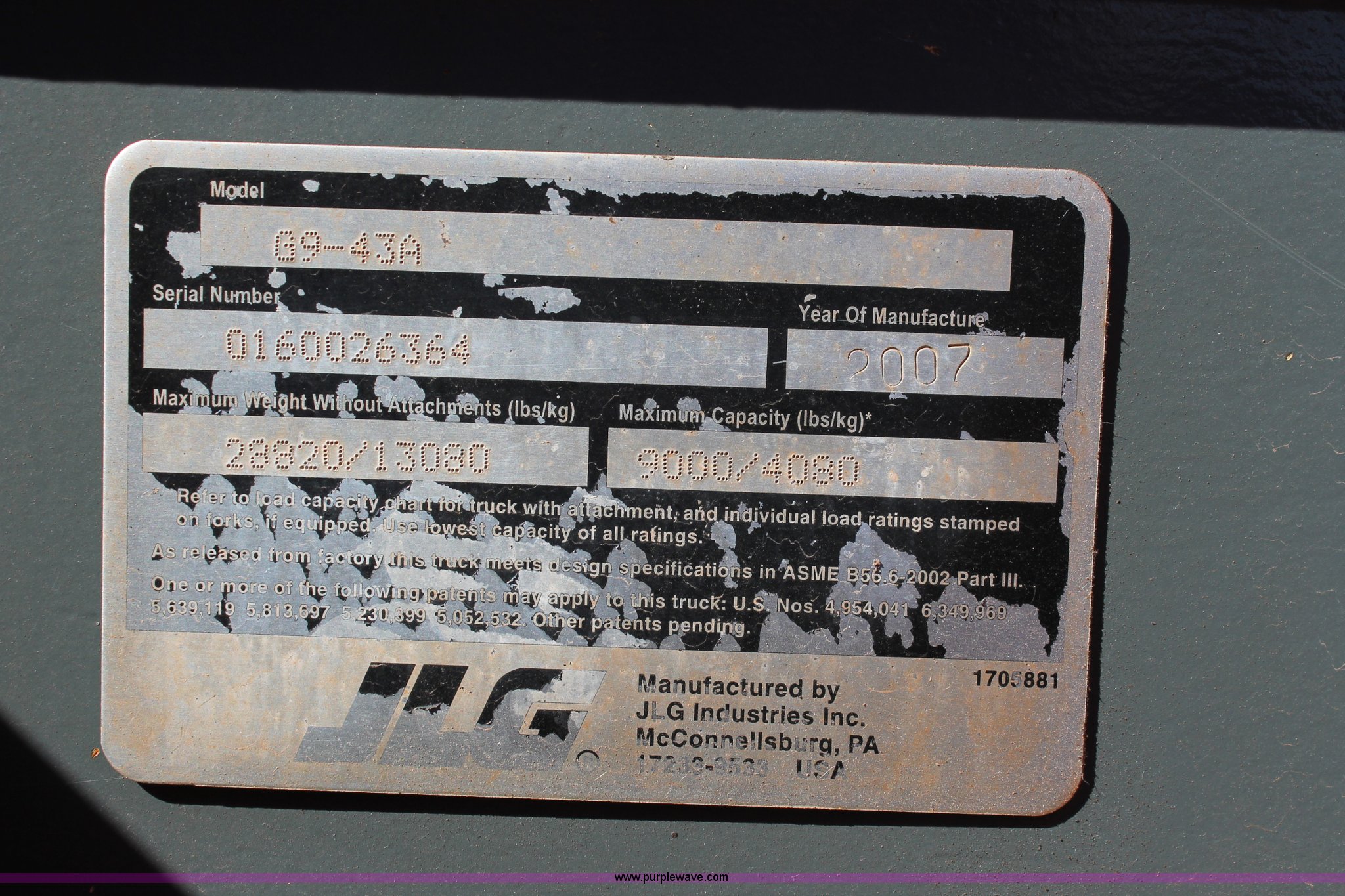 Purple Wave is selling a used Telehandler in Oklahoma. This item is a 2007 JLG G9-43A telehandler with the following: 6,765 hours on meter, Perkins 2168/2400 4.4L four cylinder diesel engine, 99 HP, Powershift transmission, 4F-4R gears, Four wheel drive, OROPS, Tilt cab, Work lights, Backup alarm, Crab steer, Four wheel steer, 9,000 lbs maximum lift capacity, 43' maximum lift height, Three boom sections, 48"L x 5"W forks, Auxiliary hydraulics, 72"W tilt carriage, Hydraulic leveling, Quick attach, Gradall 9140-5079 slope piler, Carriage side tilt, 13.00-24 solid tires, 25,907 lbs. base operating weight, Serial 0160026364