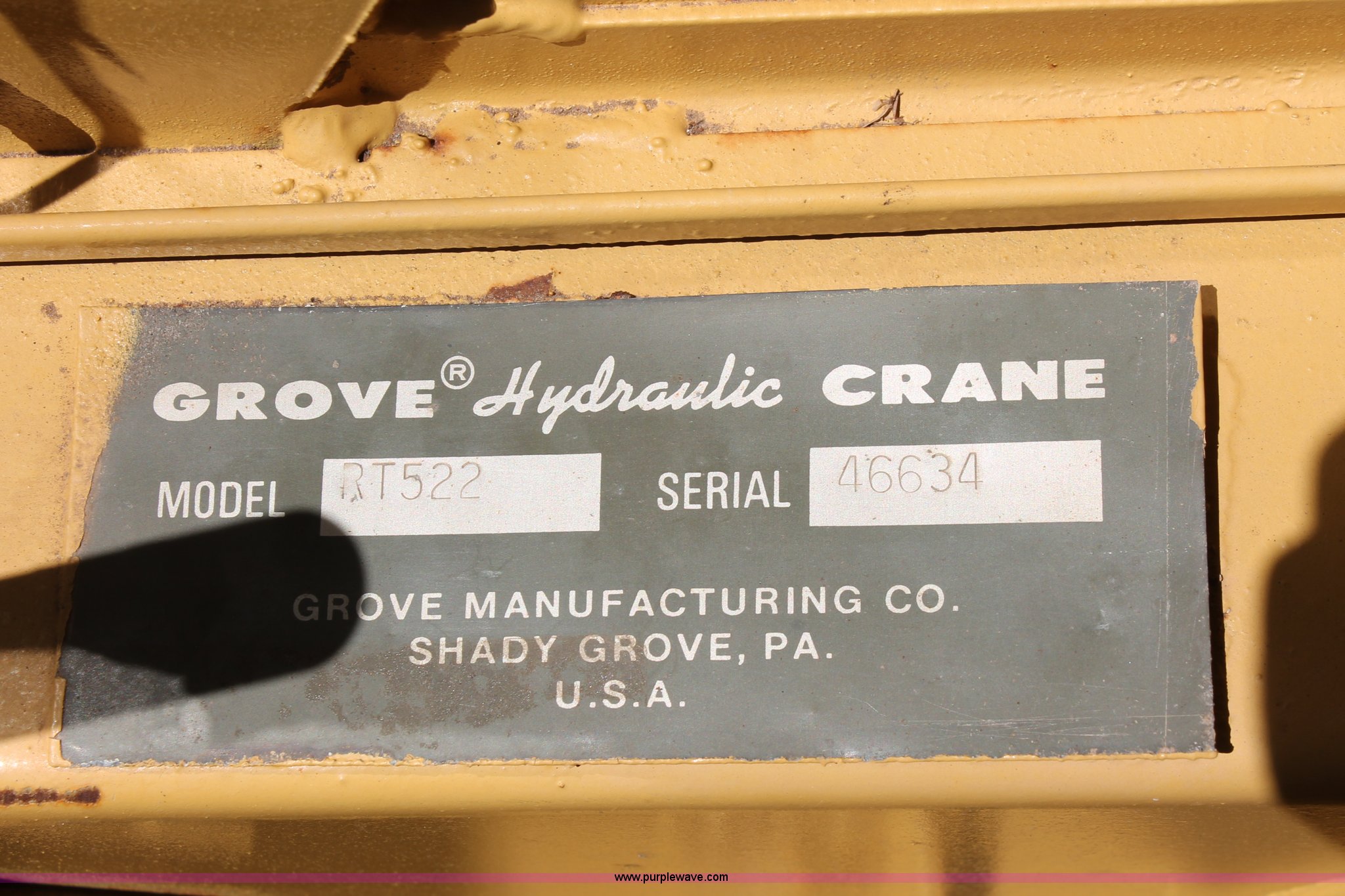 Purple Wave is selling a used Rough or All Terrain Crane in Oklahoma. This item is a 1980 Grove RT522 rough terrain crane with the following: 2010 Cummins 5.9L L6 turbo diesel engine, 165 HP, Serial 50257960, Automatic transmission, Stick crane controls, Telescopic boom, 75' boom length, 44,000 lbs maximum lift capacity, Three sections, Single winch, In-cab boom controls, 360 degree rotation, Crane block, 25 ton capacity, (4) stabilizers, Hydraulic brakes, 20.5-25 tires, 49,316 lbs. base operating weight, Recently replaced engine, Left rear outrigger hose needs replaced, Brakes need work, Serial 46634