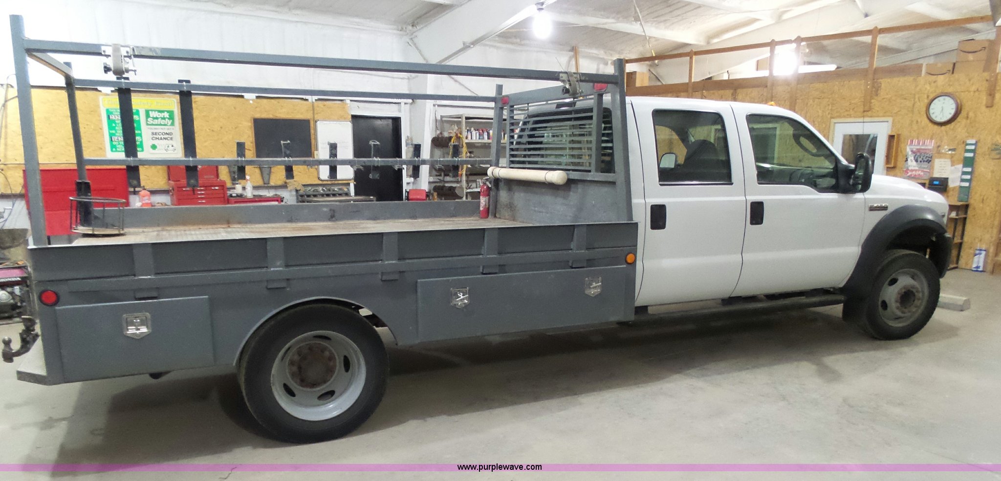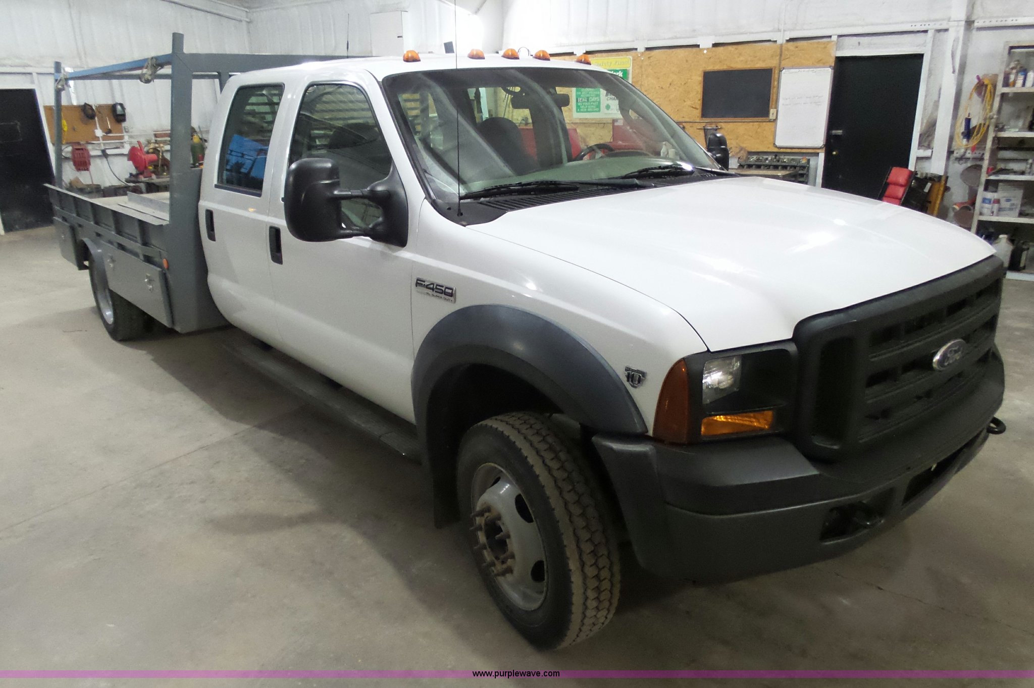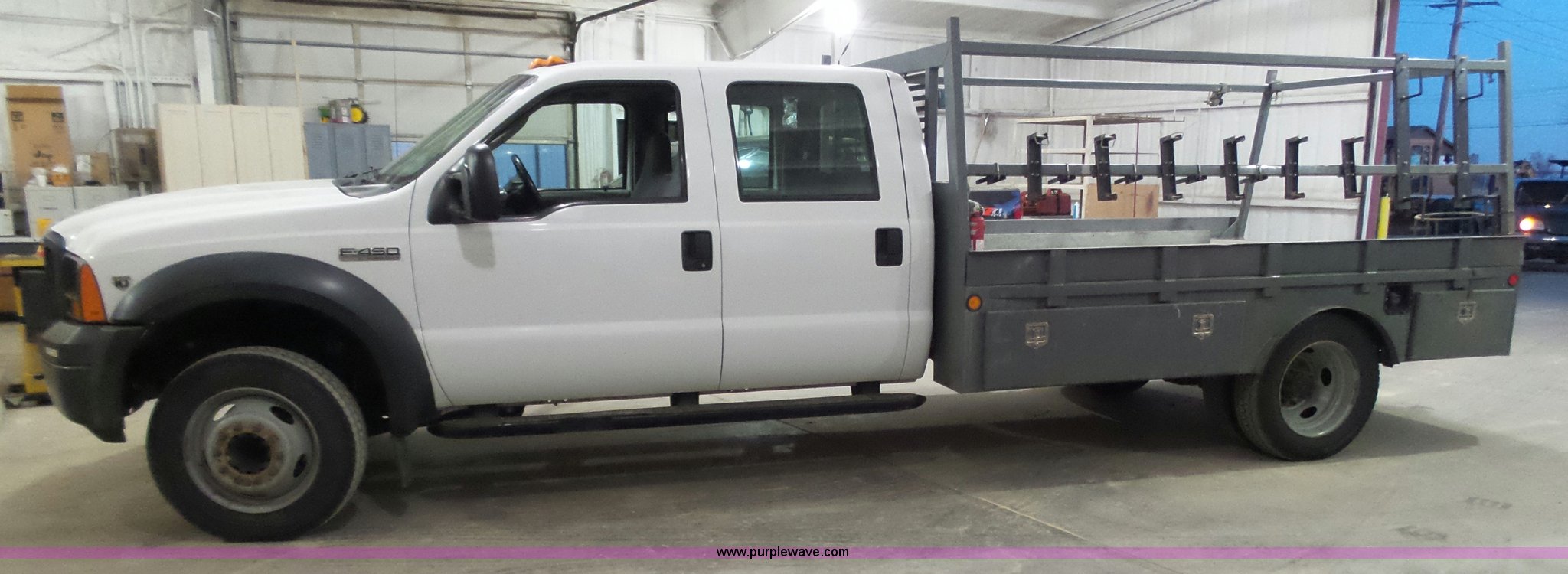 Purple Wave is selling a used Flat Bed Truck in Kansas. This item is a 2006 Ford F450 Super Duty XL SuperCrew flatbed truck with the following: 96,770 miles on odometer, 2,032 hours on meter, 6.8L V10 SOHC 30V gas engine, Five speed manual transmission, AC and heat, Tilt, Cruise, AM/FM, Manual windows and locks, Cloth interior, Front tow hooks, Running boards, BCI flatbed, 11'L x 96"W, (4) toolboxes, Receiver hitch, Trailer wiring, 255/70R19.5 tires, Interior/exterior cosmetic damage, Seat torn, Paint chipped, Scratches, Dents