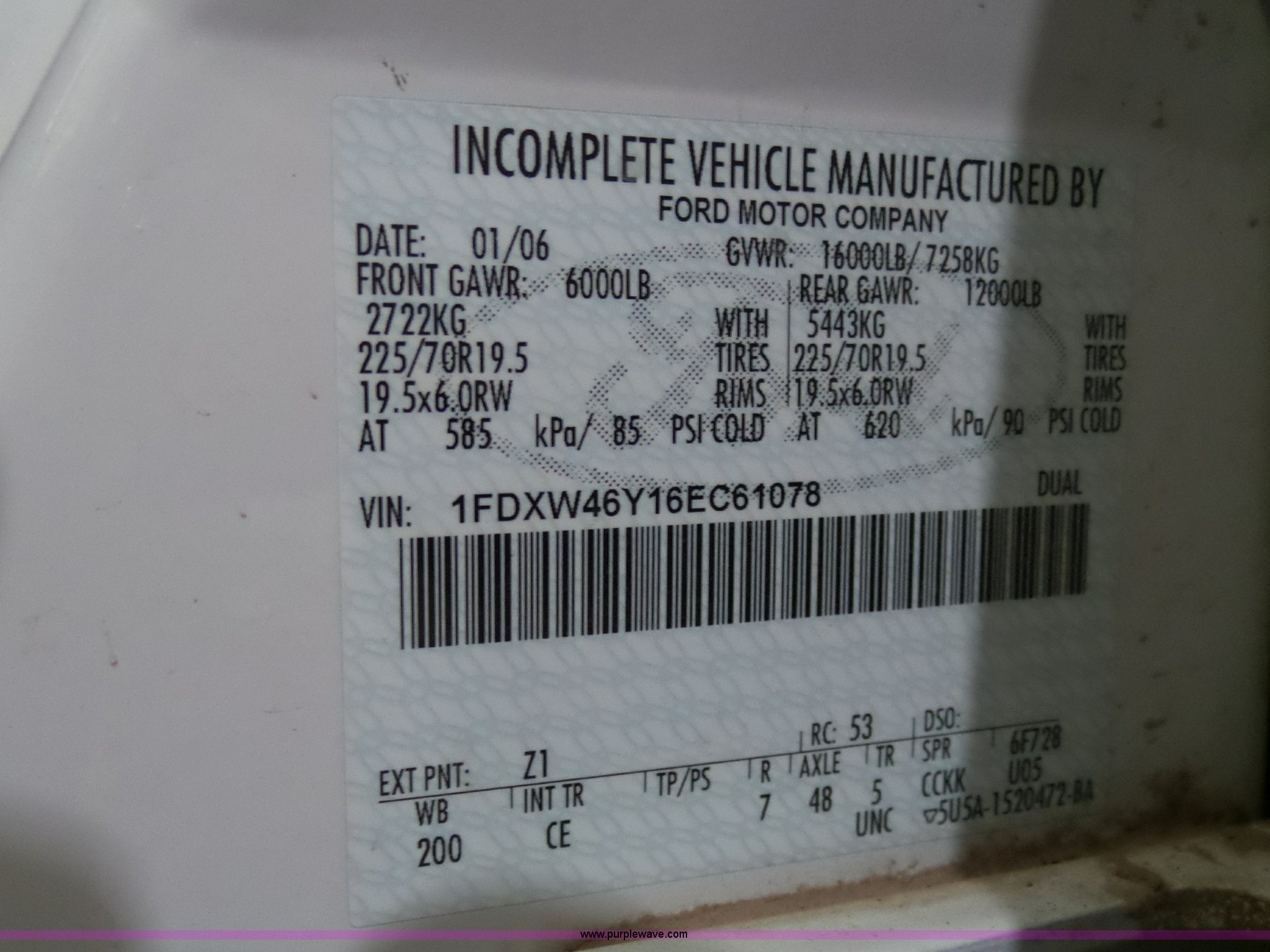 2006 Ford F450 Super Duty XL SuperCrew flatbed truck. 96,770 miles on odometer, 2,032 hours on meter, 6.8L V10 SOHC 30V gas engine, Five speed manual transmission, AC and heat, Tilt, Cruise, AM/FM, Manual windows and locks, Cloth interior, Front tow hooks, Running boards, BCI flatbed 11'L x 96"W, (4) toolboxes, Receiver hitch, Trailer wiring, 255/70R19.5 tires, Interior/exterior cosmetic damage, Seat torn, Paint chipped, Scratches, Dents. 1FDXW46Y16EC61078. McBride Construction Inc.. 613 E 11th. Hugoton, KS 67951