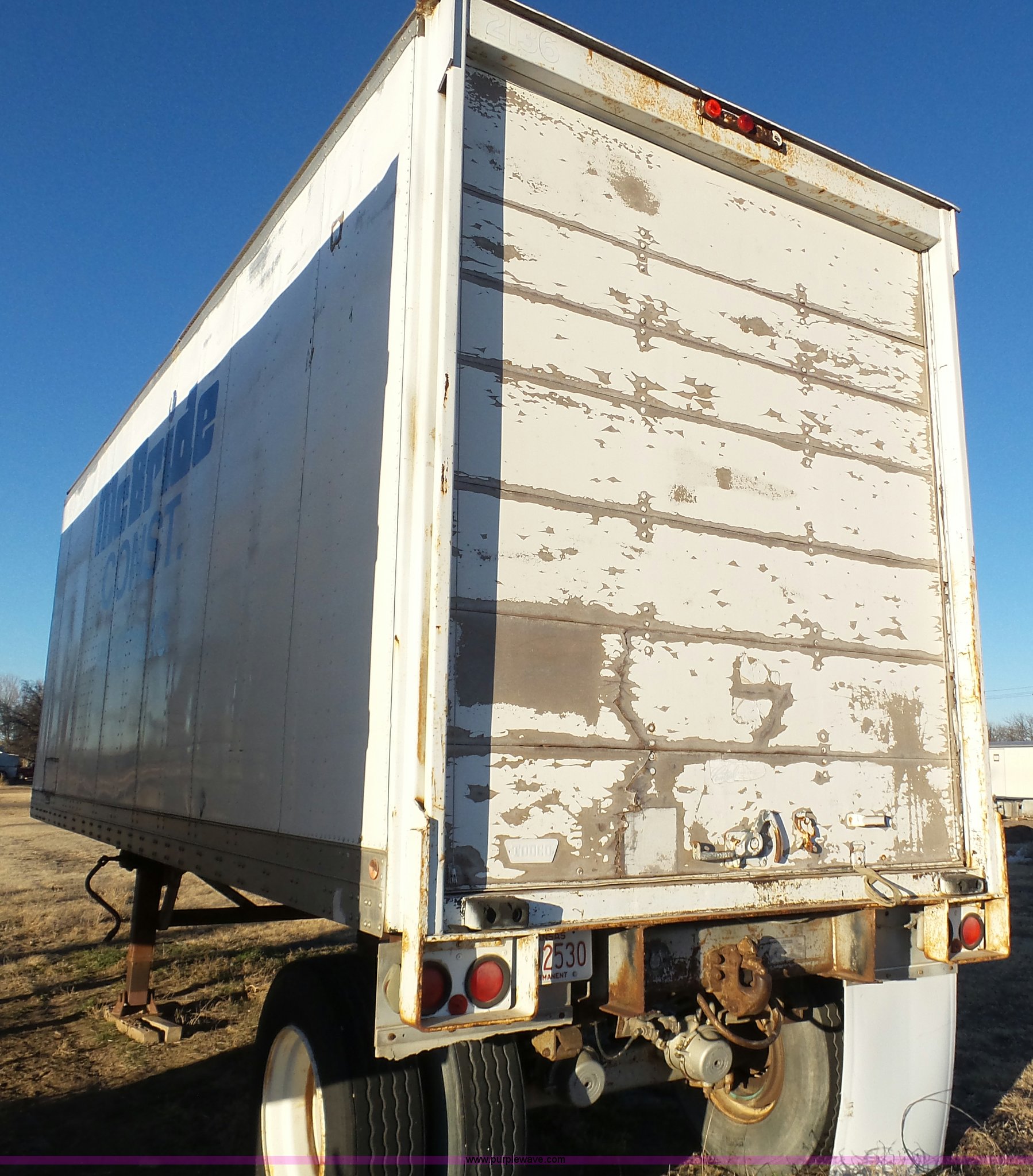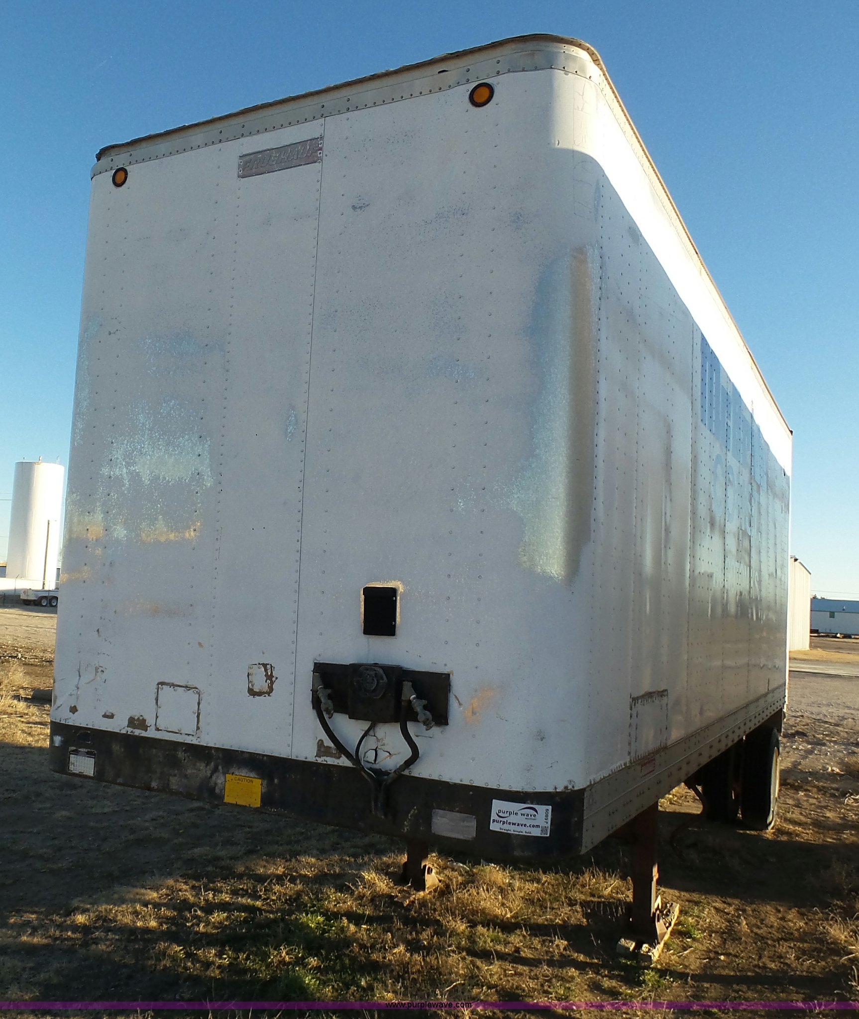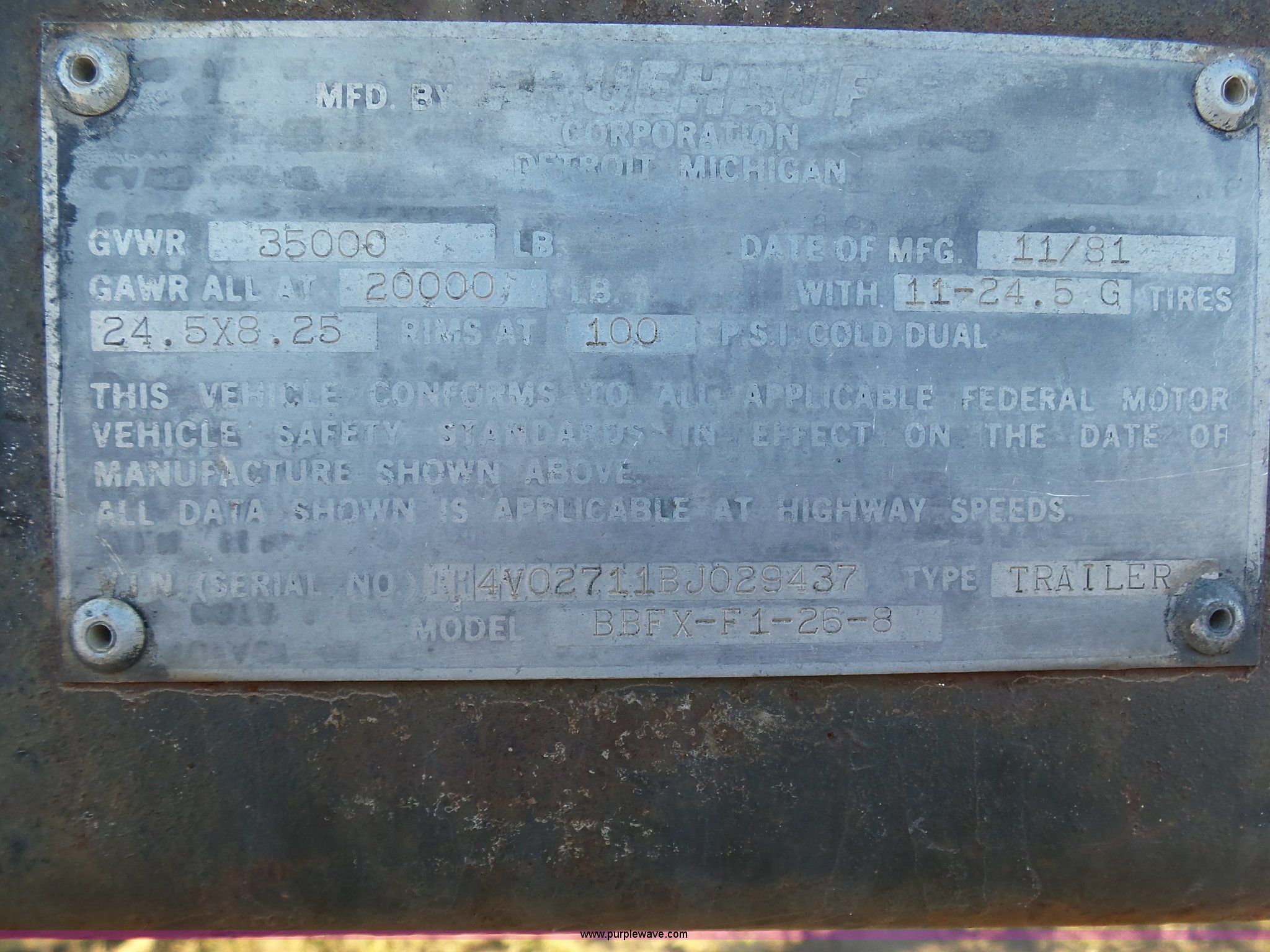 Purple Wave is selling a used Enclosed Cargo Trailer in Kansas. This item is a 1982 Fruehauf BBFX-F1-26-8 enclosed cargo trailer with the following: 26'7'L x 96"W overall, 26'L body, Wood deck, Roll up door, Insulation included, Rear pintle hitch, Rear air hookups, Spring suspension, Air brakes, Steel wheels, 295/75R22.5 tires, GVWR 35,000 lbs, GAWR 20,000 lbs, Tires weathered, Right rear marker lamp broken, Left mud flap missing, Rear top clearance light broken, Dents, Scratches, Paint worn