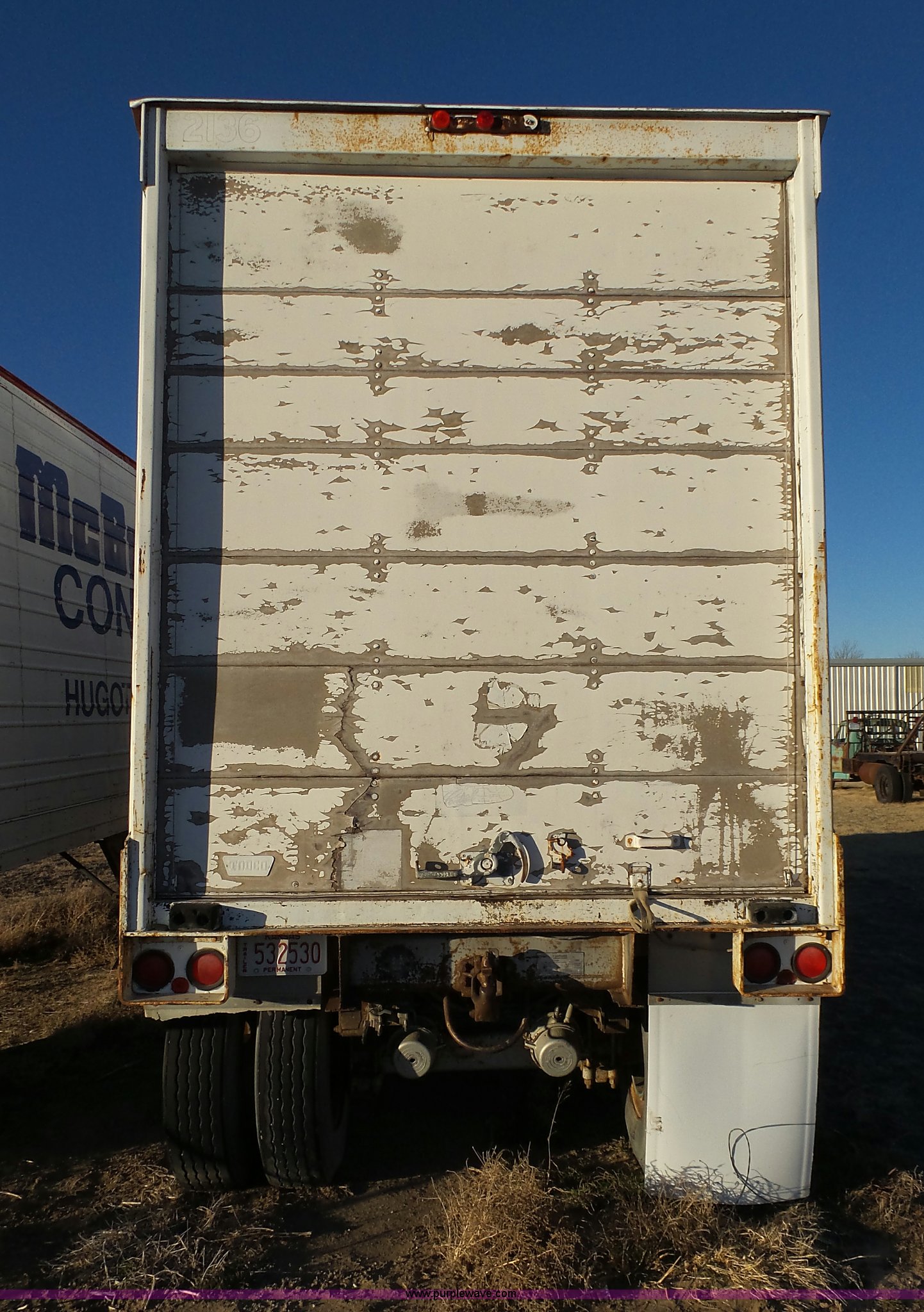 1982 Fruehauf BBFX-F1-26-8 enclosed cargo trailer. 26'7'L x 96"W overall, 26'L body, Wood deck, Roll up door, Insulation included, Rear pintle hitch, Rear air hookups, Spring suspension, Air brakes, Steel wheels, 295/75R22.5 tires, GVWR 35,000 lbs, GAWR 20,000 lbs, Tires weathered, Right rear marker lamp broken, Left mud flap missing, Rear top clearance light broken, Dents, Scratches, Paint worn. 1H4V02711BJ029437. McBride Construction Inc.. 1200 S Washington. Hugoton, KS 67951