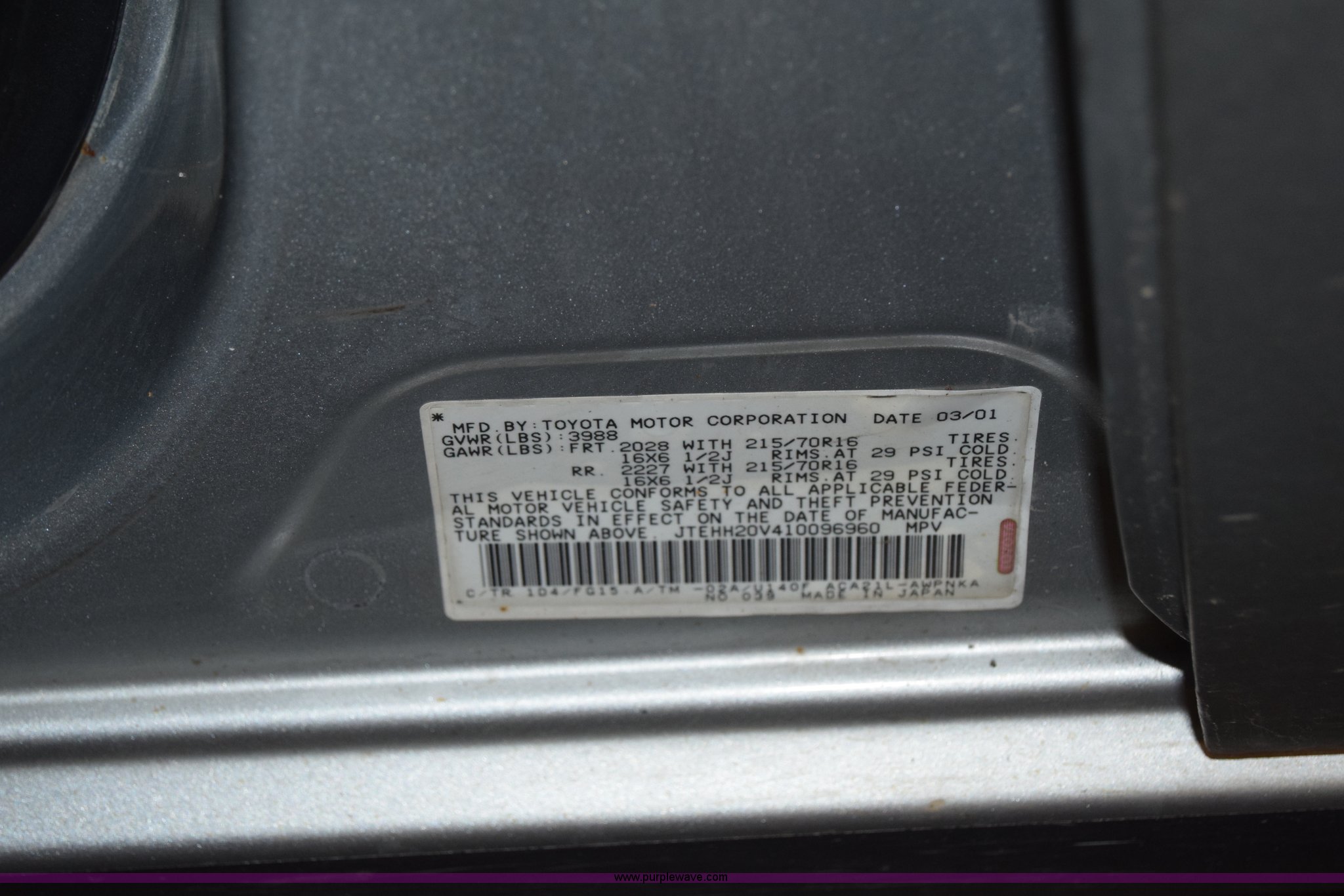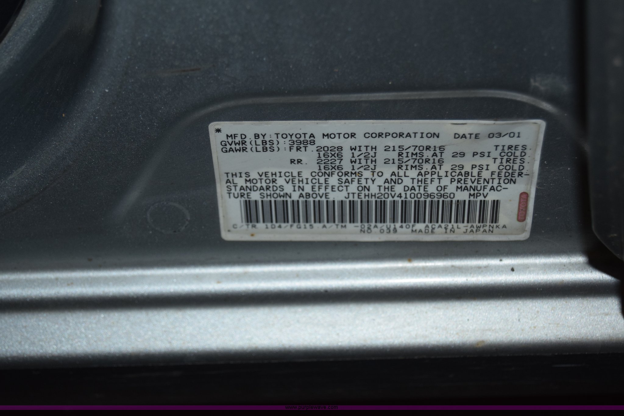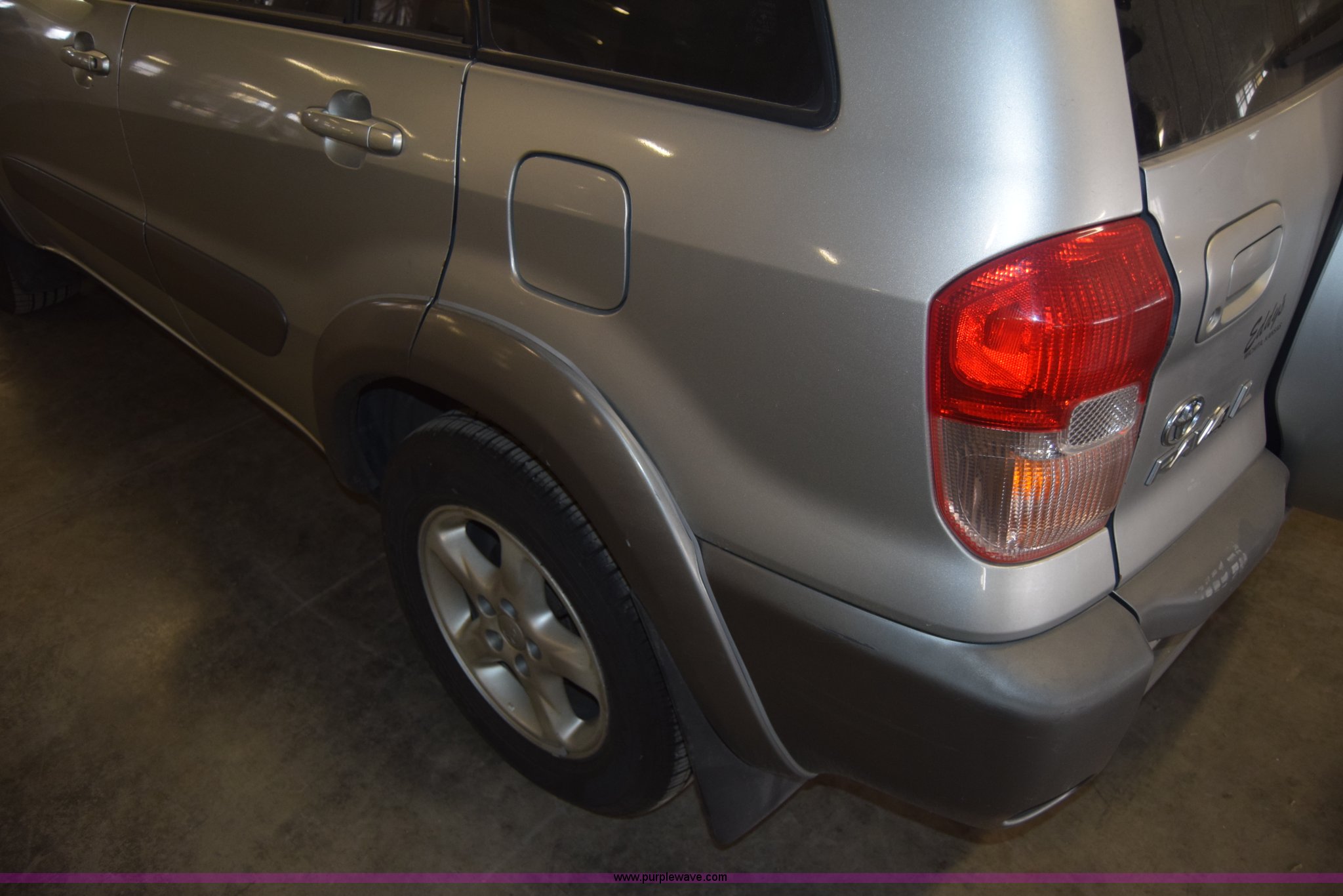 Purple Wave is selling a used Passenger Vehicle in Kansas. This item is a 2001 Toyota RAV4 SUV with the following: 302,178 miles on odometer, 2.0L L4 DOHC gas engine, Automatic transmission, AC and heat, AM/FM/CD, Power windows and locks, Cloth interior, 235/60R16 tires, Interior/exterior cosmetic damage, Dents and scratches