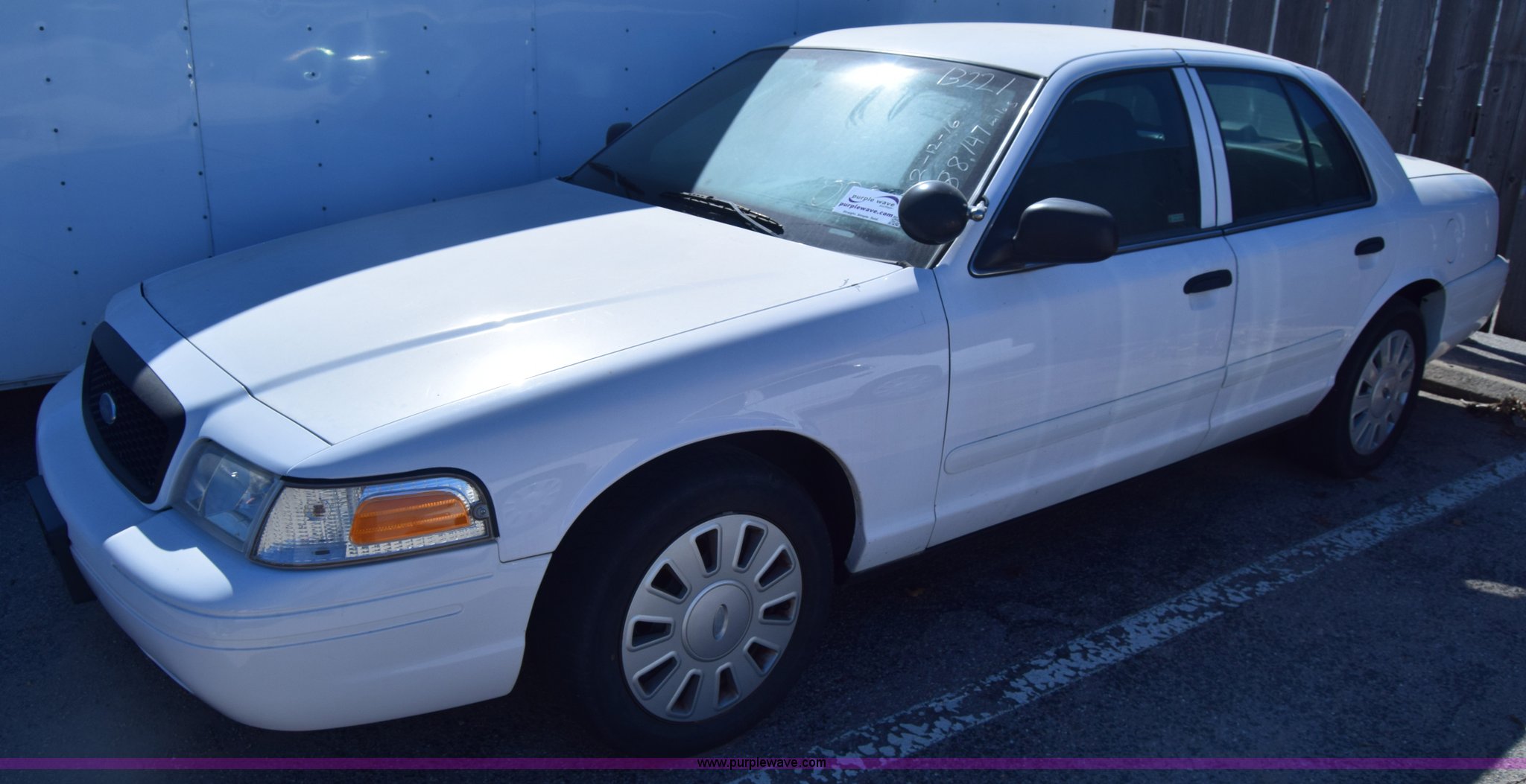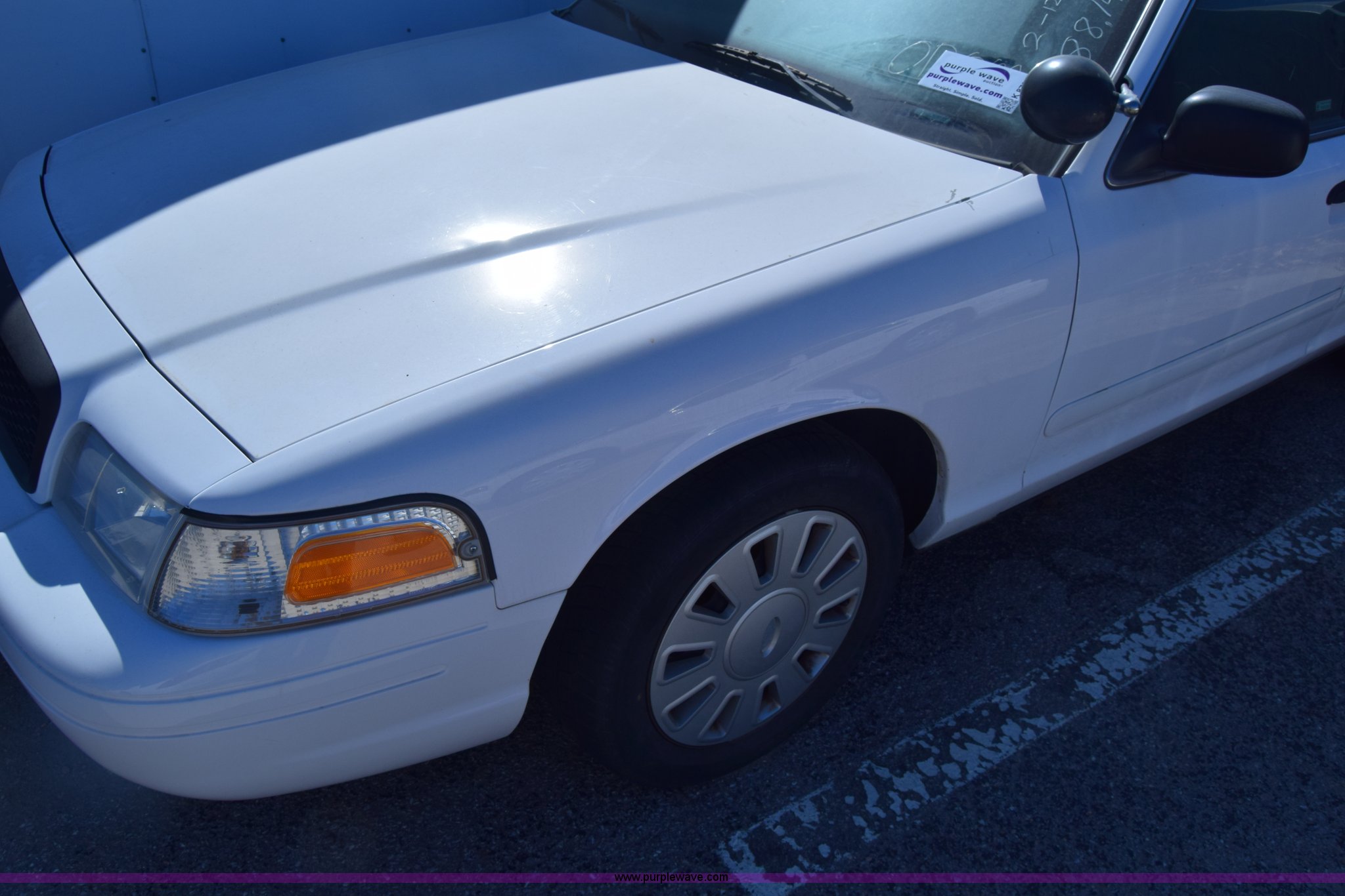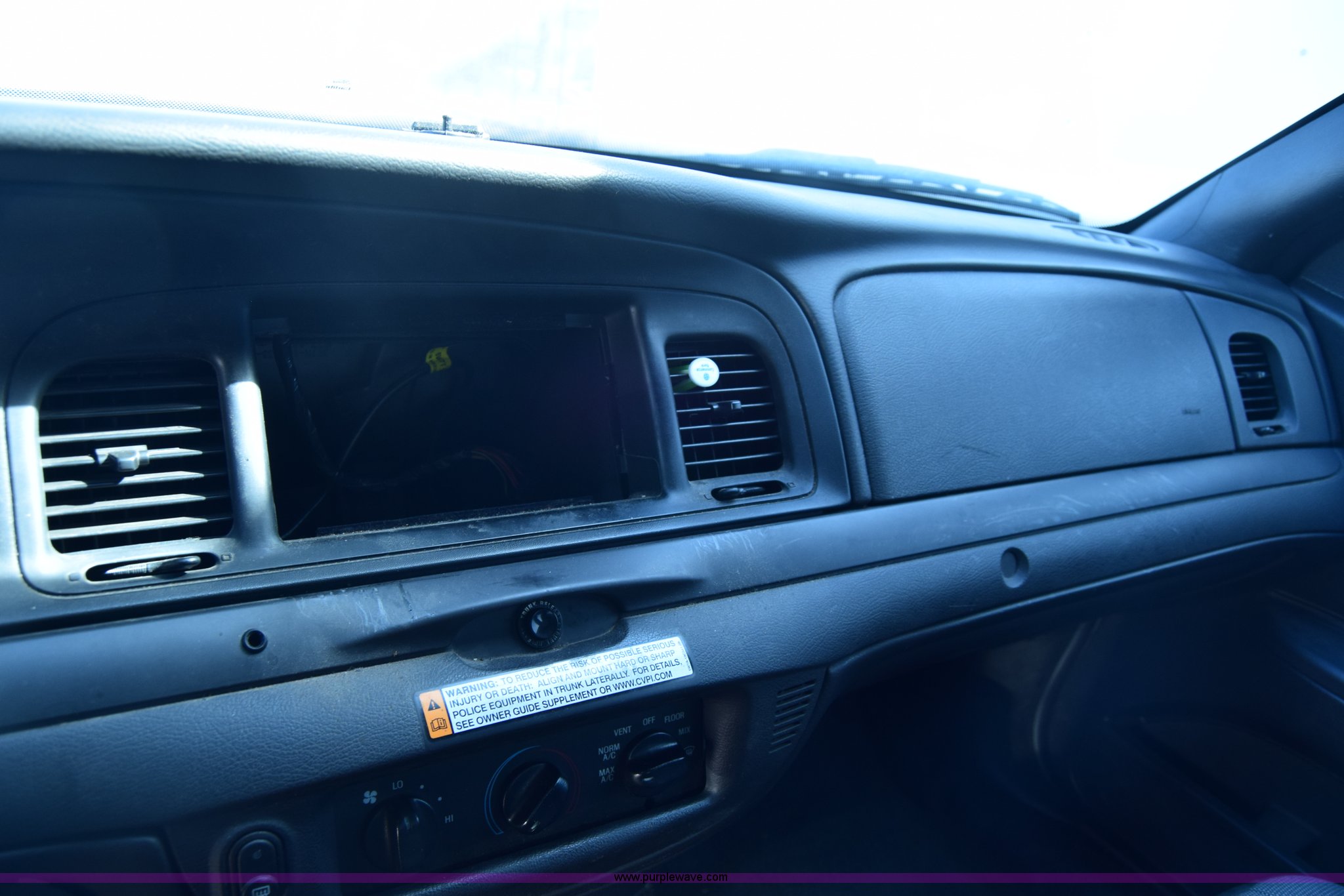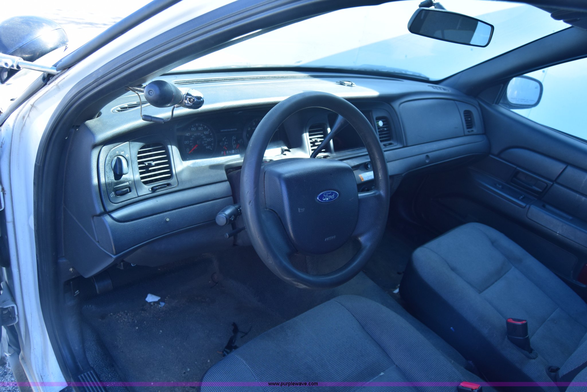 Purple Wave is selling a used Passenger Vehicle in Kansas. This item is a 2008 Ford Crown Victoria Police Interceptor with the following: Unknown miles on odometer, Odometer inoperable, 4.6L V8 SOHC 16V FFV gas engine, Automatic transmission, AC and heat, Tilt, Cruise, Power windows, locks, and mirrors, Cloth interior, 235/55R17 tires, Interior/exterior cosmetic damage, Dents, Scratches, Port holes, Weak battery, Stereo has been removed, Paint peeling
