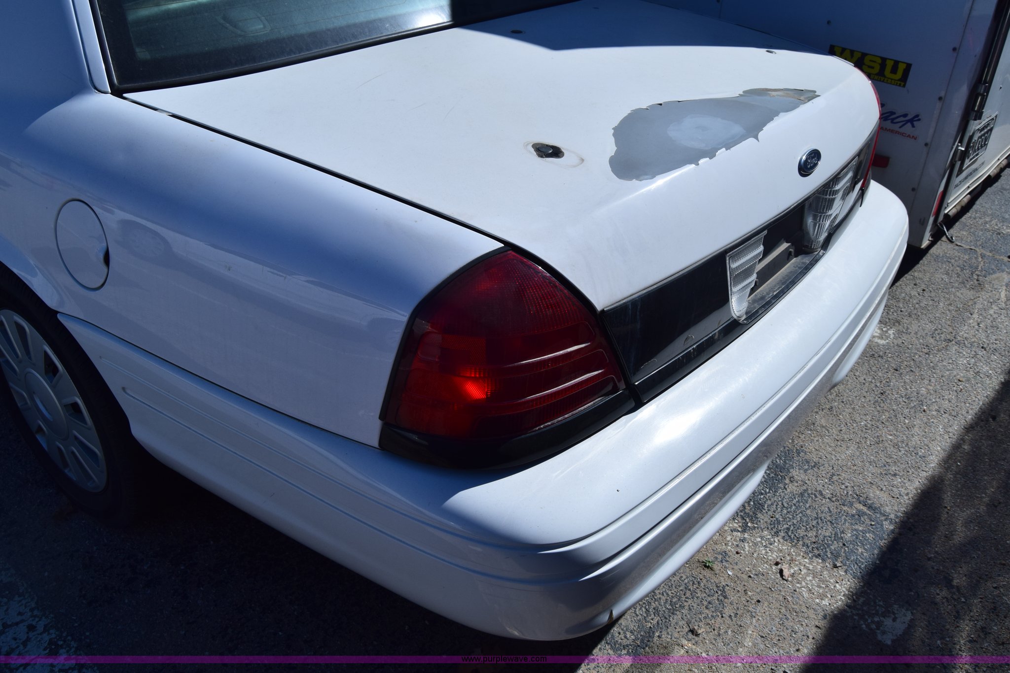 2008 Ford Crown Victoria Police Interceptor. Unknown miles on odometer Odometer inoperable, 4.6L V8 SOHC 16V FFV gas engine, Automatic transmission, AC and heat, Tilt, Cruise, Power windows, locks, and mirrors, Cloth interior, 235/55R17 tires, Interior/exterior cosmetic damage, Dents, Scratches, Port holes, Weak battery, Stereo has been removed, Paint peeling. 2FAFP71V58X178112. Wichita State University Physical Plant. 1845 N Fairmount. Wichita, KS 67260