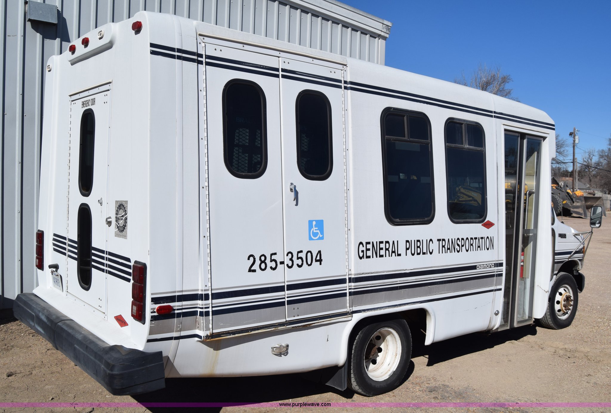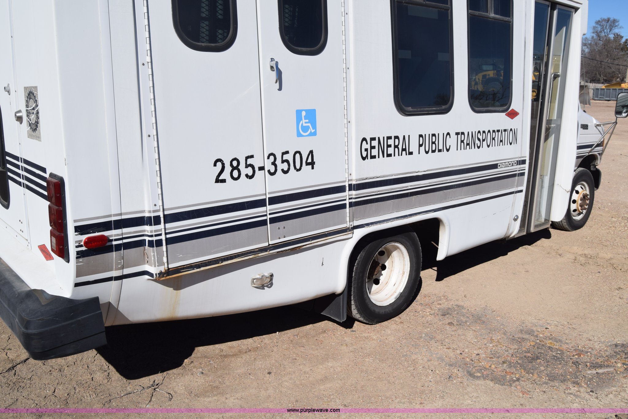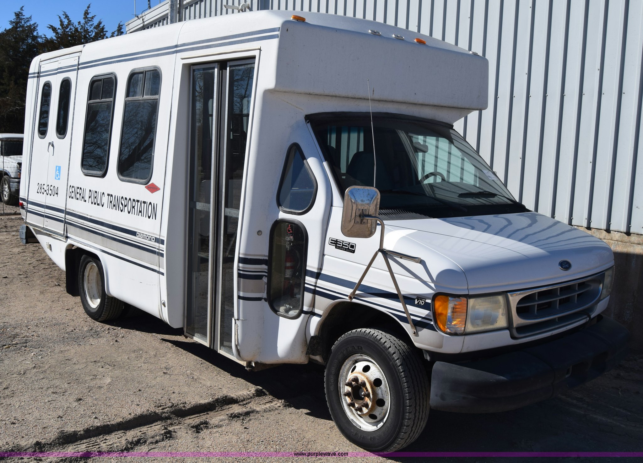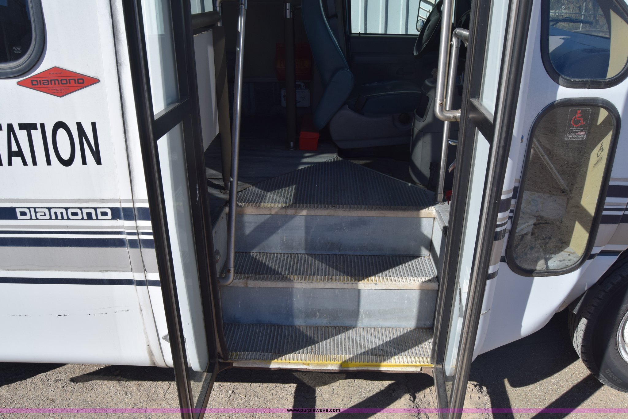 Purple Wave is selling a used Bus in Kansas. This item is a 2002 Ford 800 Diamond bus with the following: 149,304 miles on odometer, 6.8L V10 SOHC 20V gas engine, Automatic transmission, Heat, Tilt, Cruise, AM/FM/cassette, Manual windows and locks, 12 passenger capacity, Wheelchair lift, Rear, ceiling, and side egress, Carrier AC unit, 9'4" bus height, 225/75R16 tires, Interior/exterior cosmetic damage