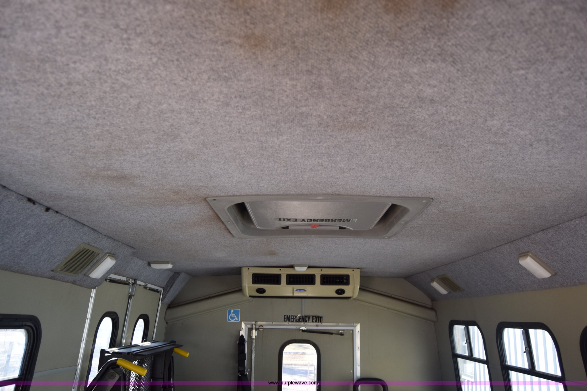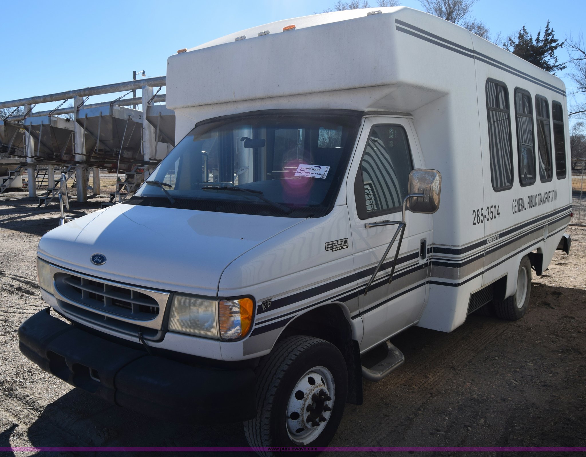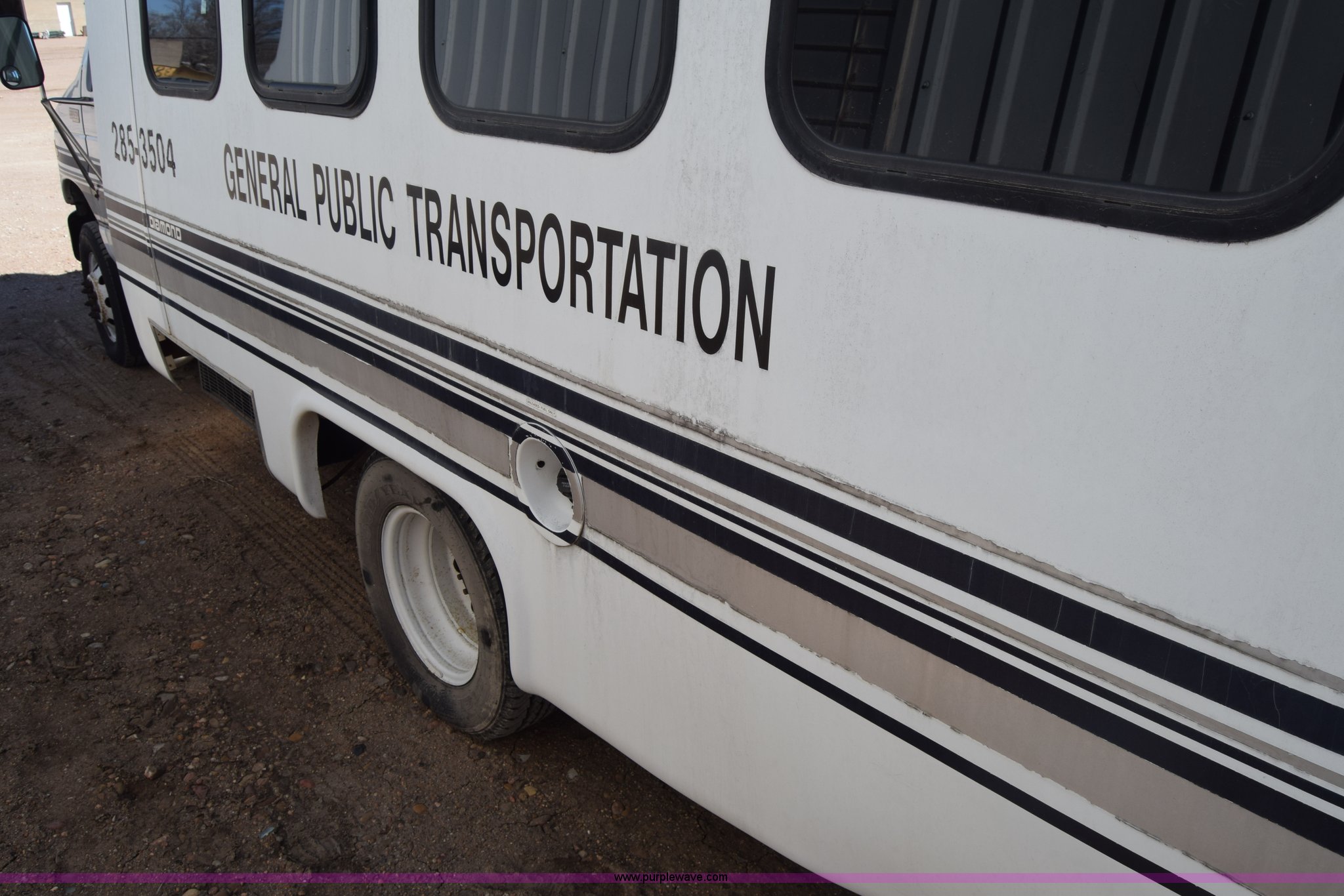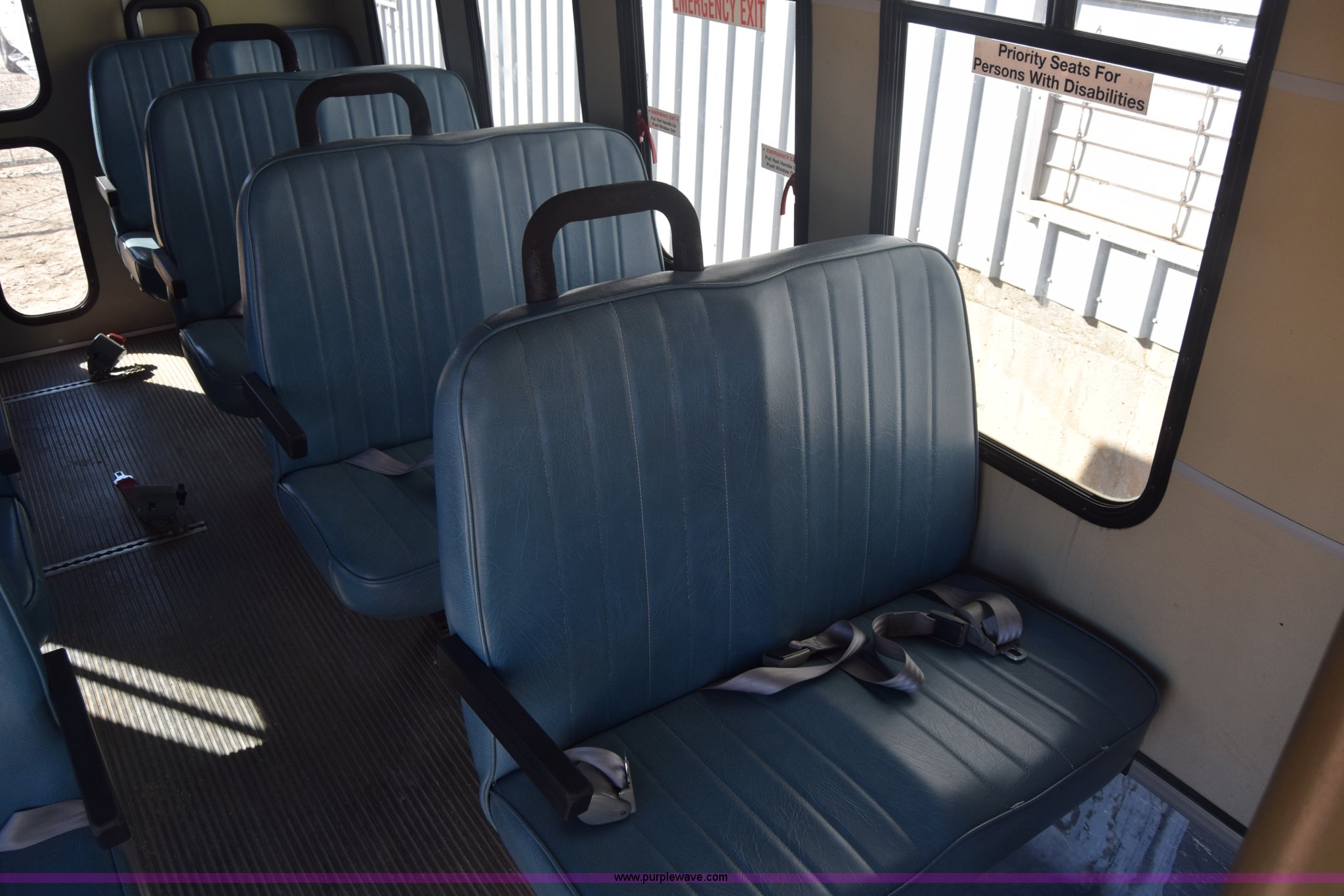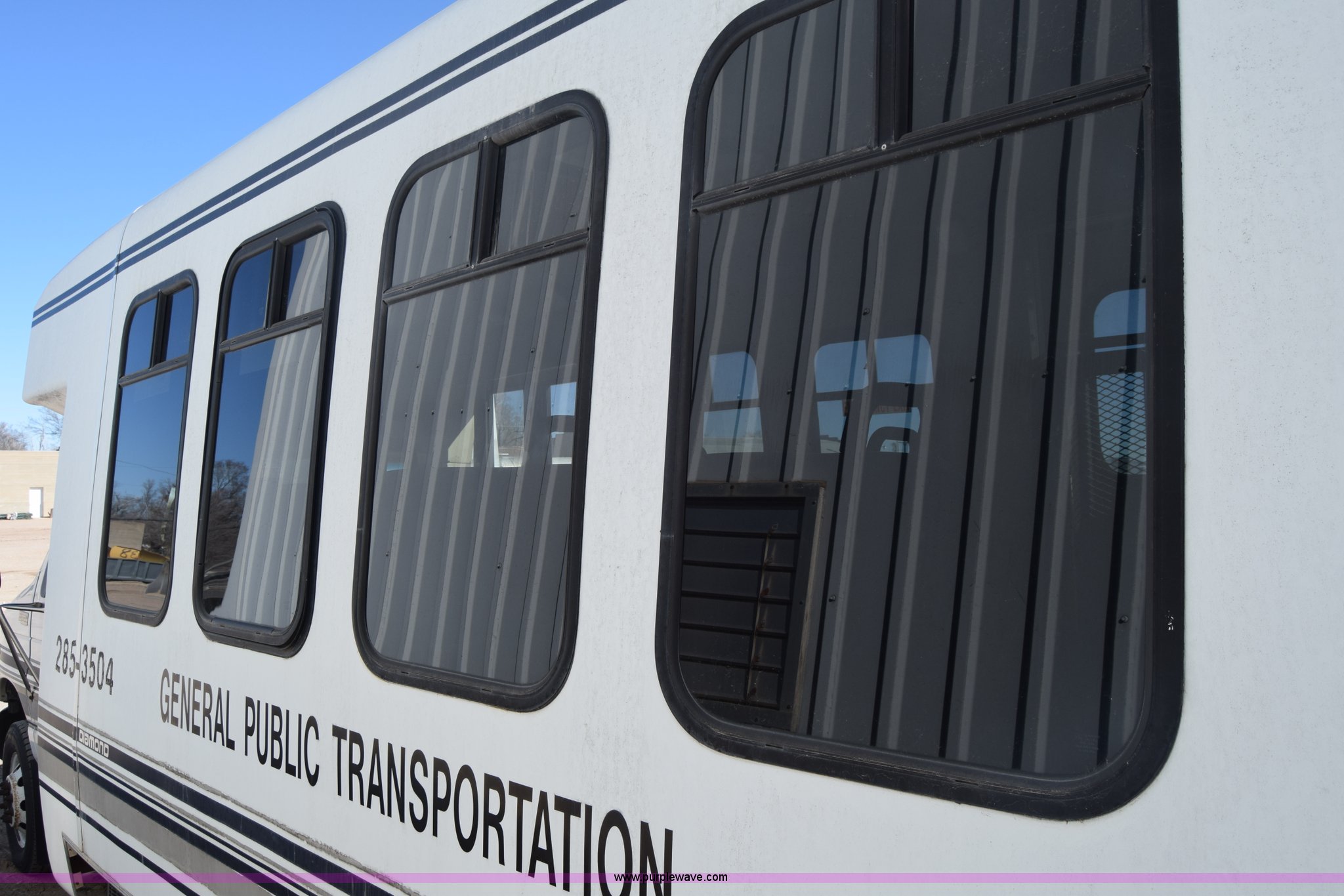Purple Wave is selling a used Bus in Kansas. This item is a 2002 Ford 800 Diamond bus with the following: 149,304 miles on odometer, 6.8L V10 SOHC 20V gas engine, Automatic transmission, Heat, Tilt, Cruise, AM/FM/cassette, Manual windows and locks, 12 passenger capacity, Wheelchair lift, Rear, ceiling, and side egress, Carrier AC unit, 9'4" bus height, 225/75R16 tires, Interior/exterior cosmetic damage