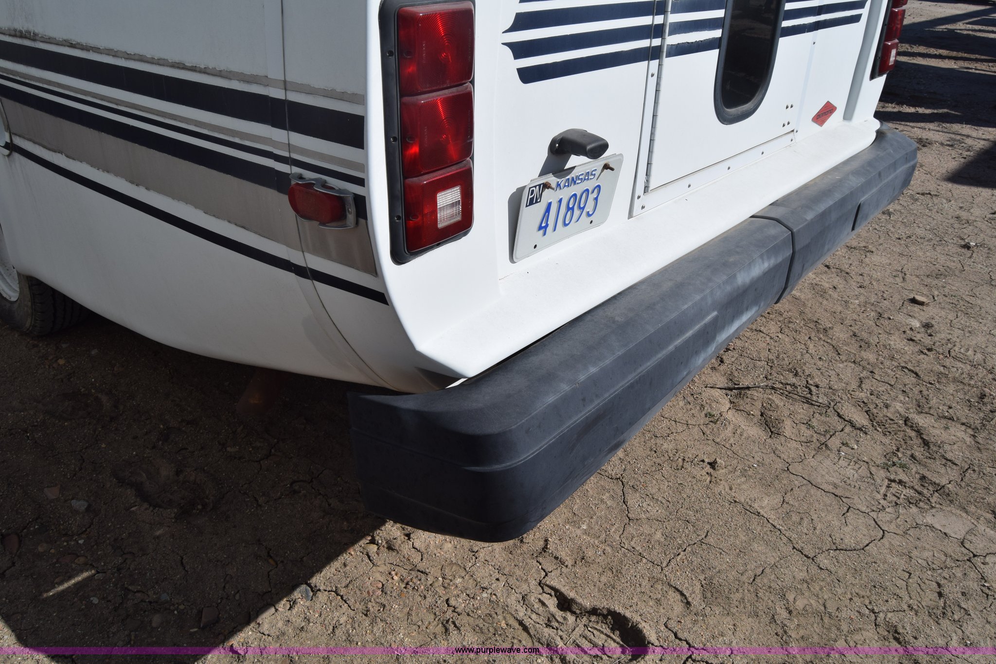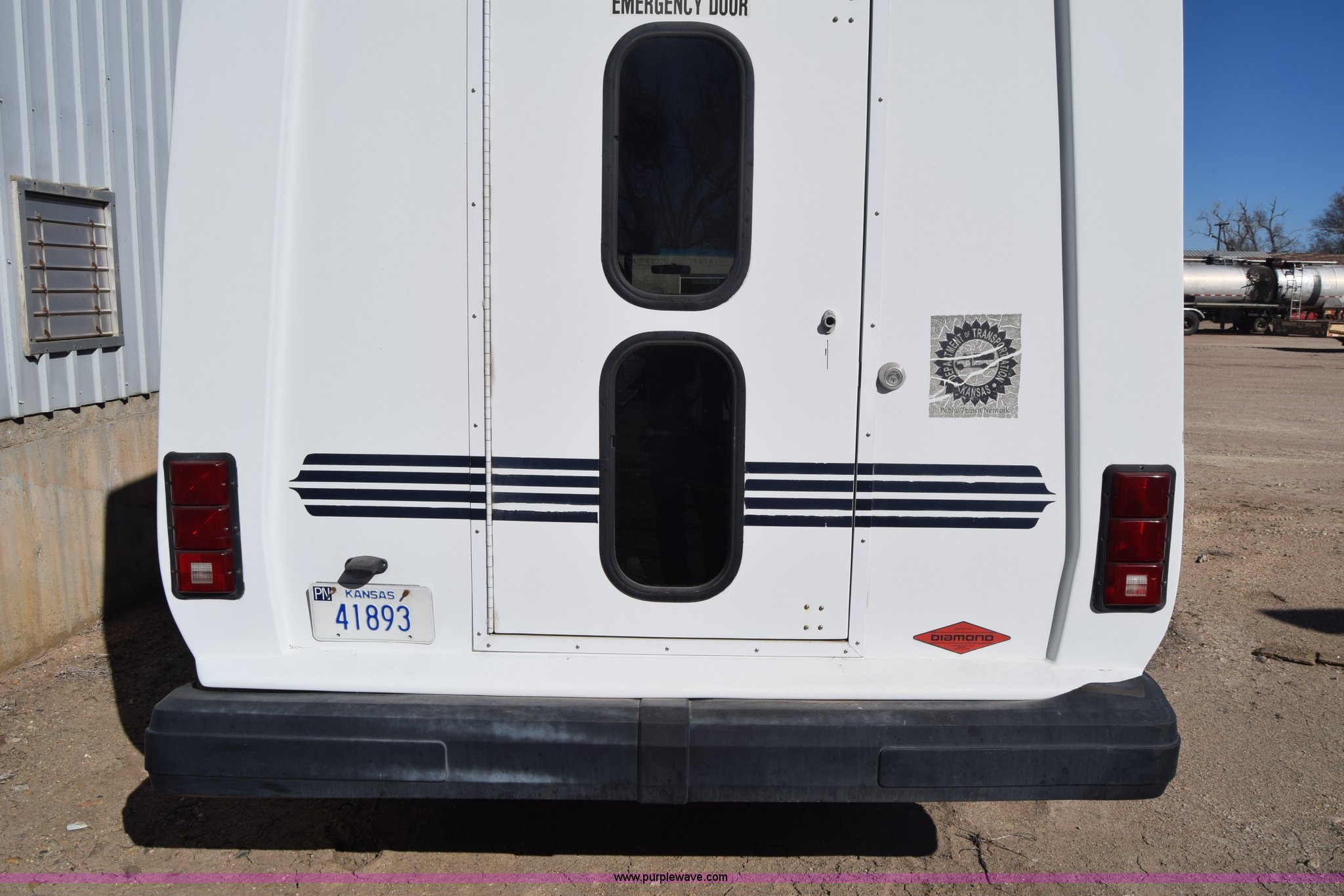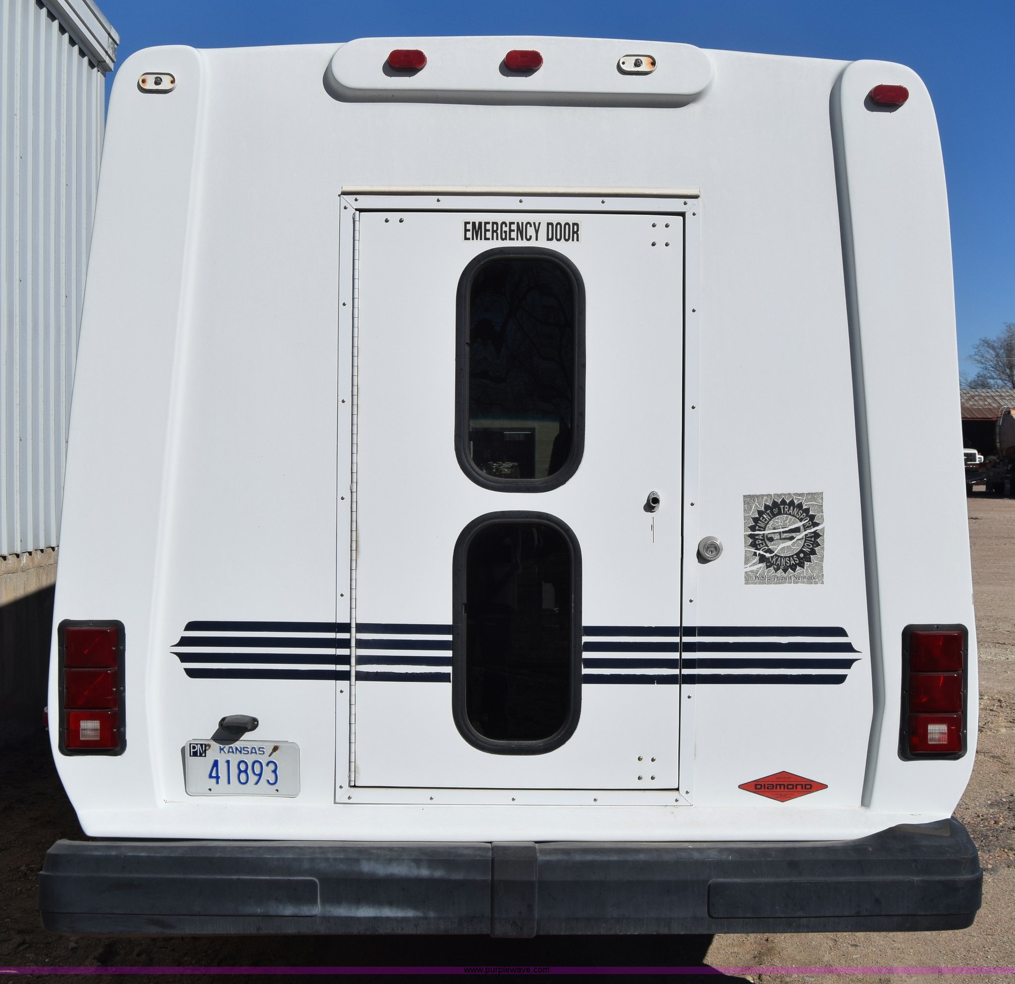 2002 Ford 800 Diamond bus. 149,304 miles on odometer, 6.8L V10 SOHC 20V gas engine, Automatic transmission, Heat, Tilt, Cruise, AM/FM/cassette, Manual windows and locks, 12 passenger capacity, Wheelchair lift, Rear, ceiling, and side egress, Carrier AC unit, 9'4" bus height, 225/75R16 tires, Interior/exterior cosmetic damage. 1FDWE35SX2HB27975. Pawnee County. 615 E 10th St. Larned, KS 67550