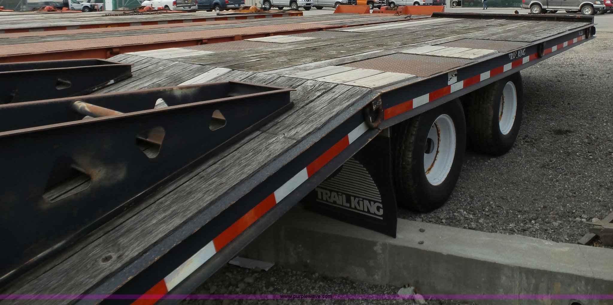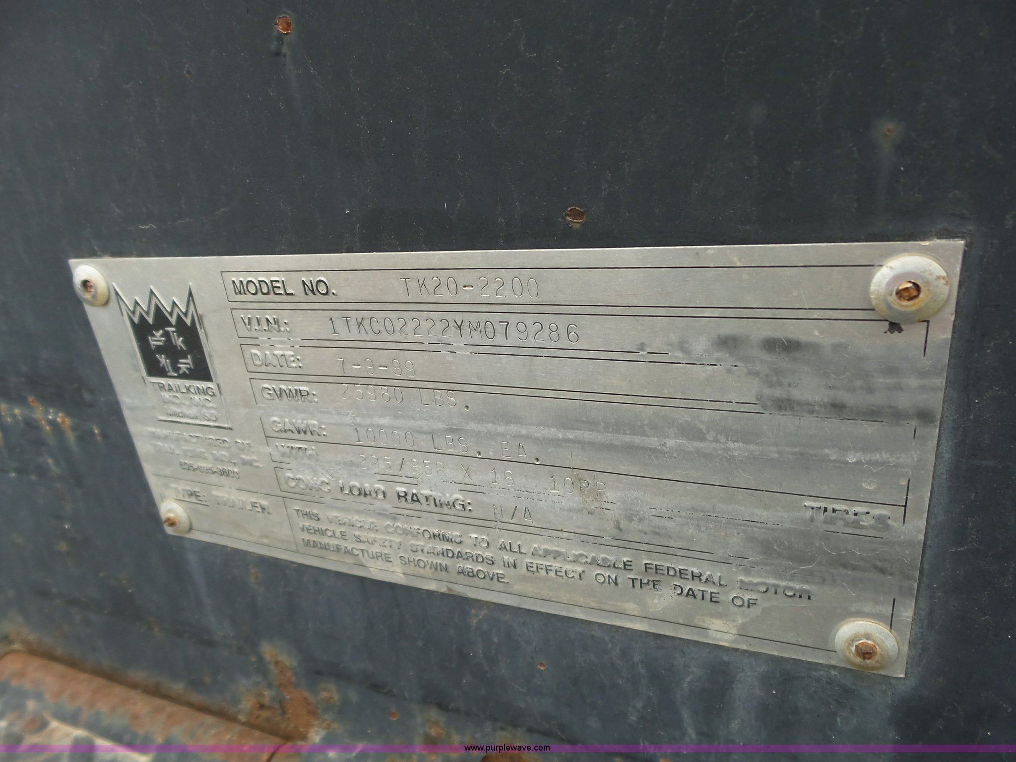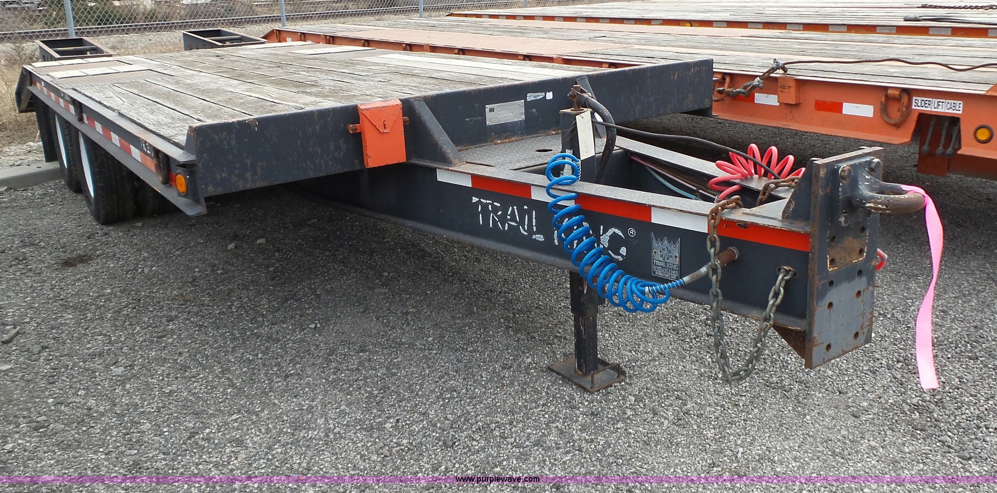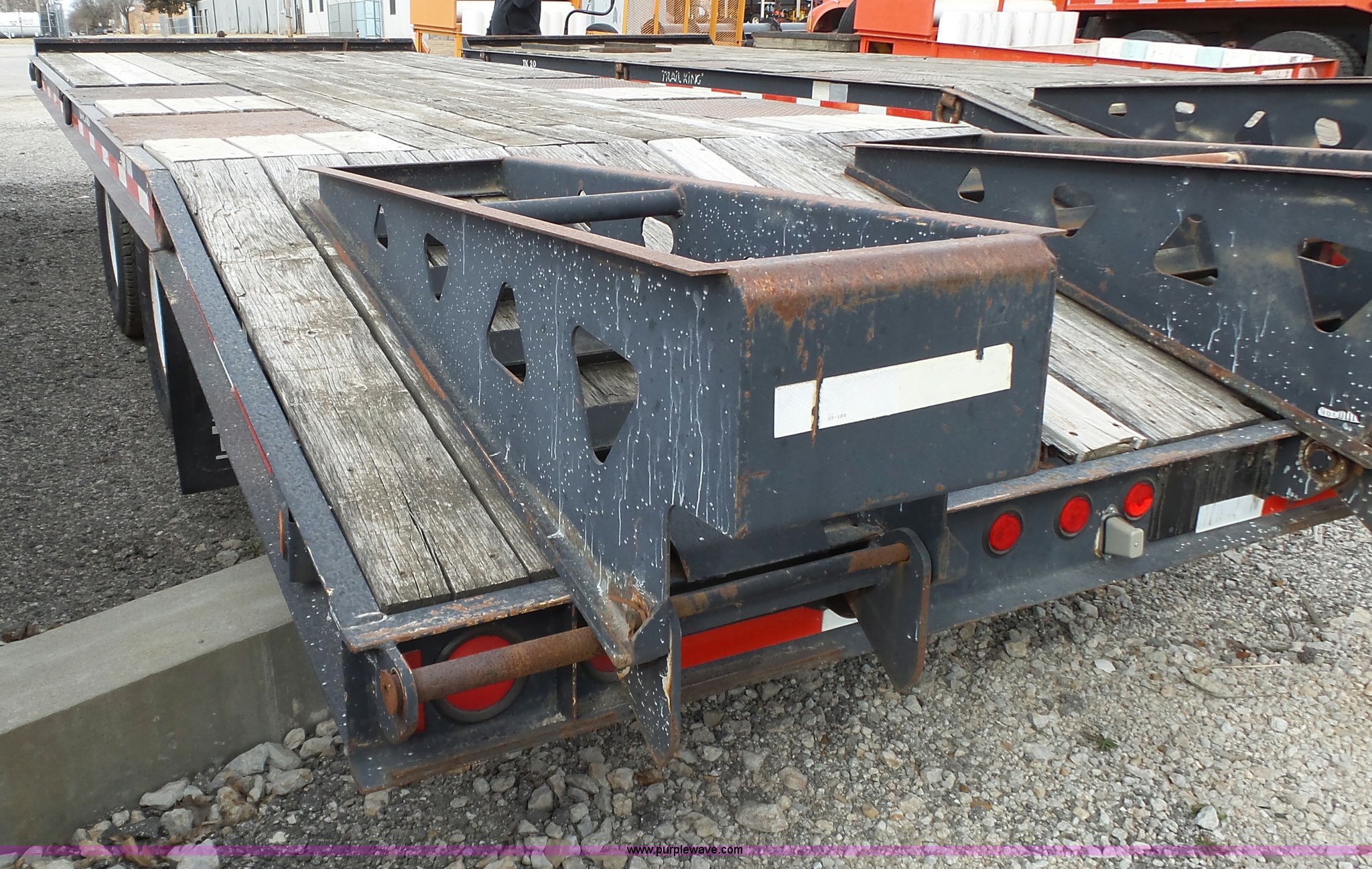 Purple Wave is selling a used Equip. Trailer in Kansas. This item is a 2000 Trail King TK20-2200 equipment trailer with the following: 22' overall length, Manual ramps, Dovetail, Wood deck, D-ring tie downs, Single leg landing gear, Adjustable pintle hitch, Tandem axle, Spring suspension, Air brakes, 235/85R15 tires, GVWR 25,980 lbs, GAWR 10,000 lbs, Brakes stick, Tag light needs replaced, KDOT ID 482-4019