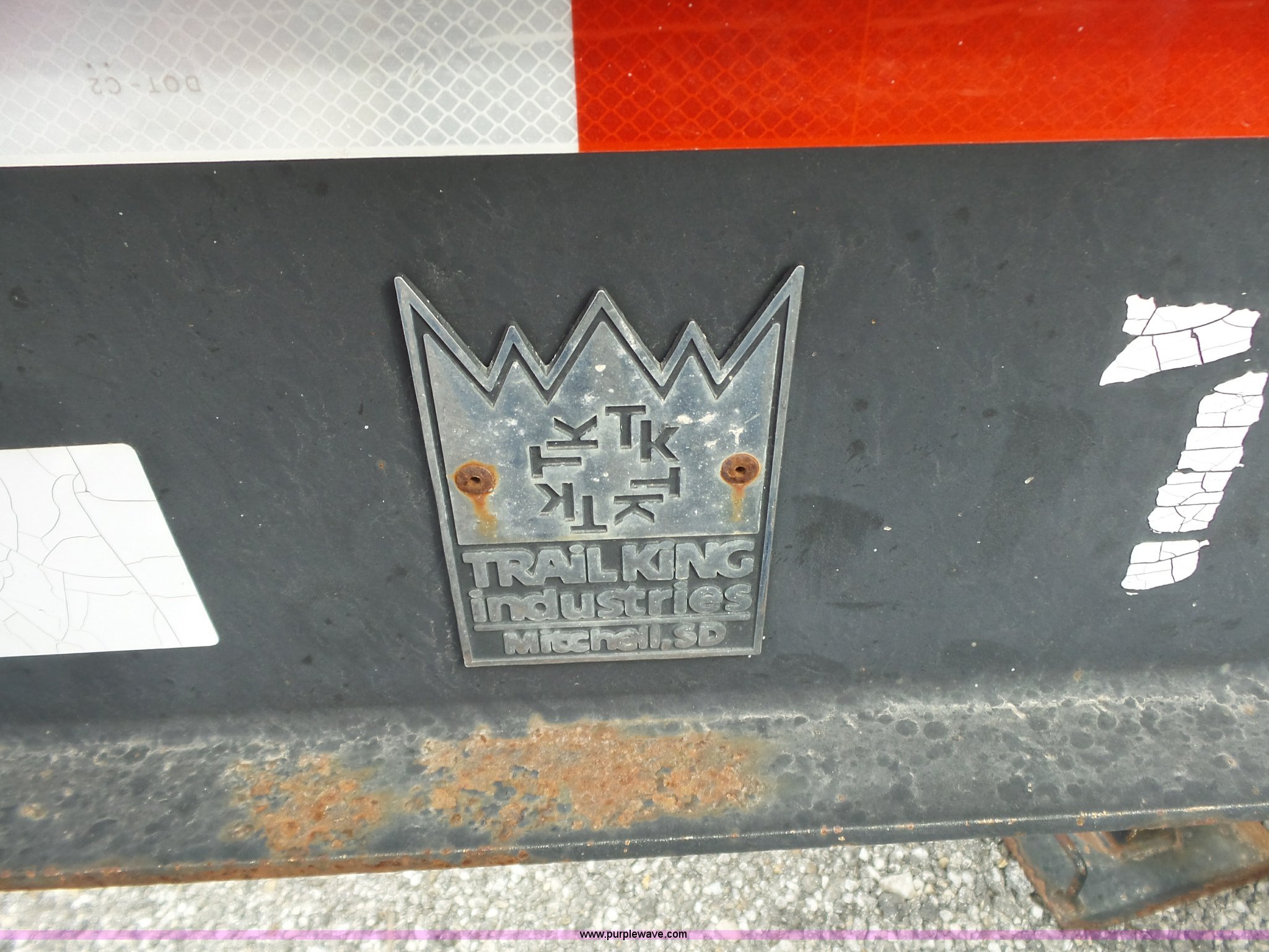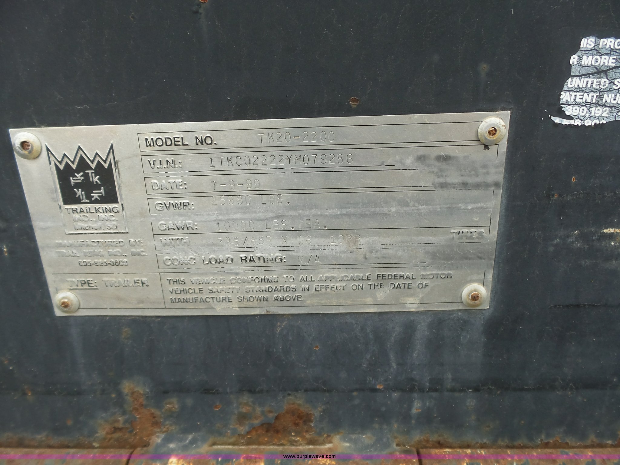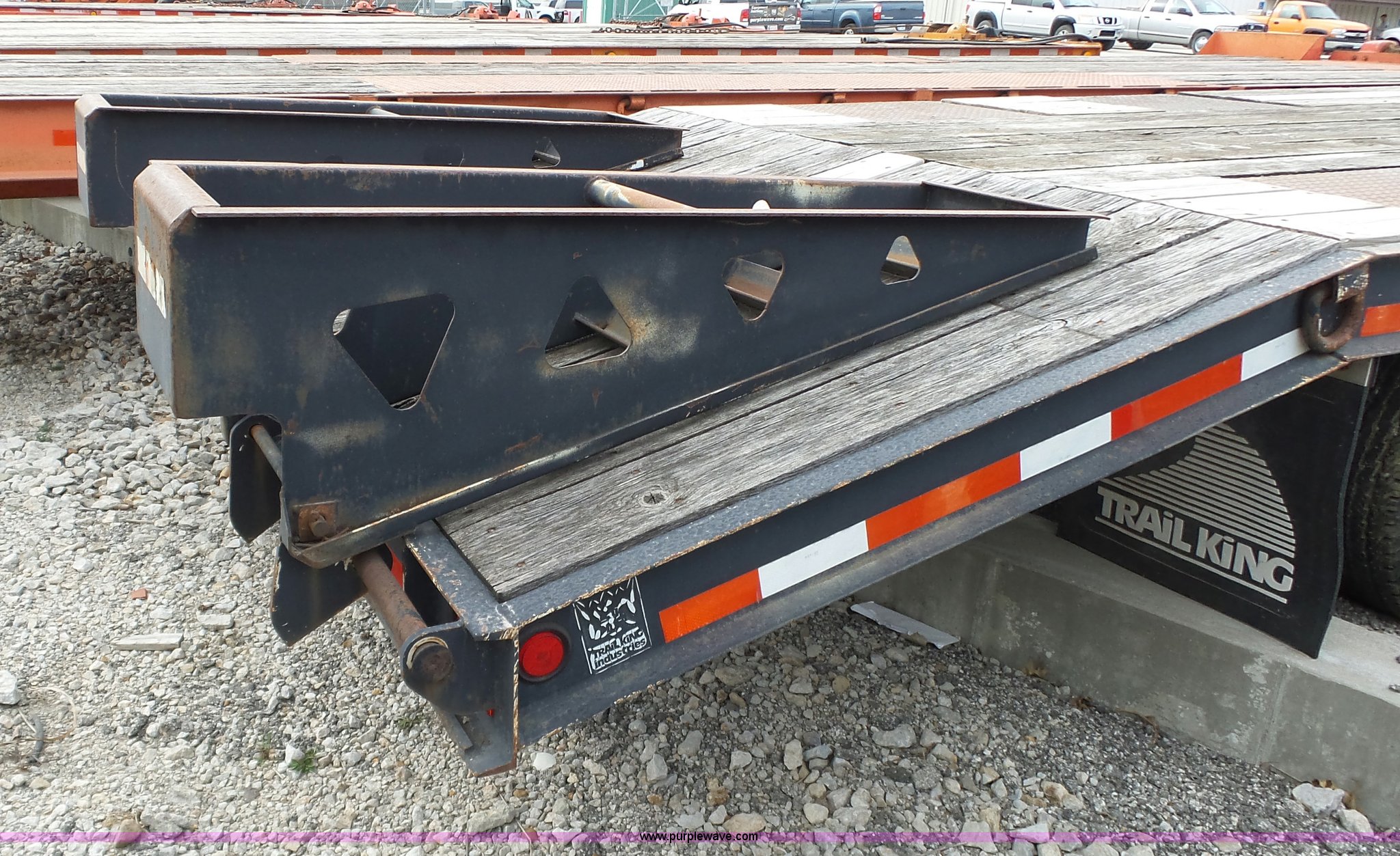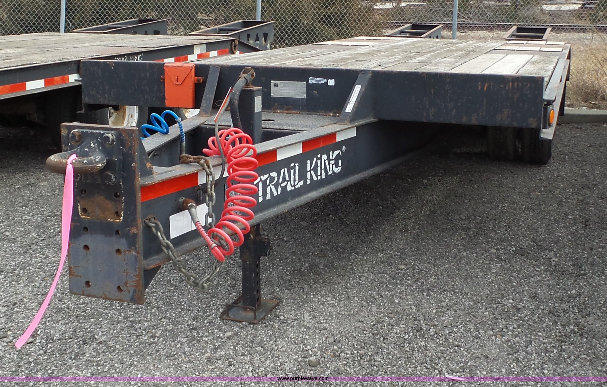 Purple Wave is selling a used Equip. Trailer in Kansas. This item is a 2000 Trail King TK20-2200 equipment trailer with the following: 22' overall length, Manual ramps, Dovetail, Wood deck, D-ring tie downs, Single leg landing gear, Adjustable pintle hitch, Tandem axle, Spring suspension, Air brakes, 235/85R15 tires, GVWR 25,980 lbs, GAWR 10,000 lbs, Brakes stick, Tag light needs replaced, KDOT ID 482-4019