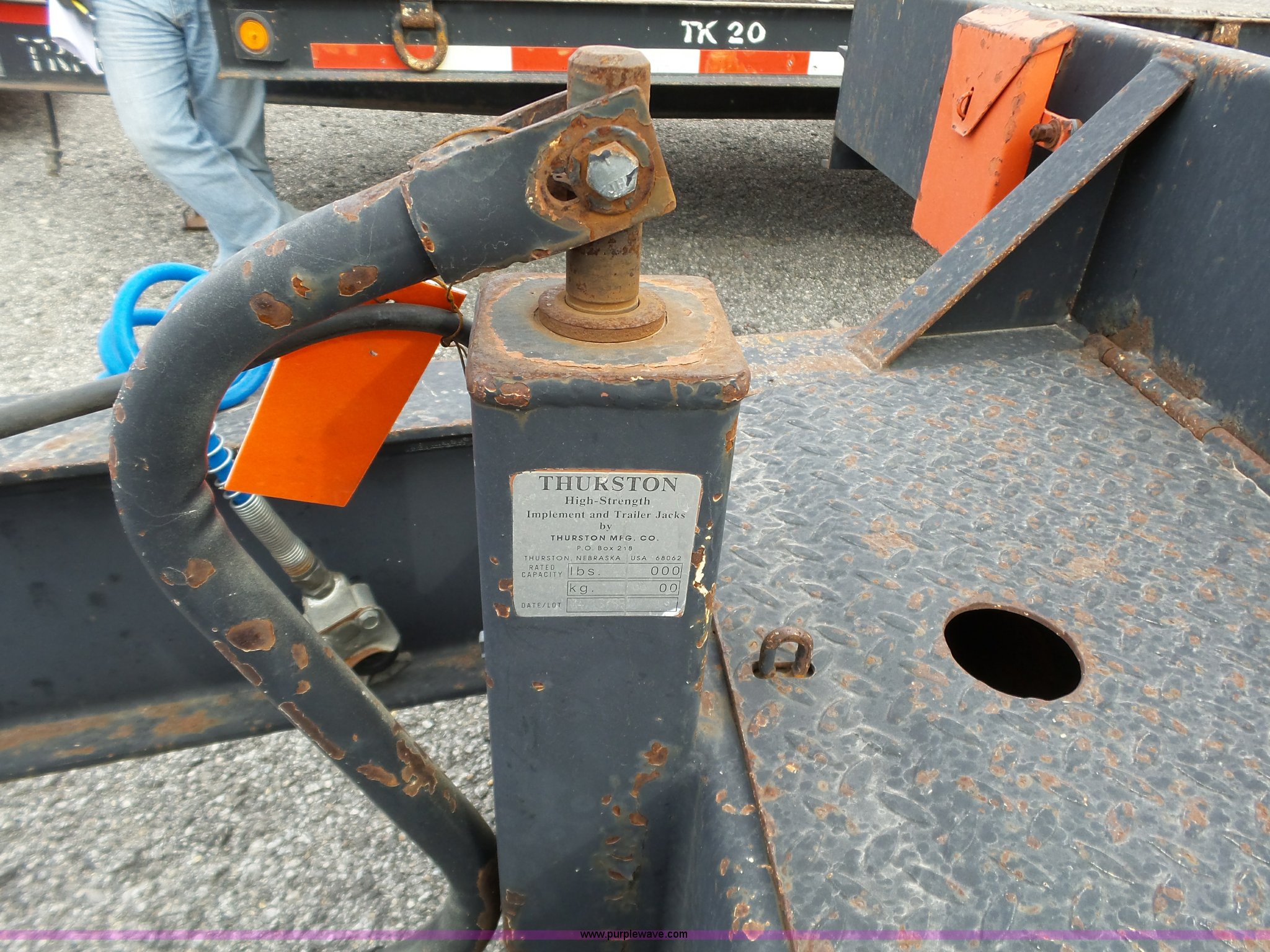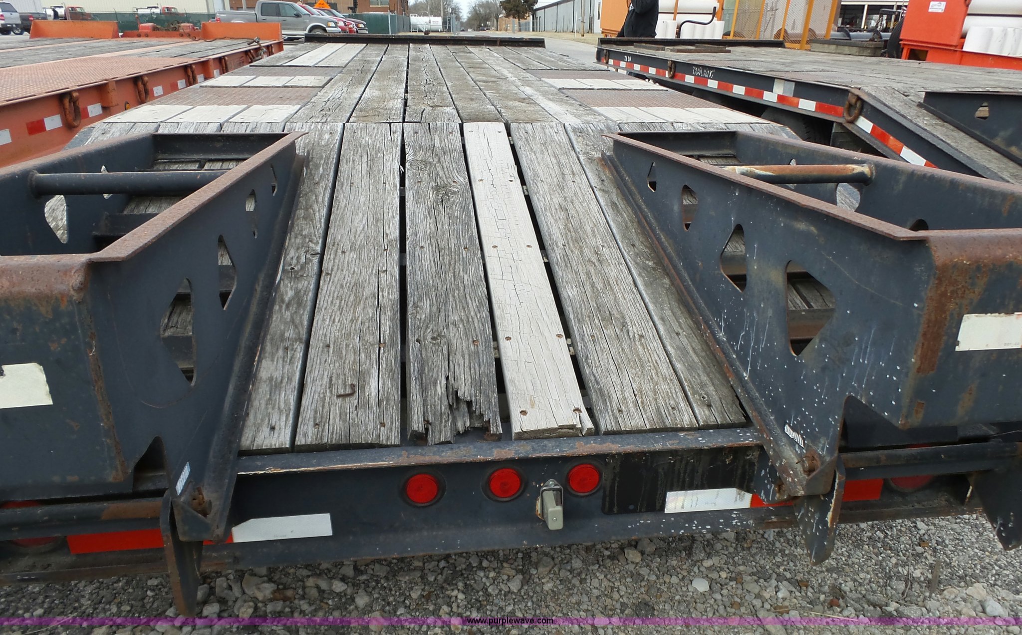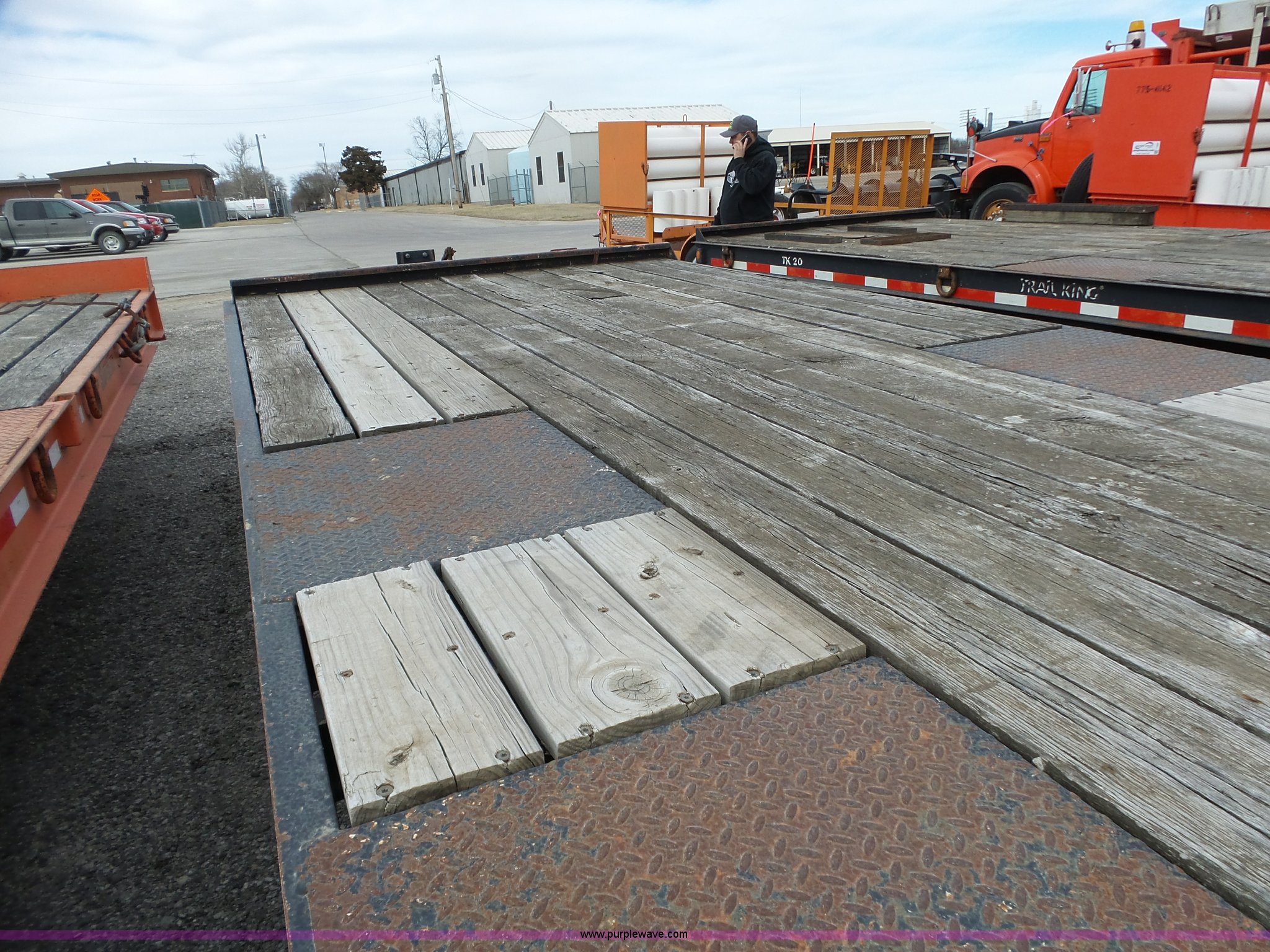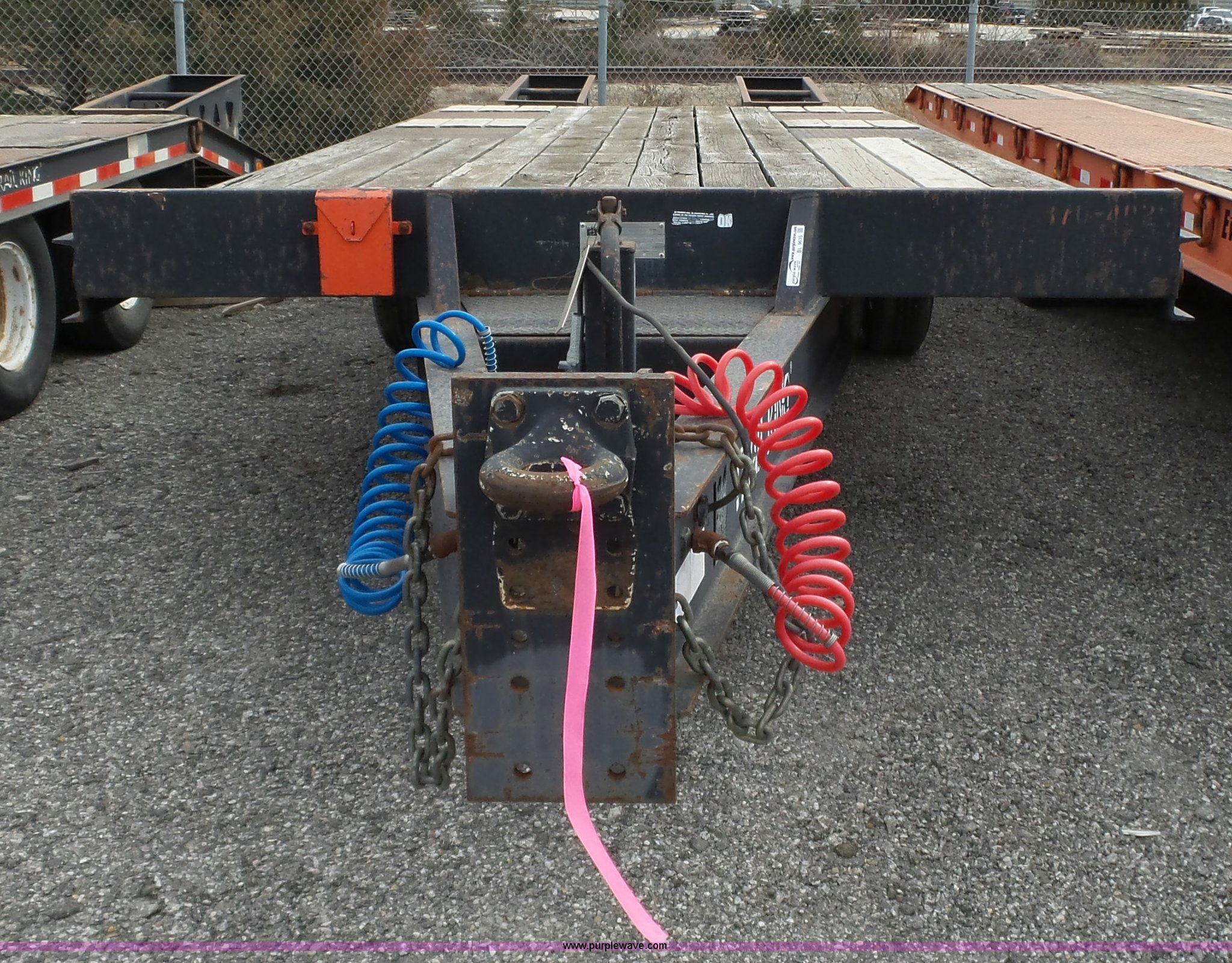 Purple Wave is selling a used Equip. Trailer in Kansas. This item is a 2000 Trail King TK20-2200 equipment trailer with the following: 22' overall length, Manual ramps, Dovetail, Wood deck, D-ring tie downs, Single leg landing gear, Adjustable pintle hitch, Tandem axle, Spring suspension, Air brakes, 235/85R15 tires, GVWR 25,980 lbs, GAWR 10,000 lbs, Brakes stick, Tag light needs replaced, KDOT ID 482-4019