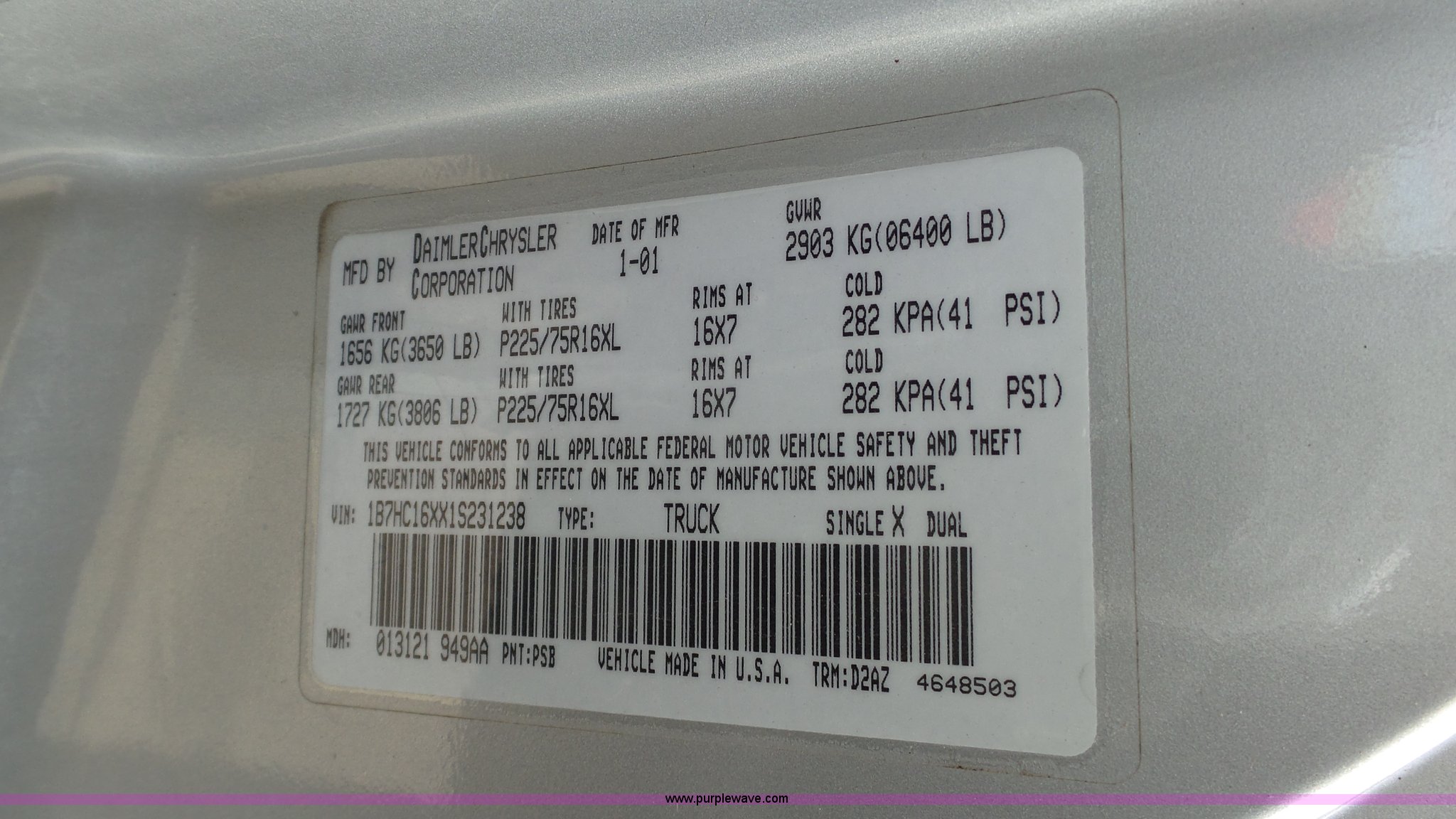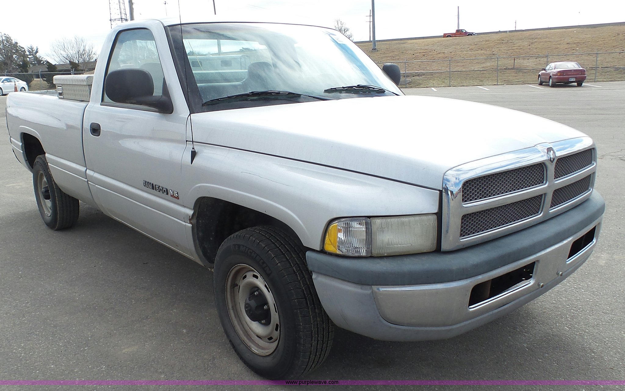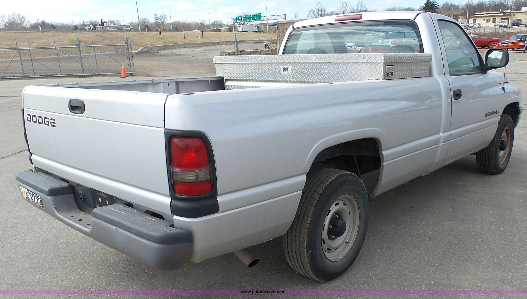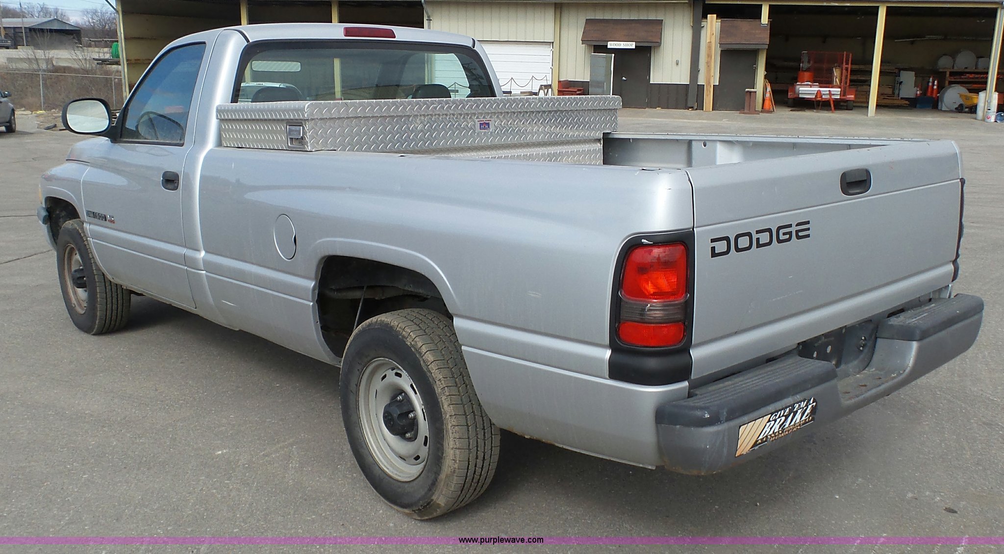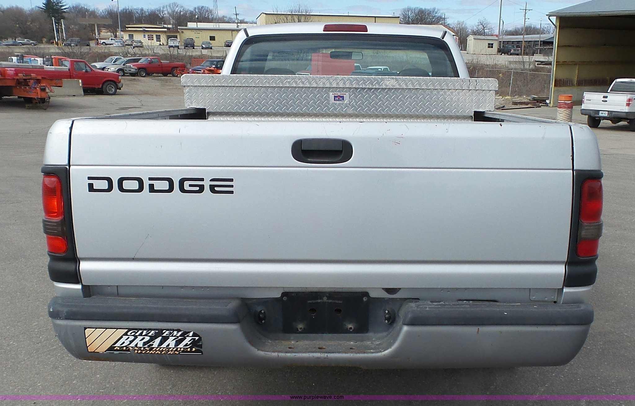Purple Wave is selling a used 1/2 Ton Pickup or Van in Kansas. This item is a 2001 Dodge Ram 1500 pickup truck with the following: 117,454 miles on odometer, 3.9L V6 OHV 12V gas engine, Automatic transmission, AC and heat, Tilt, Cruise, AM/FM/cassette, Manual windows and locks, Vinyl interior, Cross bed toolbox, Long bed, 225/75R16 tires, Dash cracked, Interior/exterior cosmetic damage, Paint faded and scratched, KDOT ID 051-1021