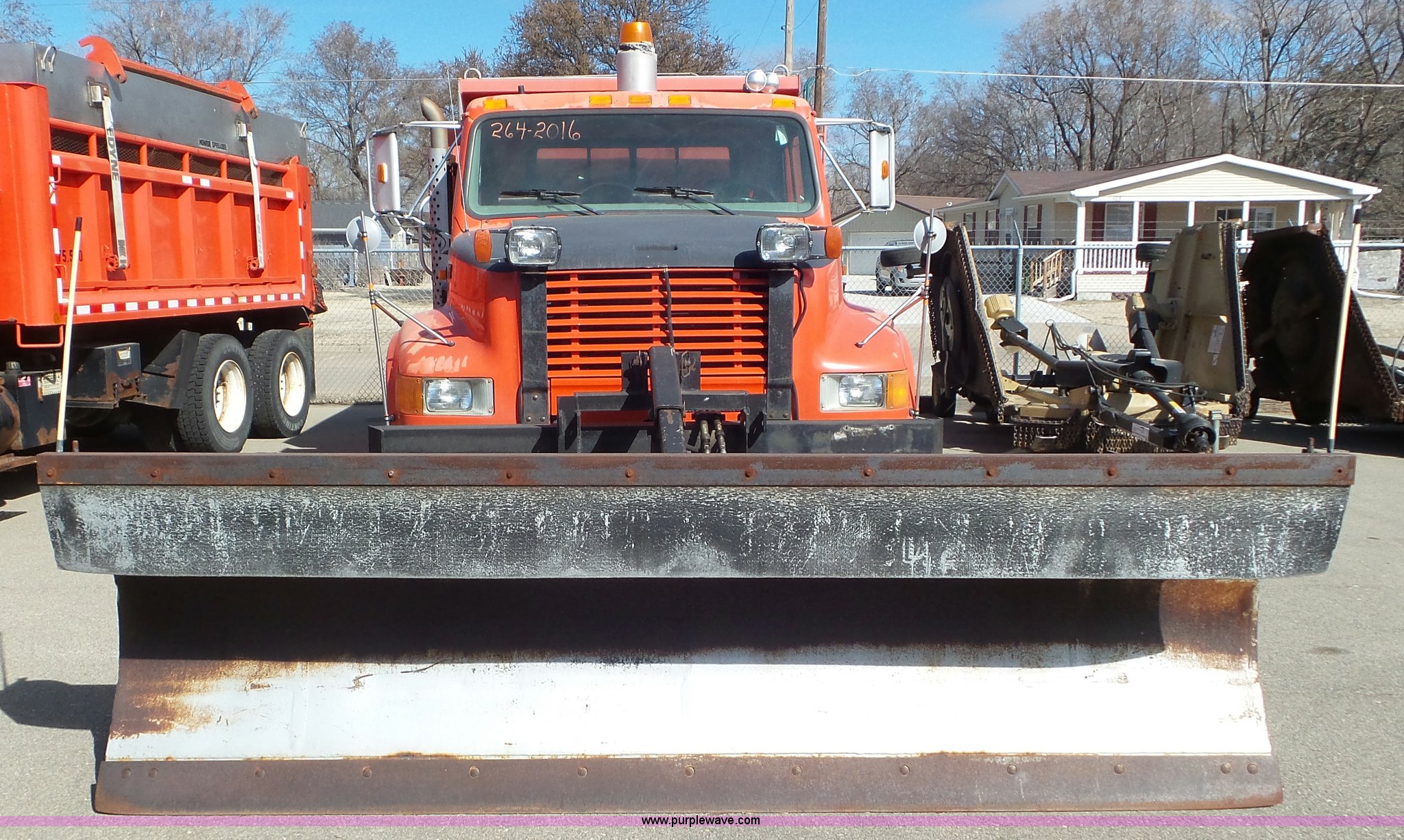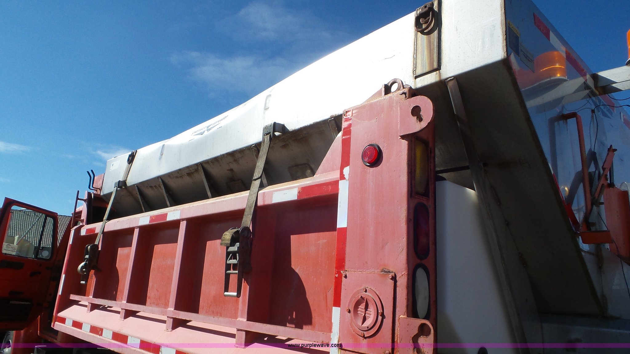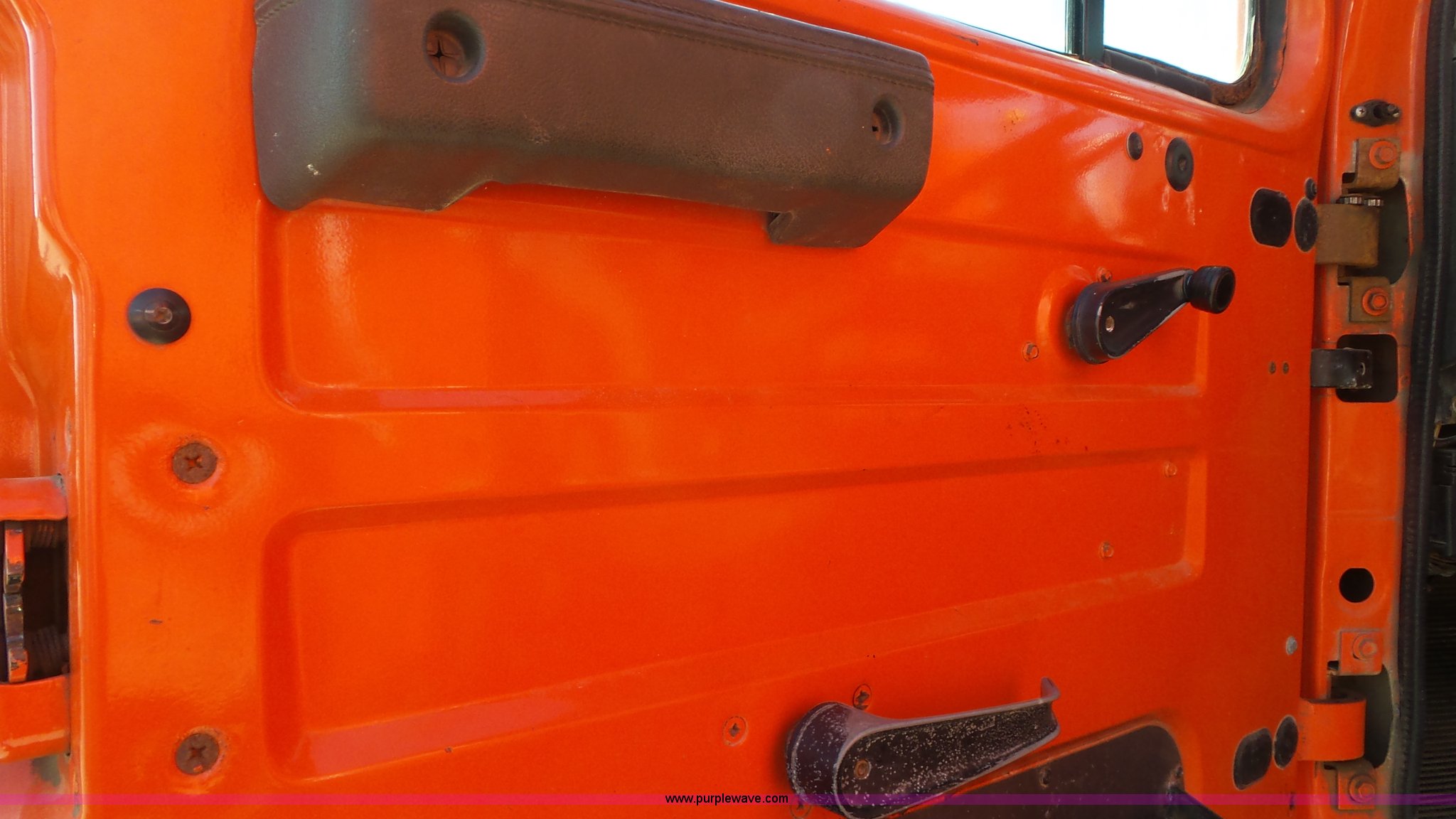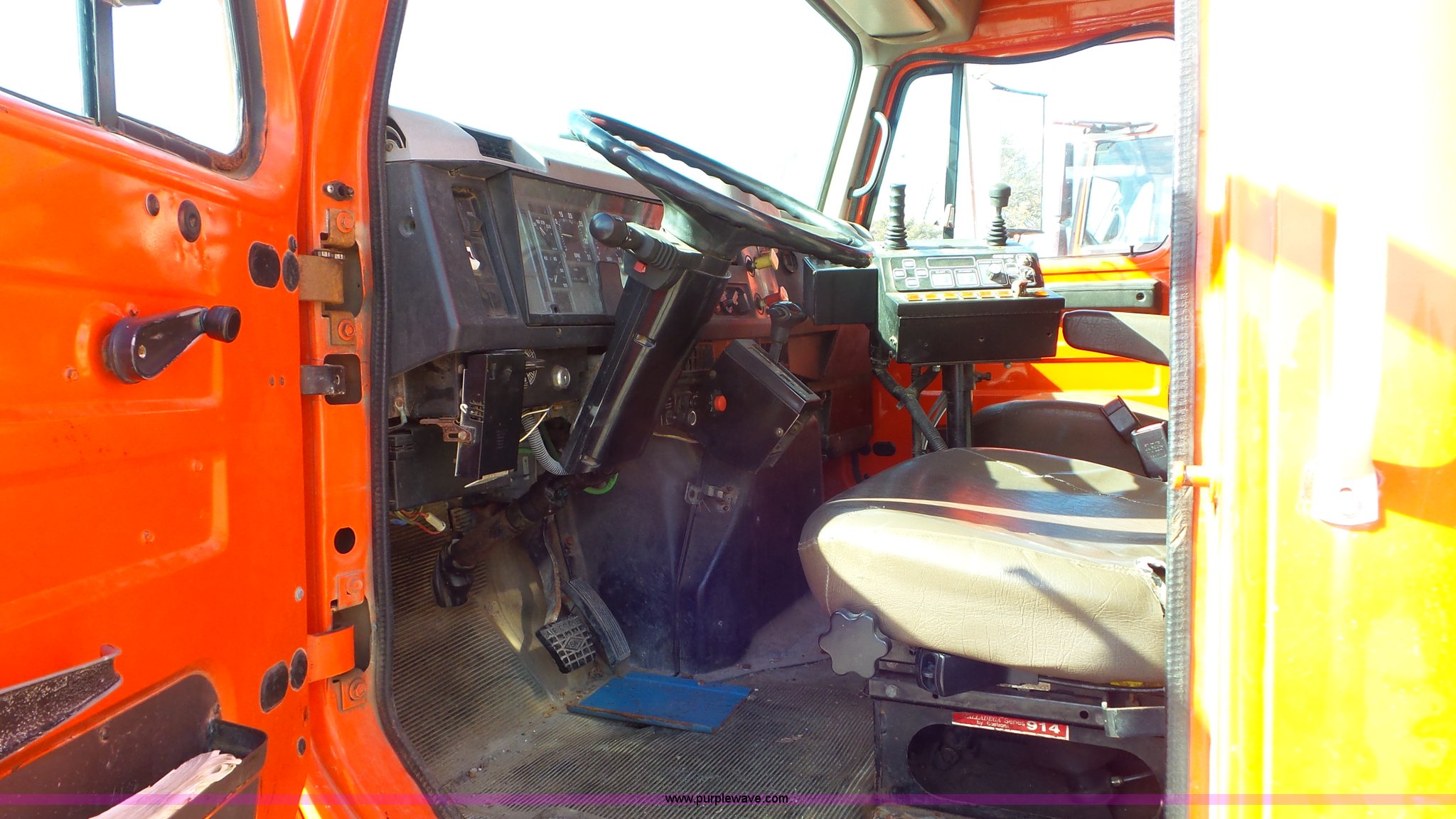 Purple Wave is selling a used Construction Dump Truck in Kansas. This item is a 1997 International 4900 dump truck with the following: 165,207 miles on odometer, International DT466 7.6L L6 turbo diesel engine, Automatic transmission, Tandem axle, AC and heat, AM/FM, Air suspension seat, Trailer brake controller, PTO, 13'L steel bed, Single fuel tank, Rear glad hand couplers, Side hydraulic couplers, Air operated end gate, Spring suspension, Air brakes, 275/80R22.5 front tires, 295/75R22.5 rear tires, Batteries weak, KDOT ID 264-2016