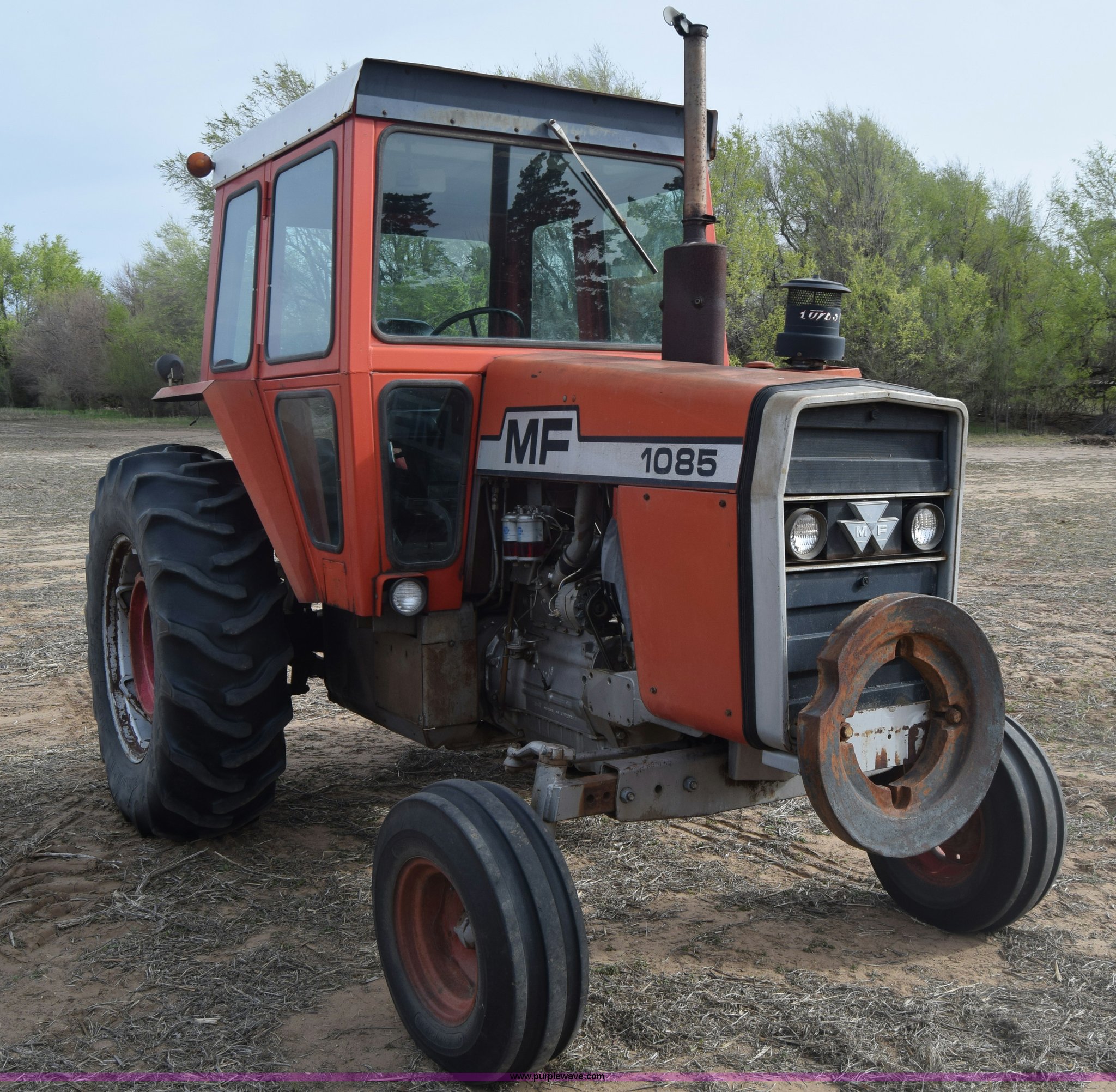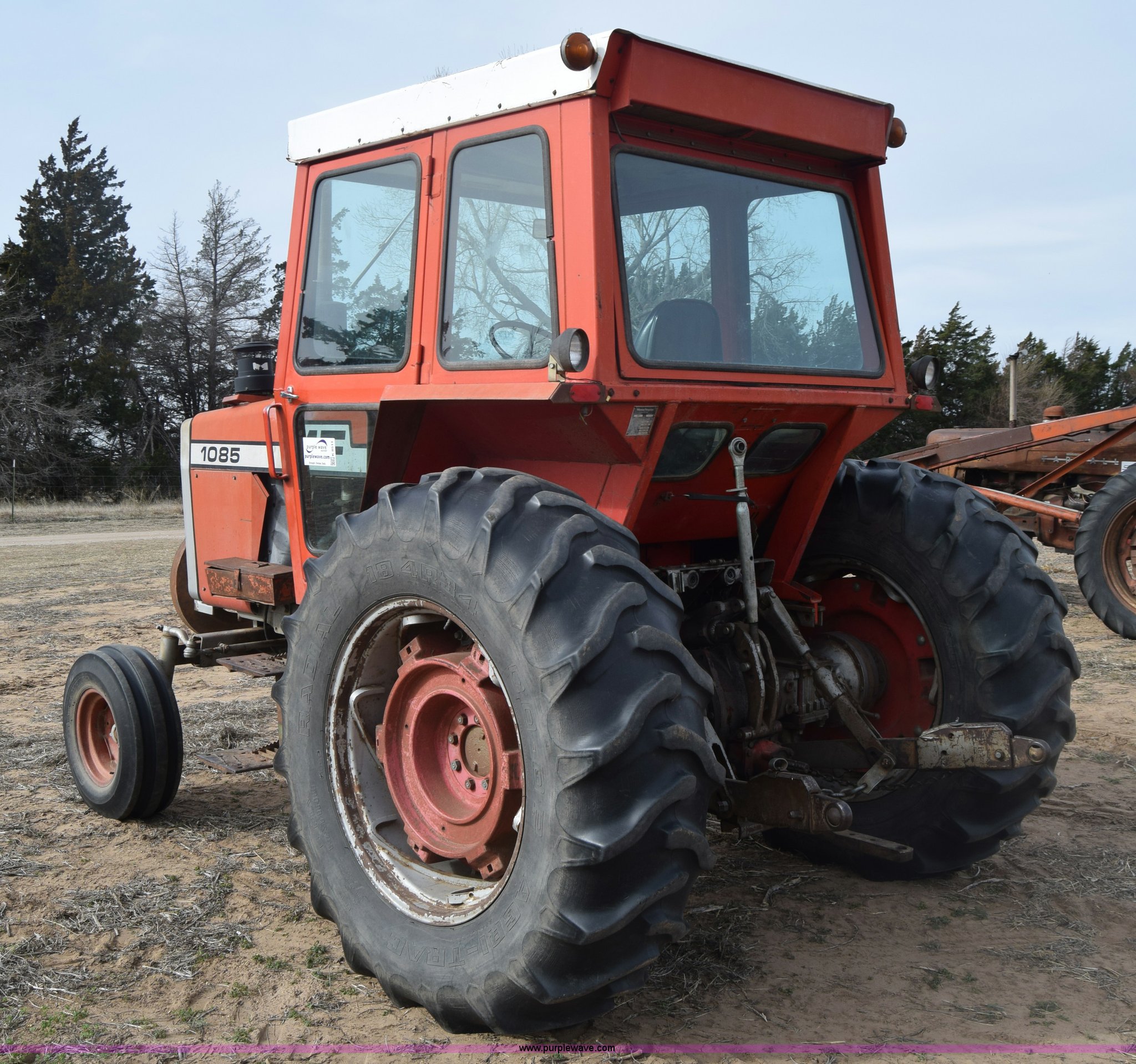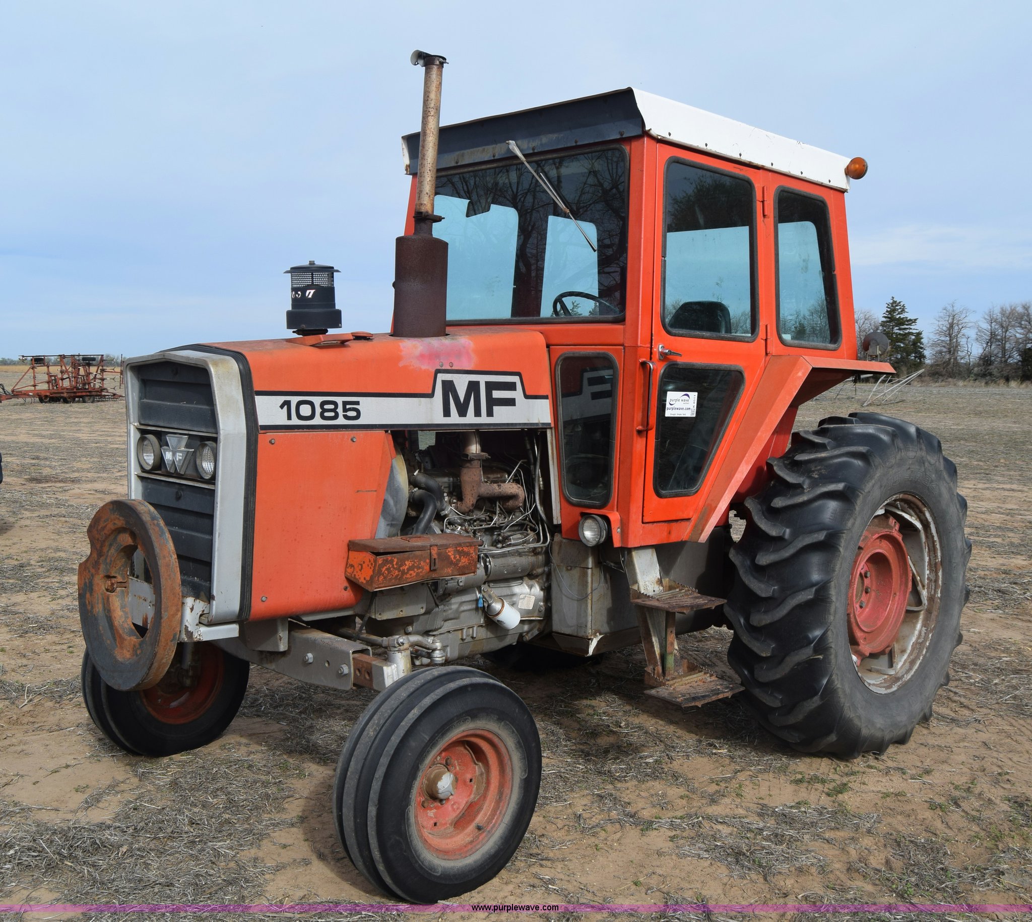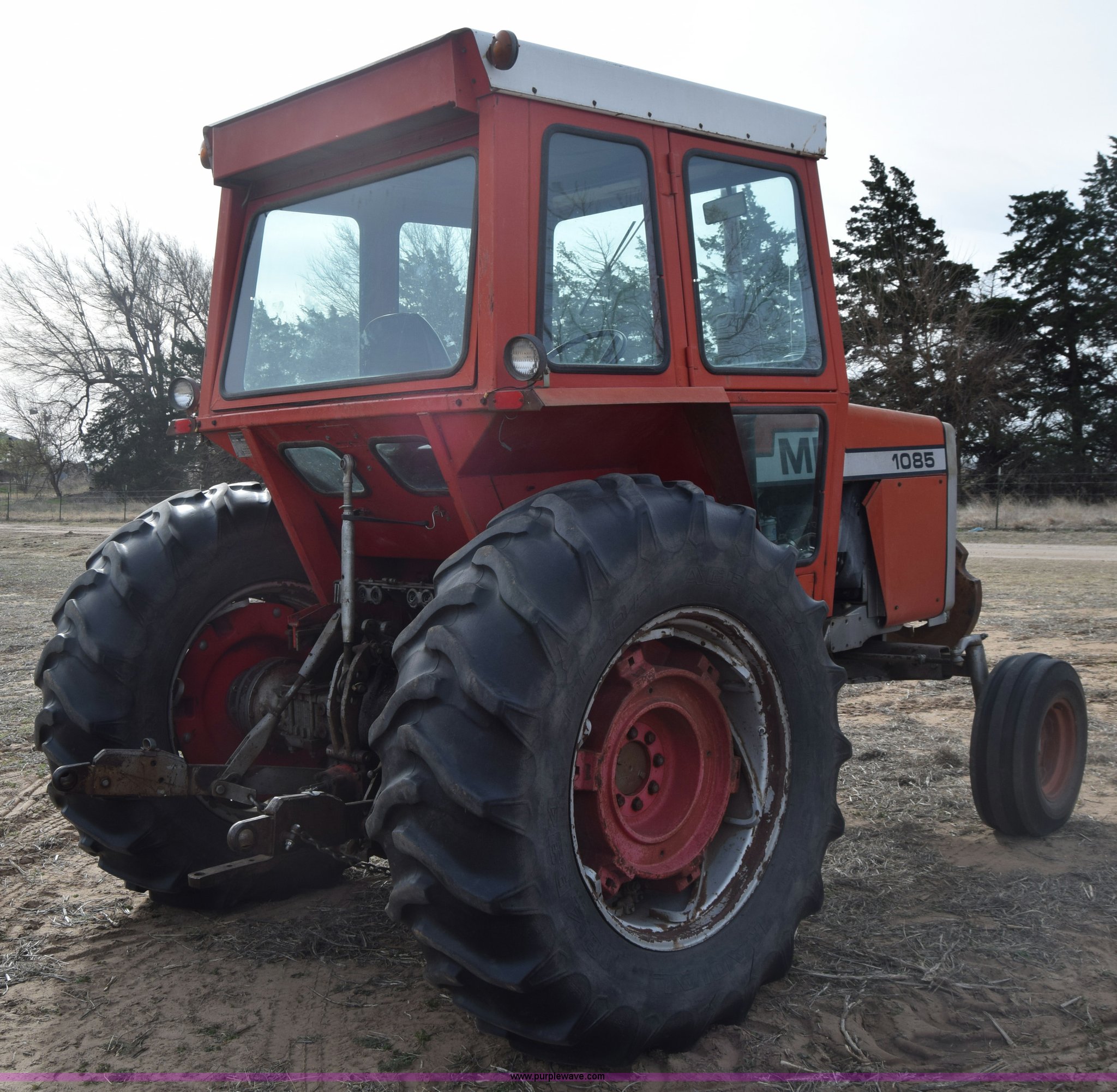 Purple Wave is selling a used Tractor in Kansas. This item is a Massey-Ferguson 1085 tractor with the following: 4,043 hours on meter, Perkins 5.2L four cylinder diesel engine, 82 HP, Partial powershift transmission, 12F-4R gears, Enclosed cab, 540 PTO, (2) rear hydraulic remote sets, 45 gallon fuel tank, 97" wheelbase, 9.5L-15 front tires, 18.4R34 rear tires