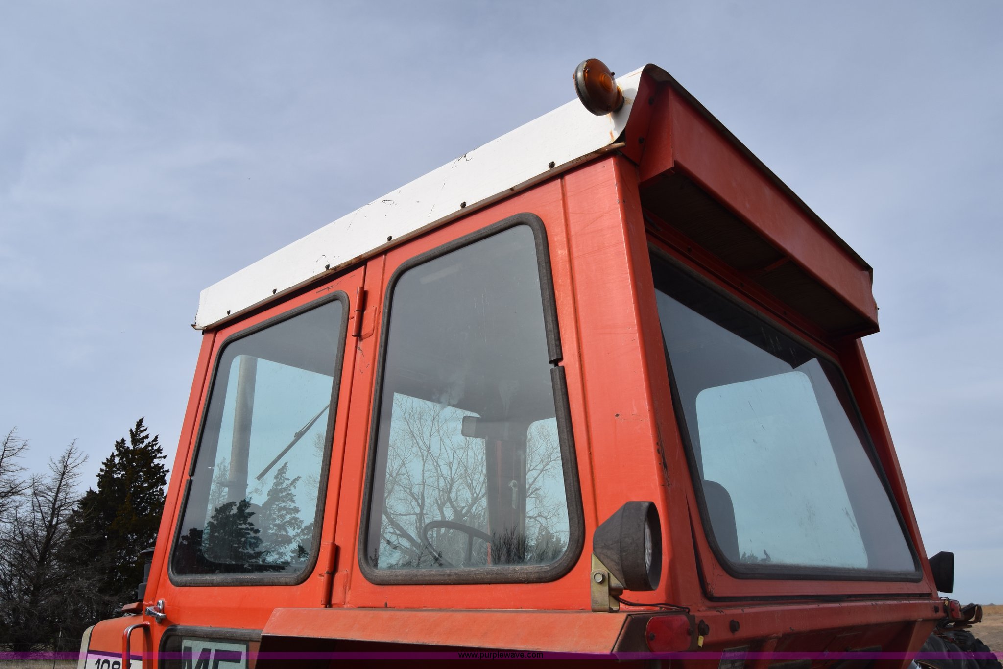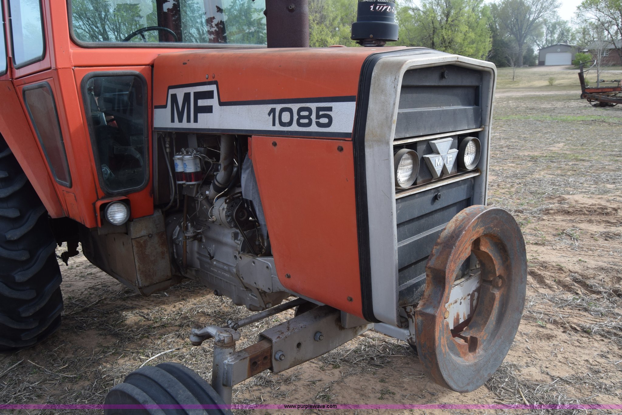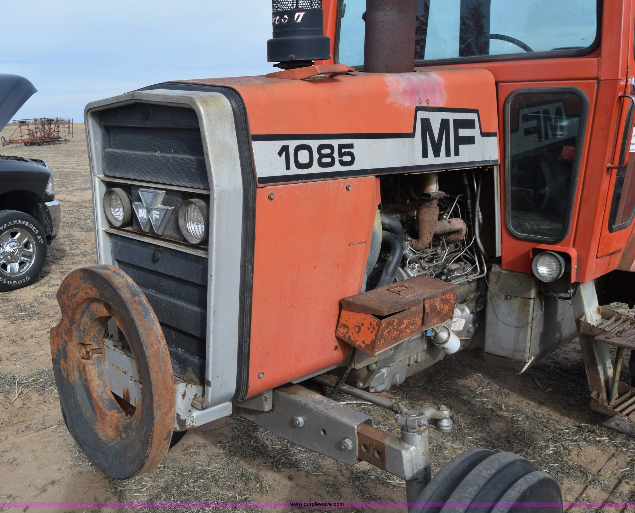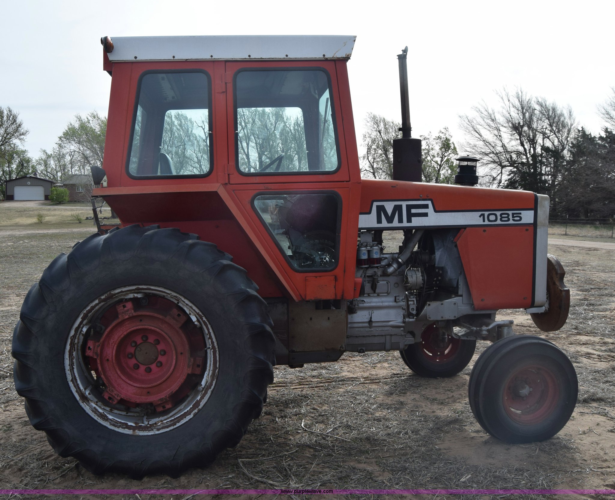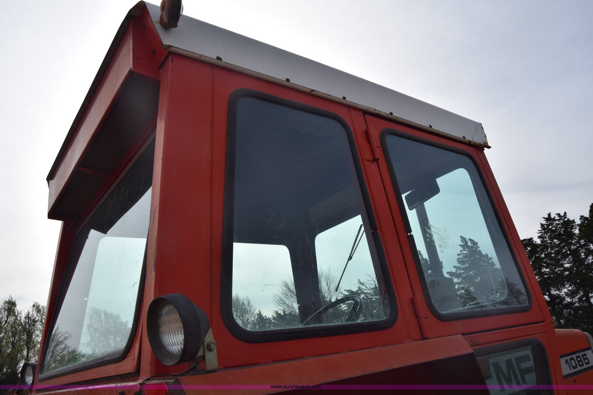 Purple Wave is selling a used Tractor in Kansas. This item is a Massey-Ferguson 1085 tractor with the following: 4,043 hours on meter, Perkins 5.2L four cylinder diesel engine, 82 HP, Partial powershift transmission, 12F-4R gears, Enclosed cab, 540 PTO, (2) rear hydraulic remote sets, 45 gallon fuel tank, 97" wheelbase, 9.5L-15 front tires, 18.4R34 rear tires