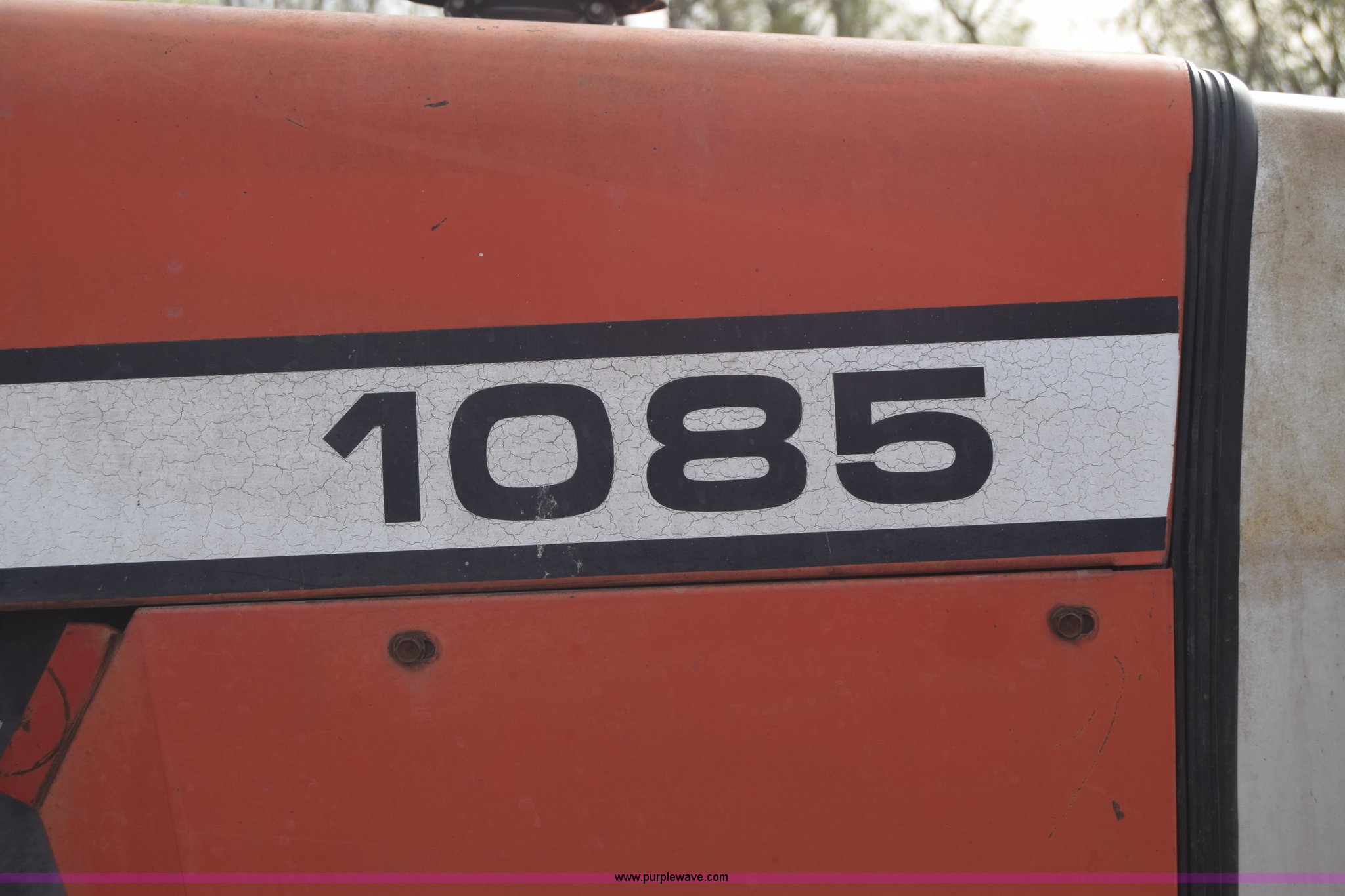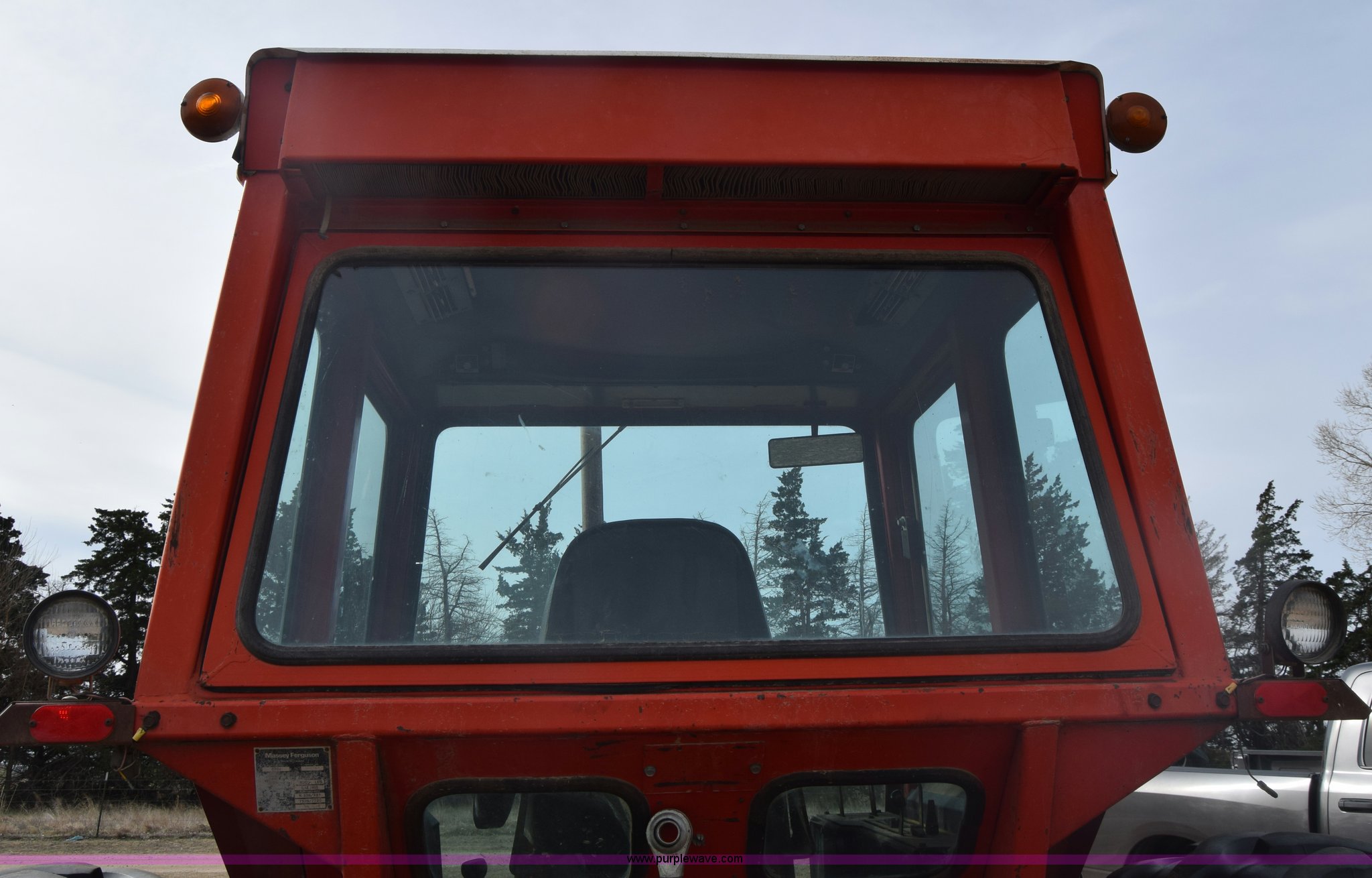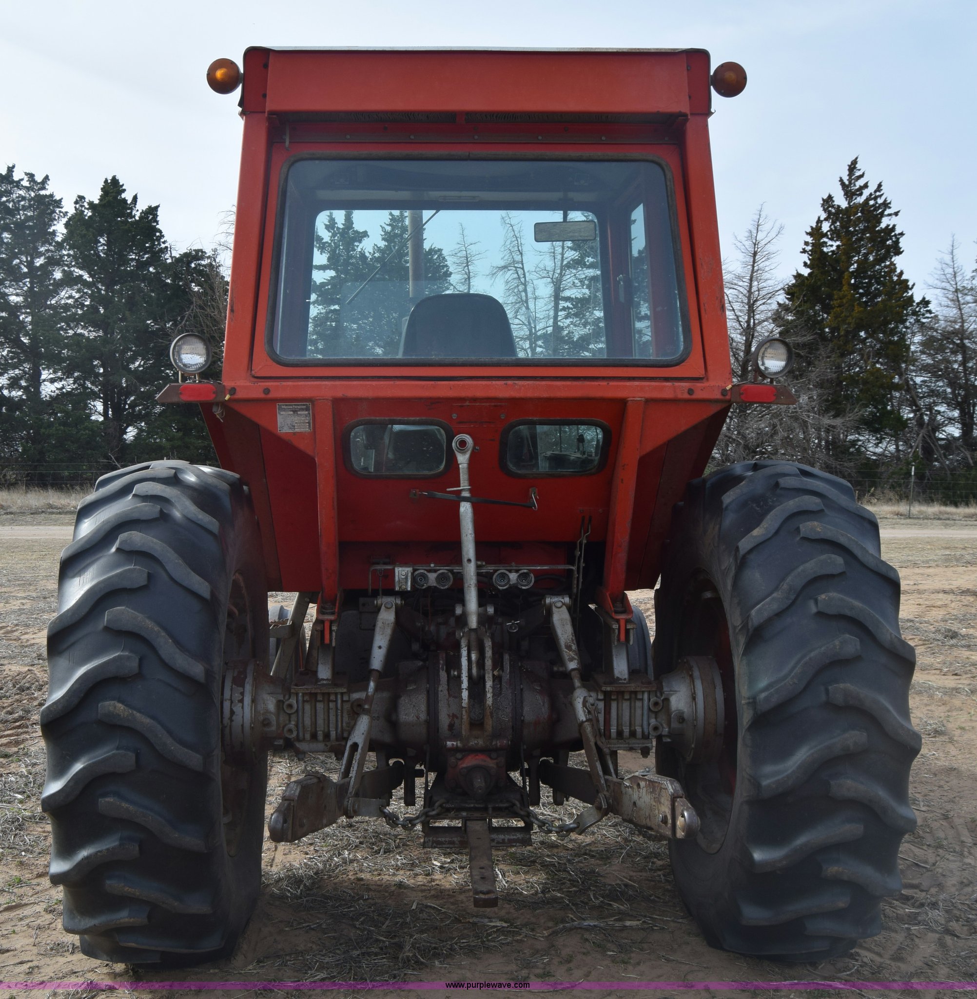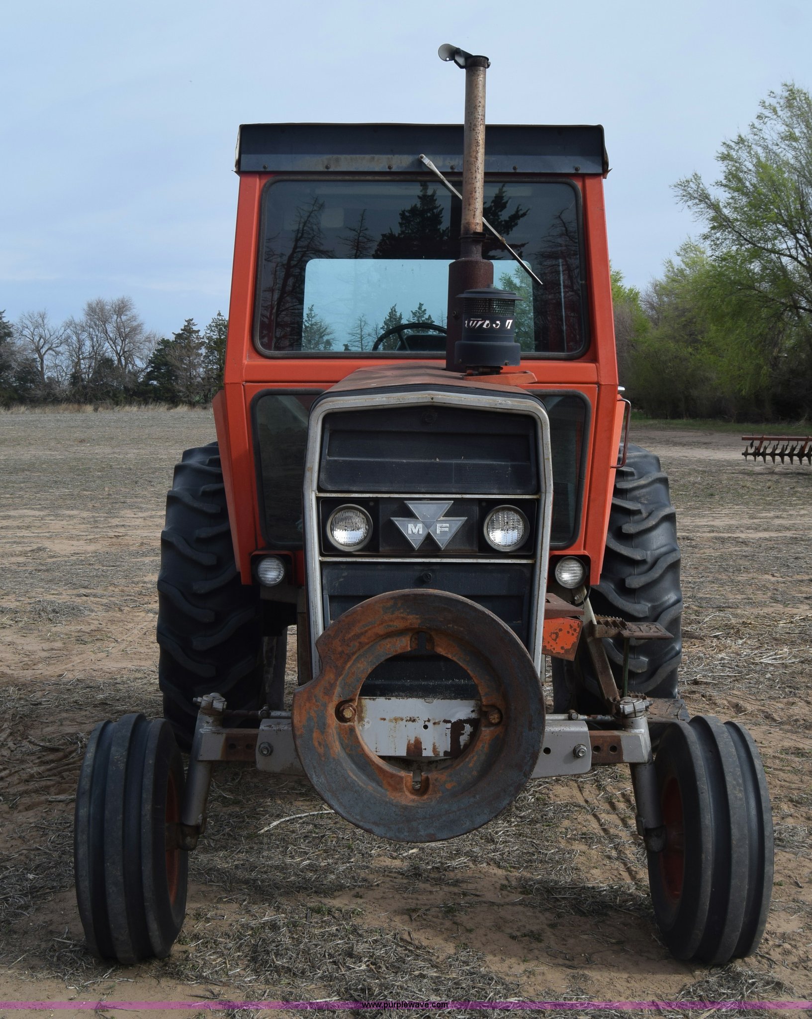 Purple Wave is selling a used Tractor in Kansas. This item is a Massey-Ferguson 1085 tractor with the following: 4,043 hours on meter, Perkins 5.2L four cylinder diesel engine, 82 HP, Partial powershift transmission, 12F-4R gears, Enclosed cab, 540 PTO, (2) rear hydraulic remote sets, 45 gallon fuel tank, 97" wheelbase, 9.5L-15 front tires, 18.4R34 rear tires
