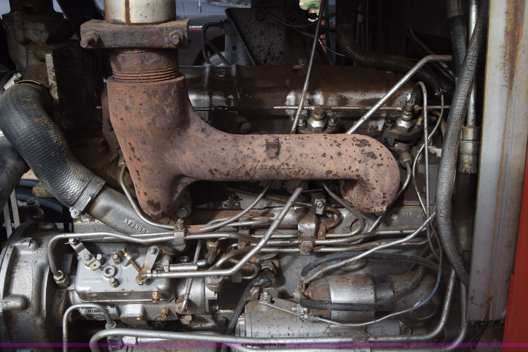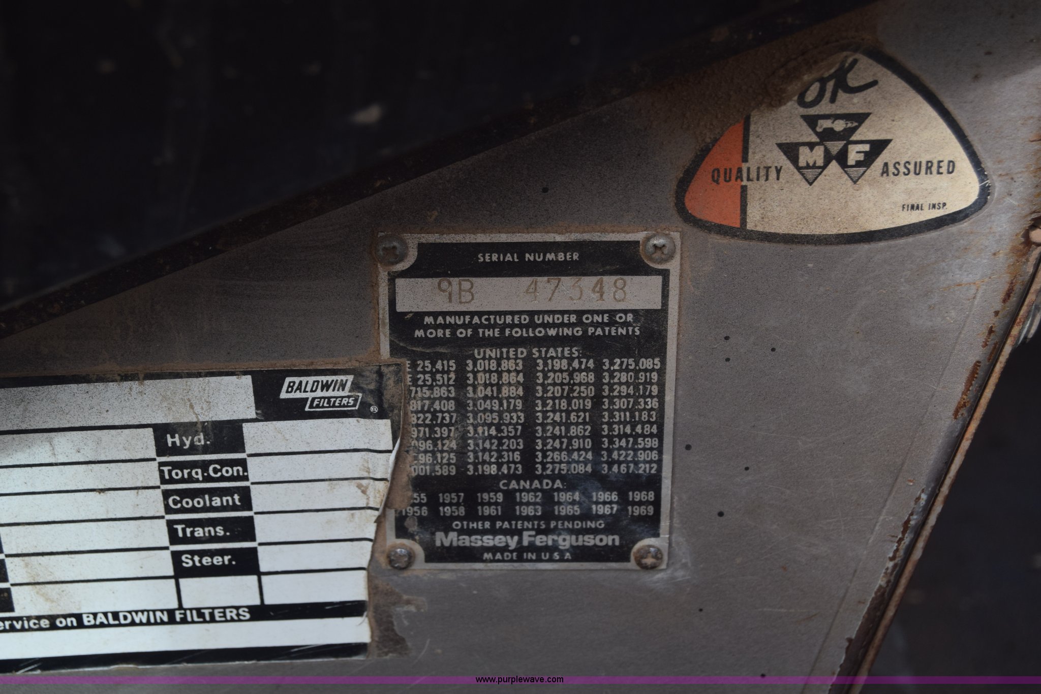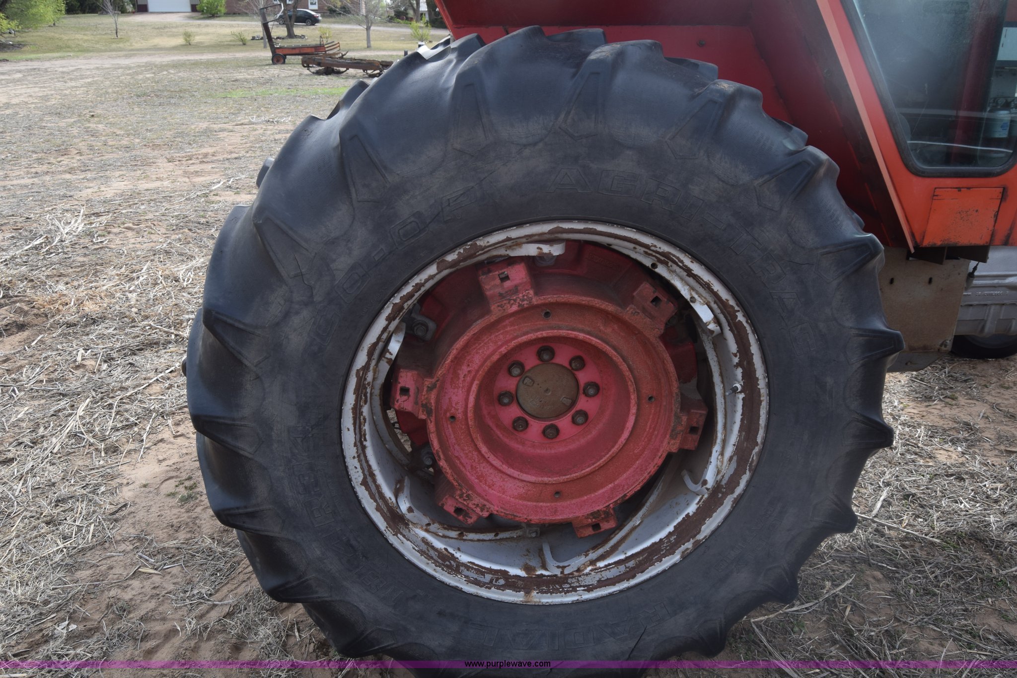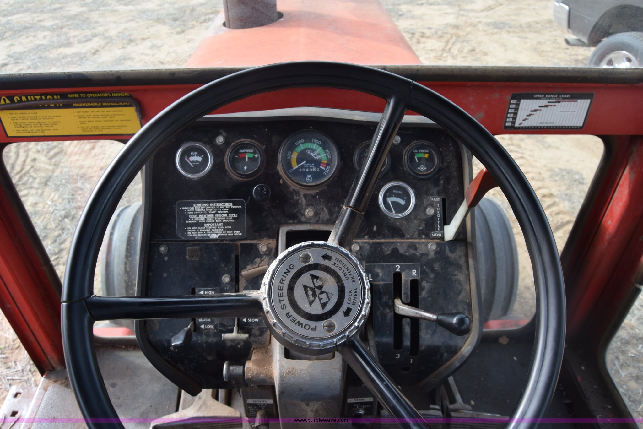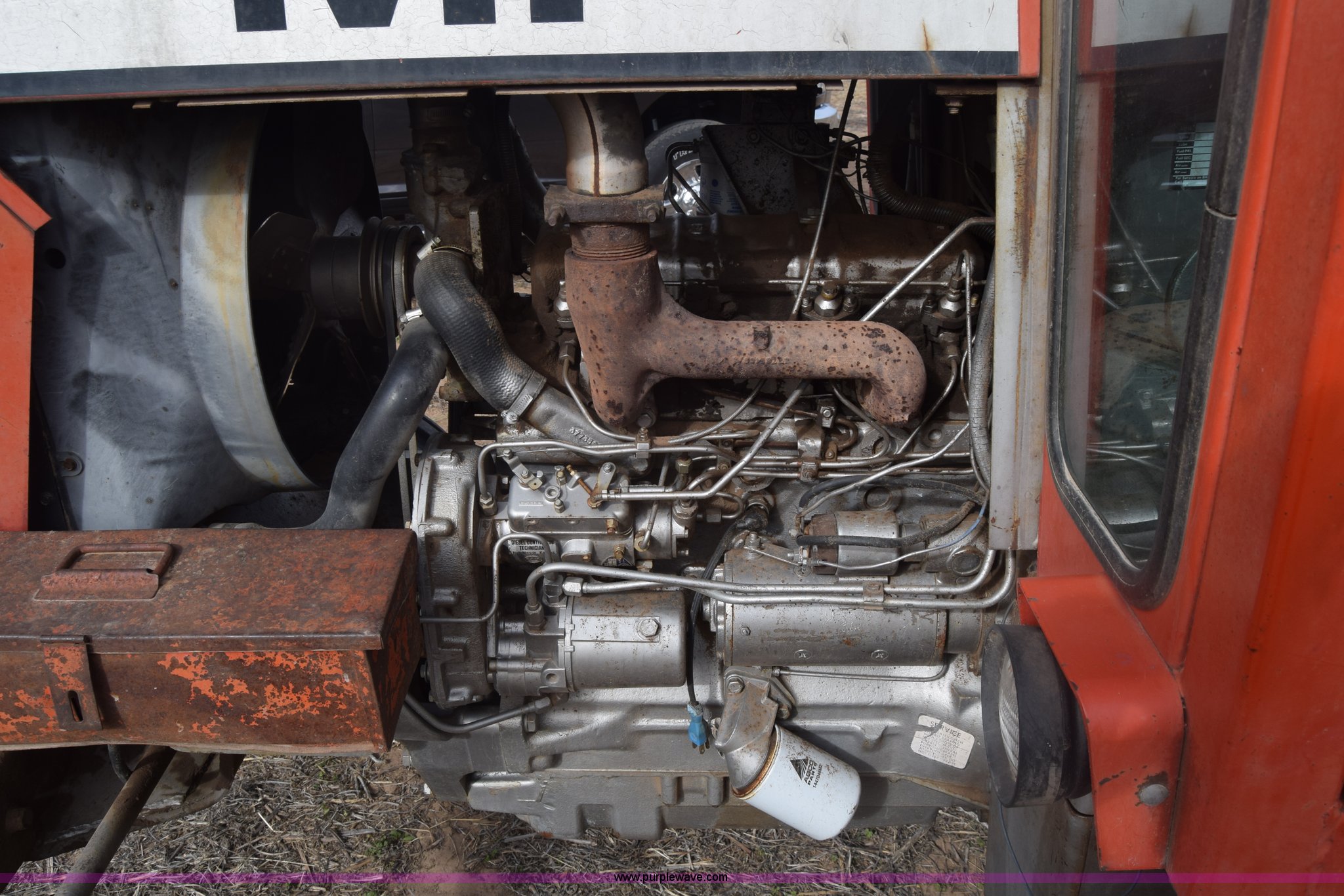 Purple Wave is selling a used Tractor in Kansas. This item is a Massey-Ferguson 1085 tractor with the following: 4,043 hours on meter, Perkins 5.2L four cylinder diesel engine, 82 HP, Partial powershift transmission, 12F-4R gears, Enclosed cab, 540 PTO, (2) rear hydraulic remote sets, 45 gallon fuel tank, 97" wheelbase, 9.5L-15 front tires, 18.4R34 rear tires