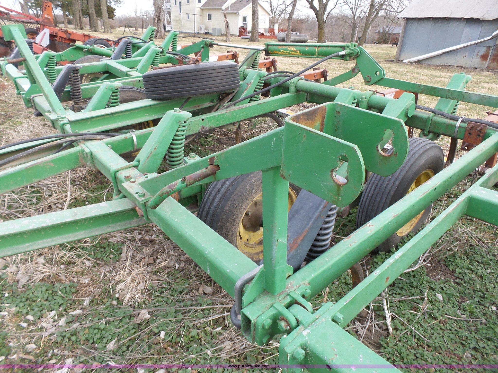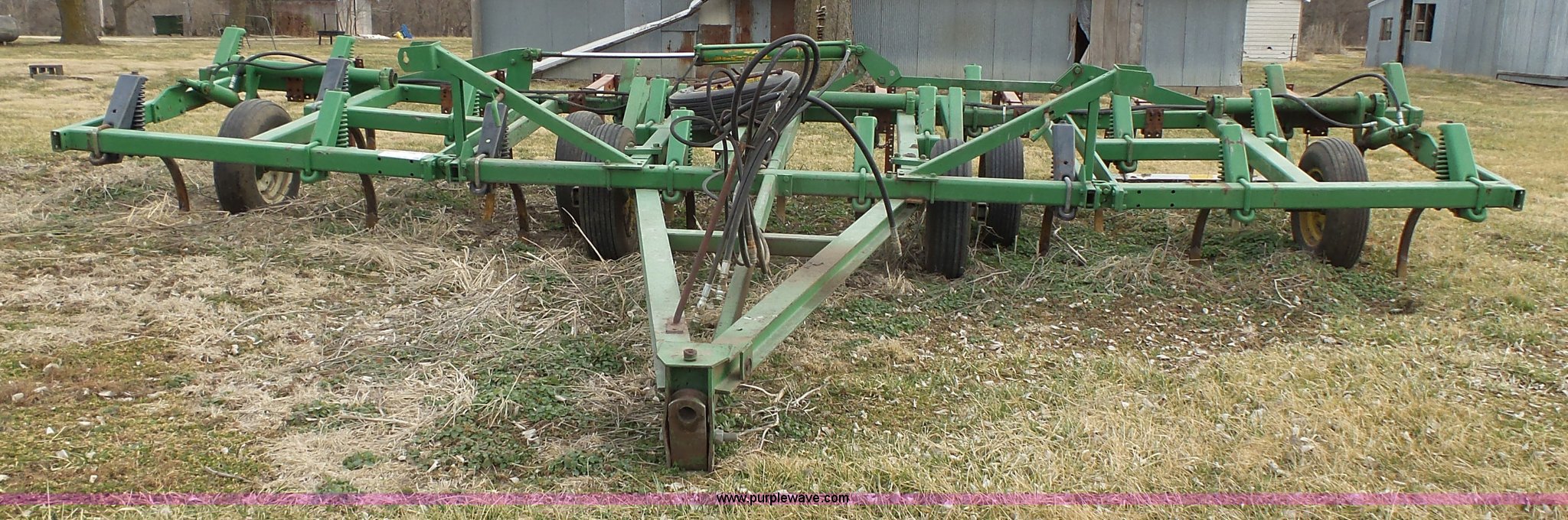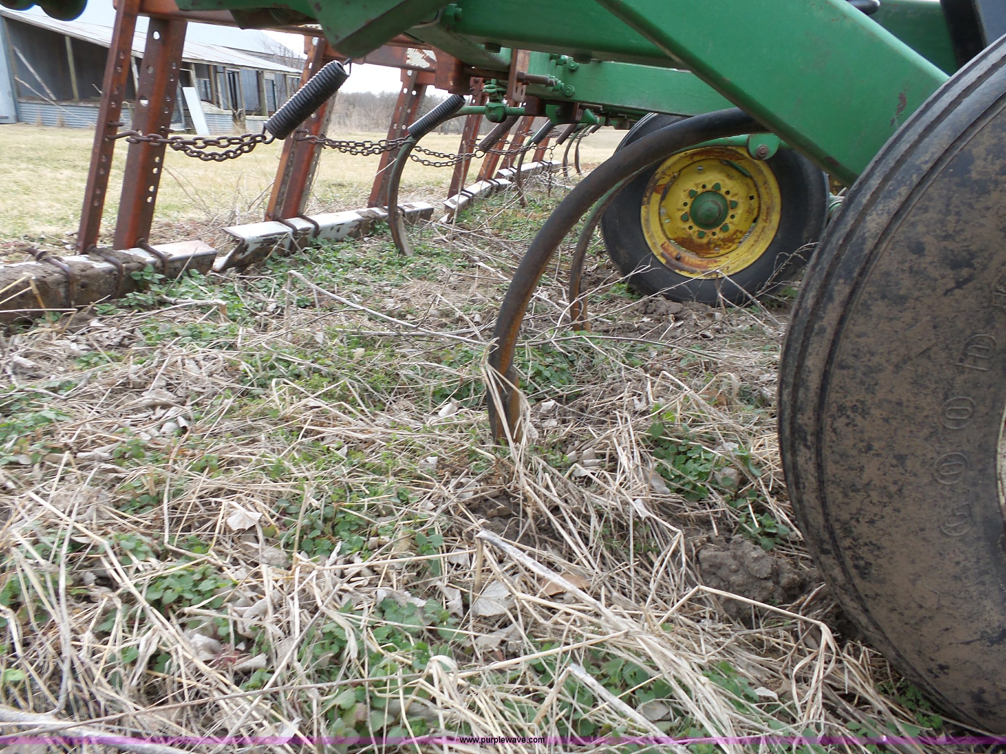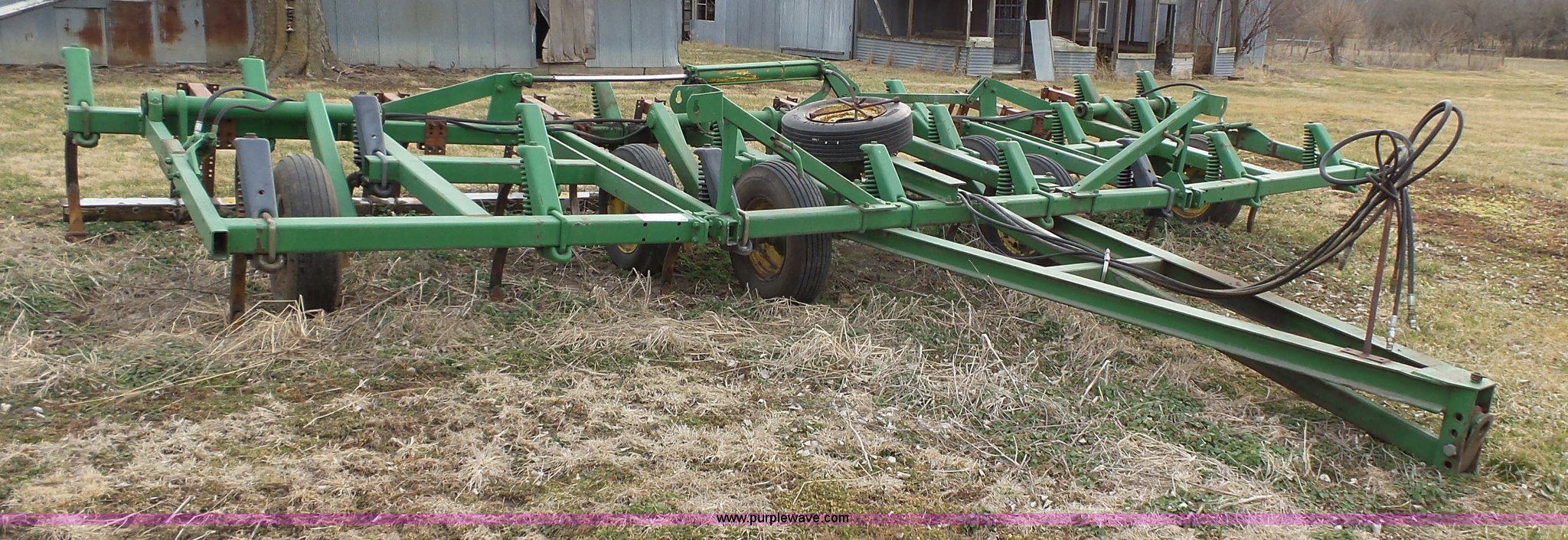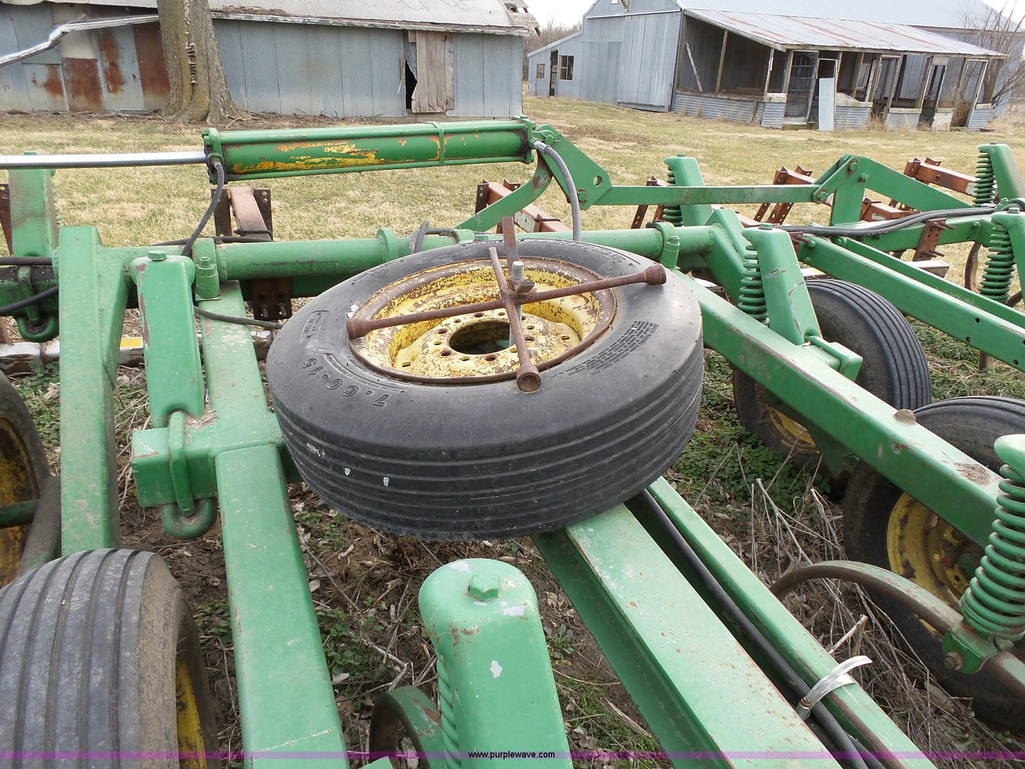 Purple Wave is selling a used Chisel in Kansas. This item is a John Deere 1600 chisel with the following: 24'W, Midwest rear harrow system, Hydraulics, Pin hitch, (6) 15" tires, Additional 15" tire, Weld repairs
