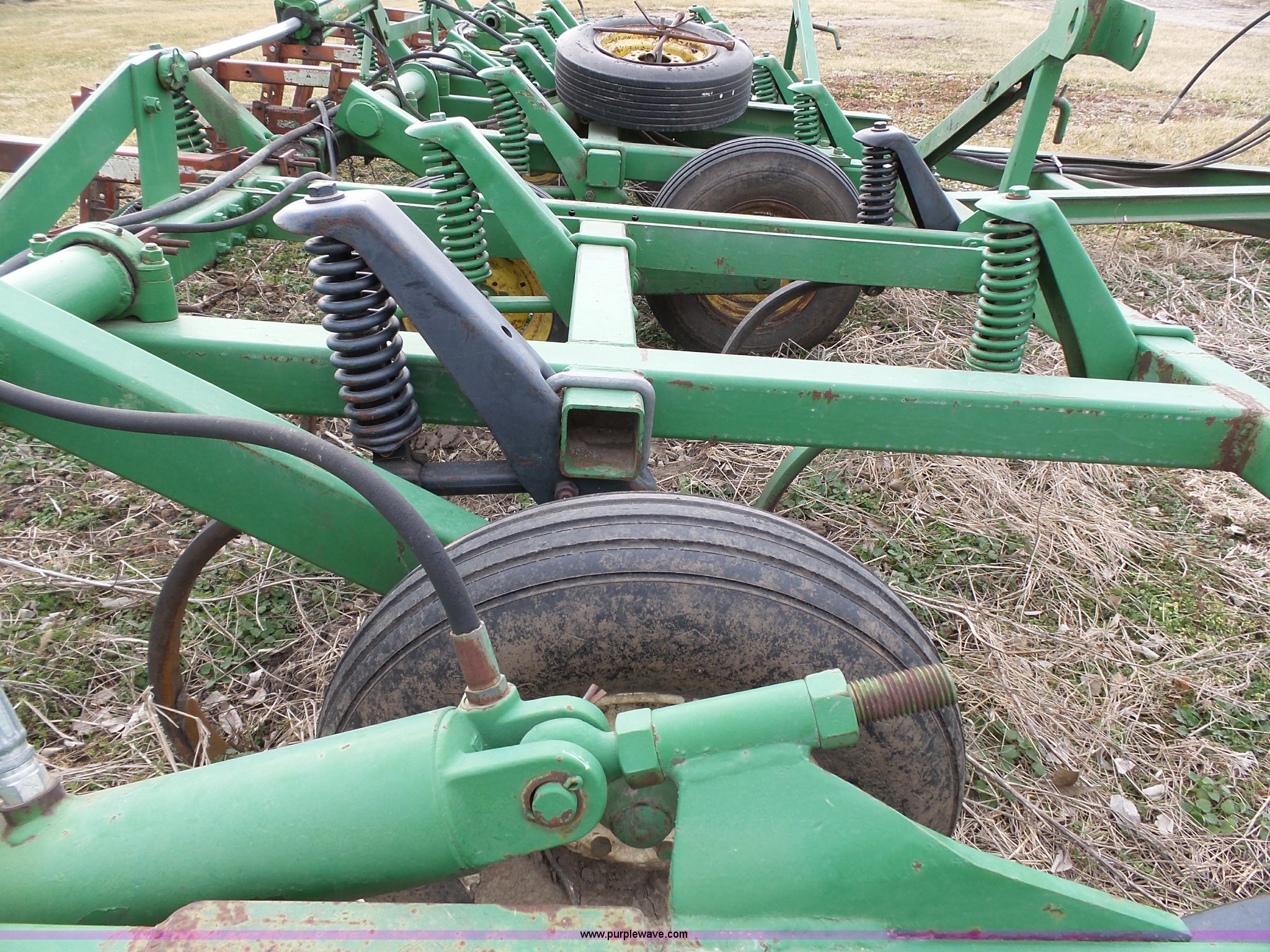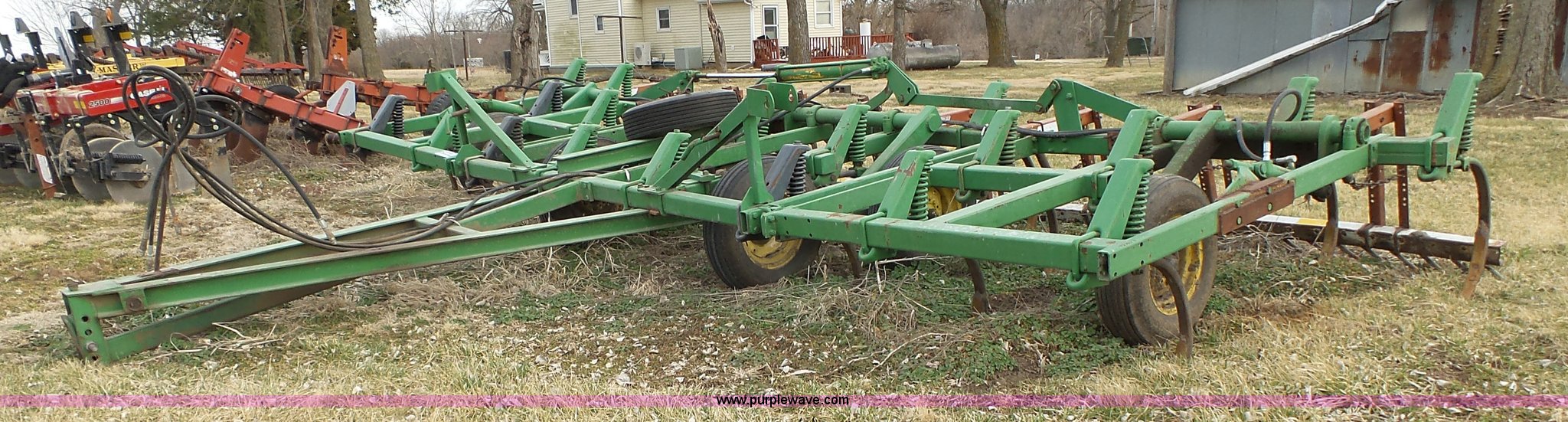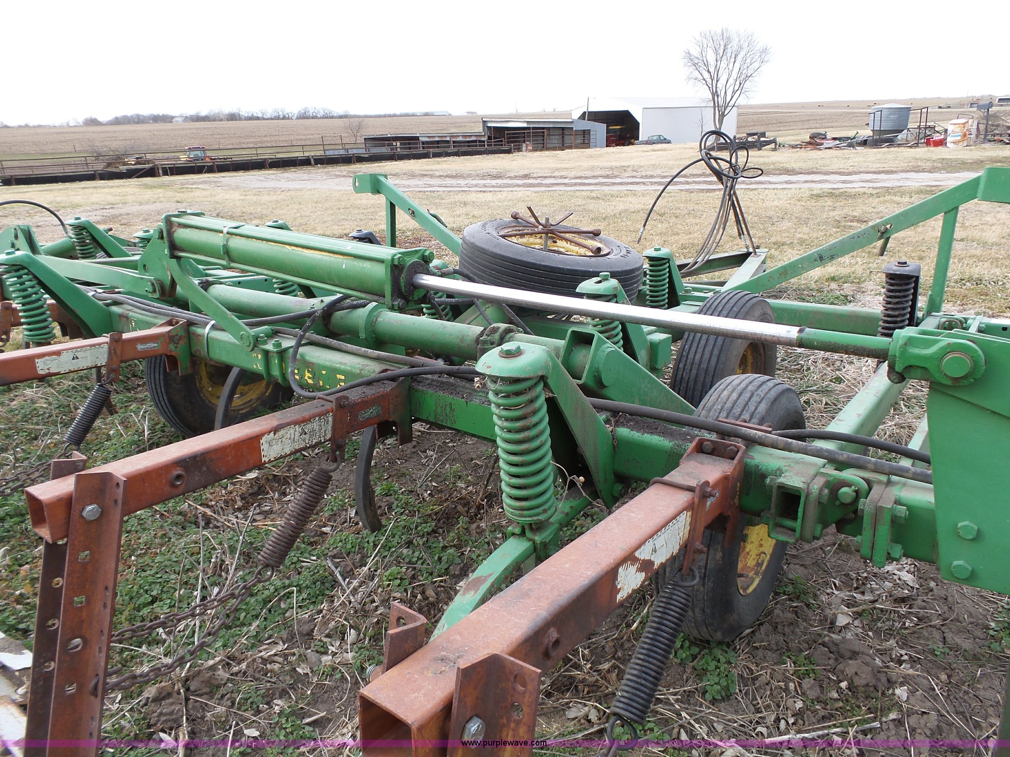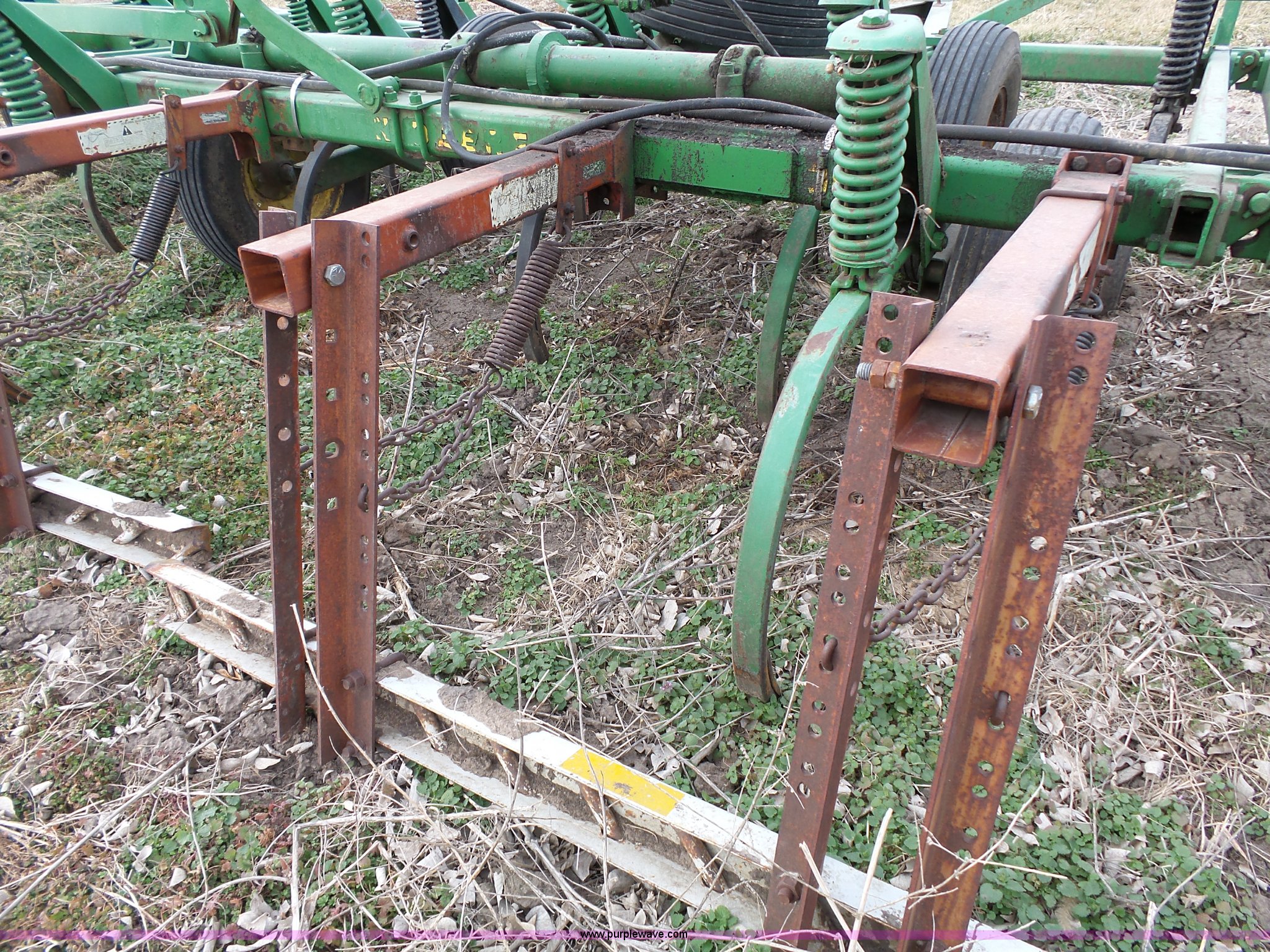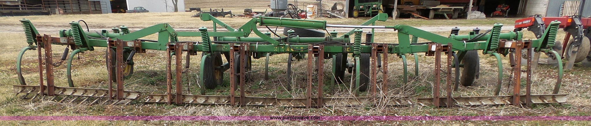 Purple Wave is selling a used Chisel in Kansas. This item is a John Deere 1600 chisel with the following: 24'W, Midwest rear harrow system, Hydraulics, Pin hitch, (6) 15" tires, Additional 15" tire, Weld repairs