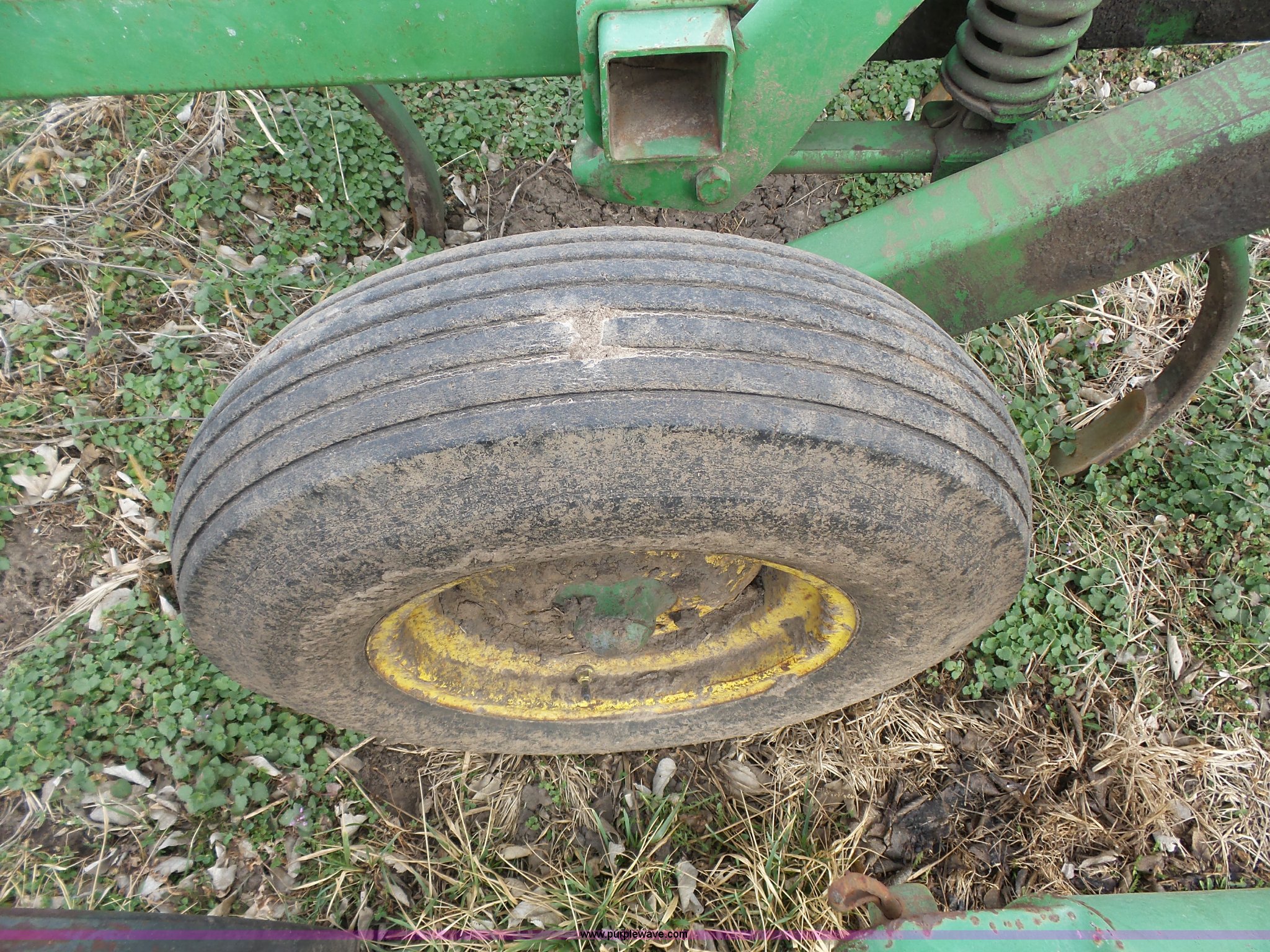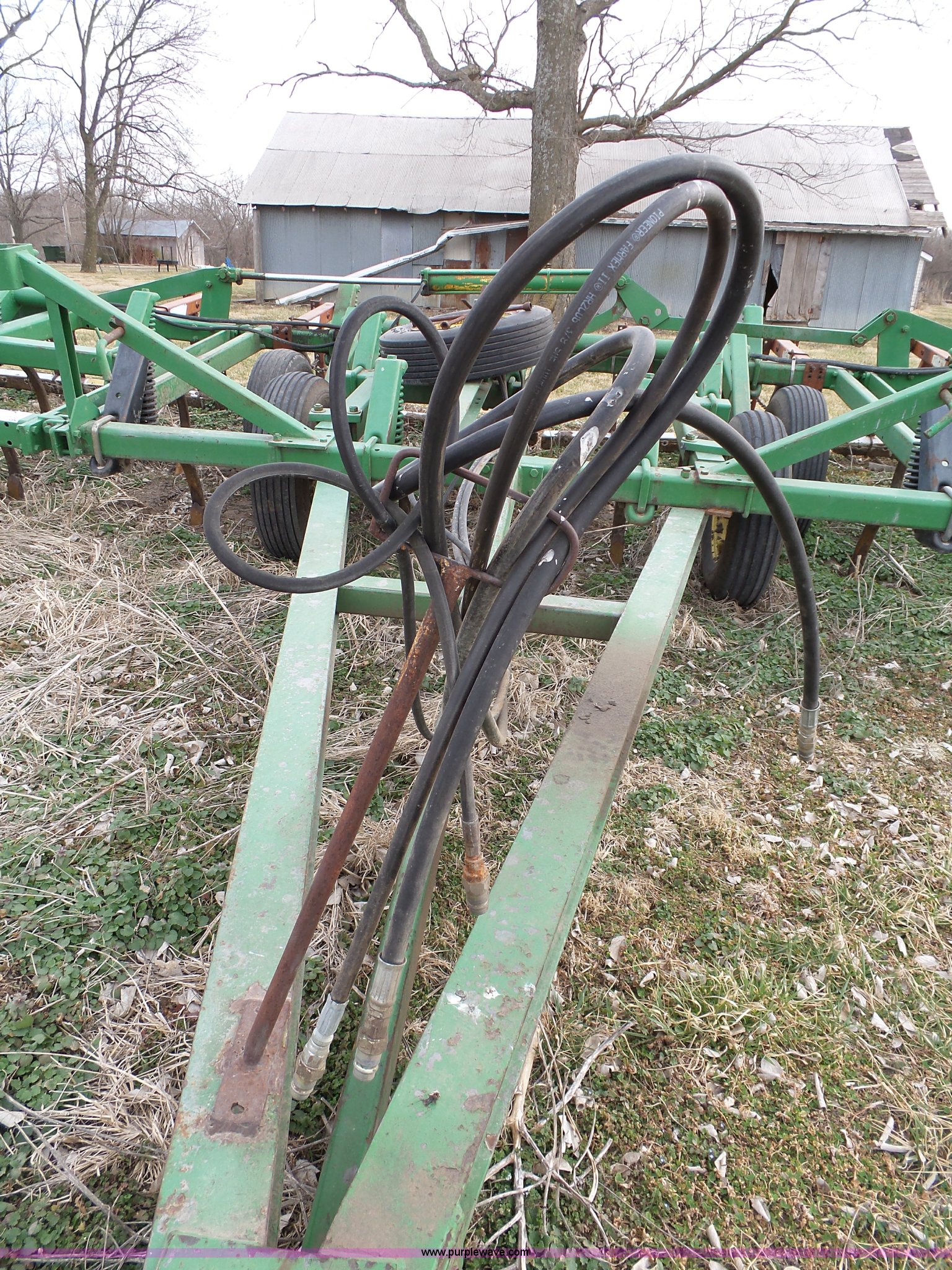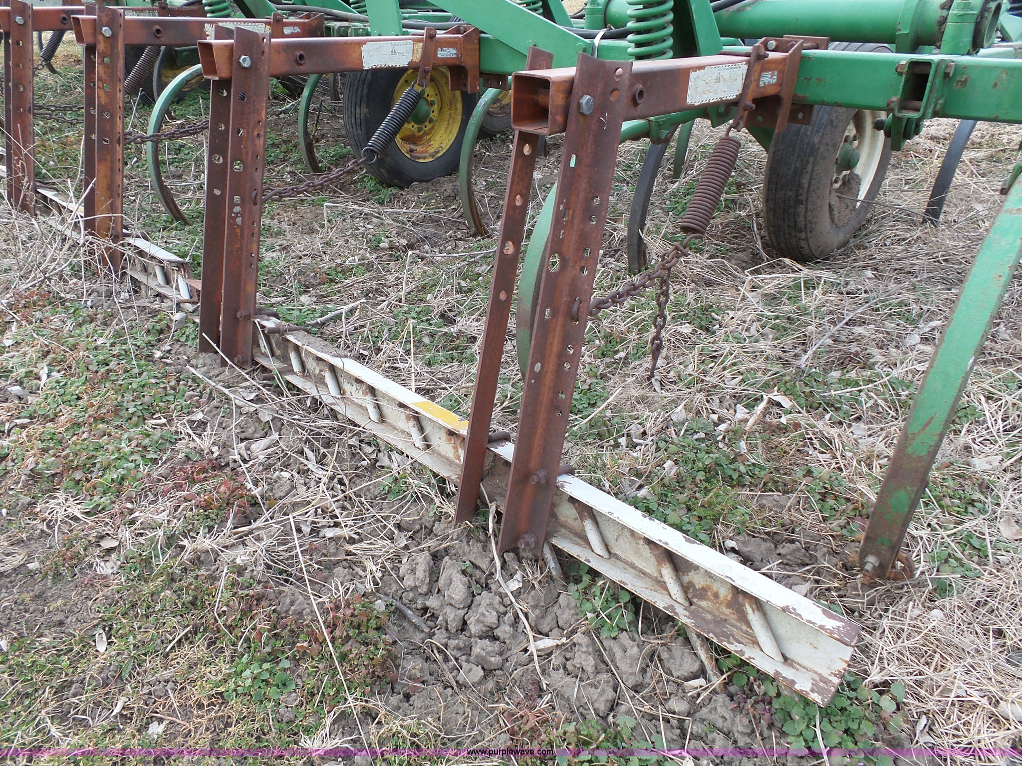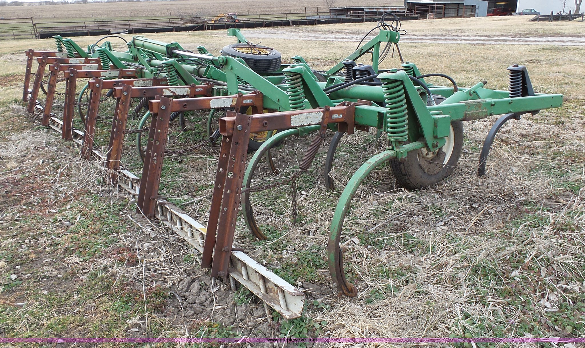 Purple Wave is selling a used Chisel in Kansas. This item is a John Deere 1600 chisel with the following: 24'W, Midwest rear harrow system, Hydraulics, Pin hitch, (6) 15" tires, Additional 15" tire, Weld repairs