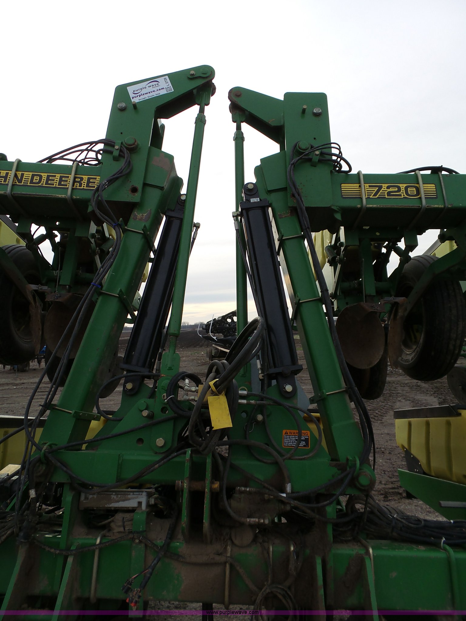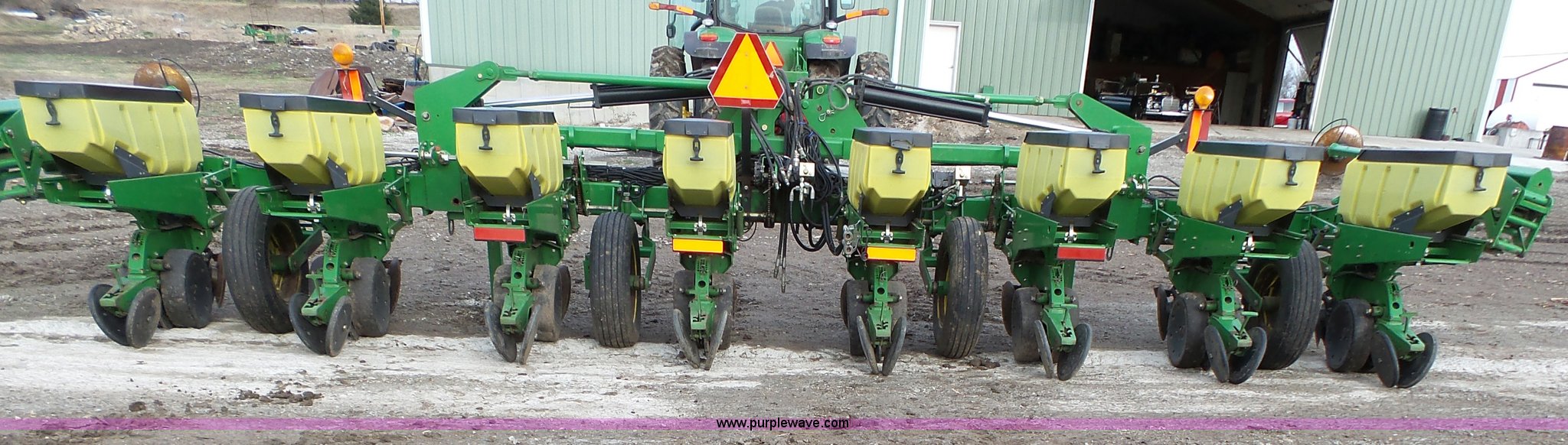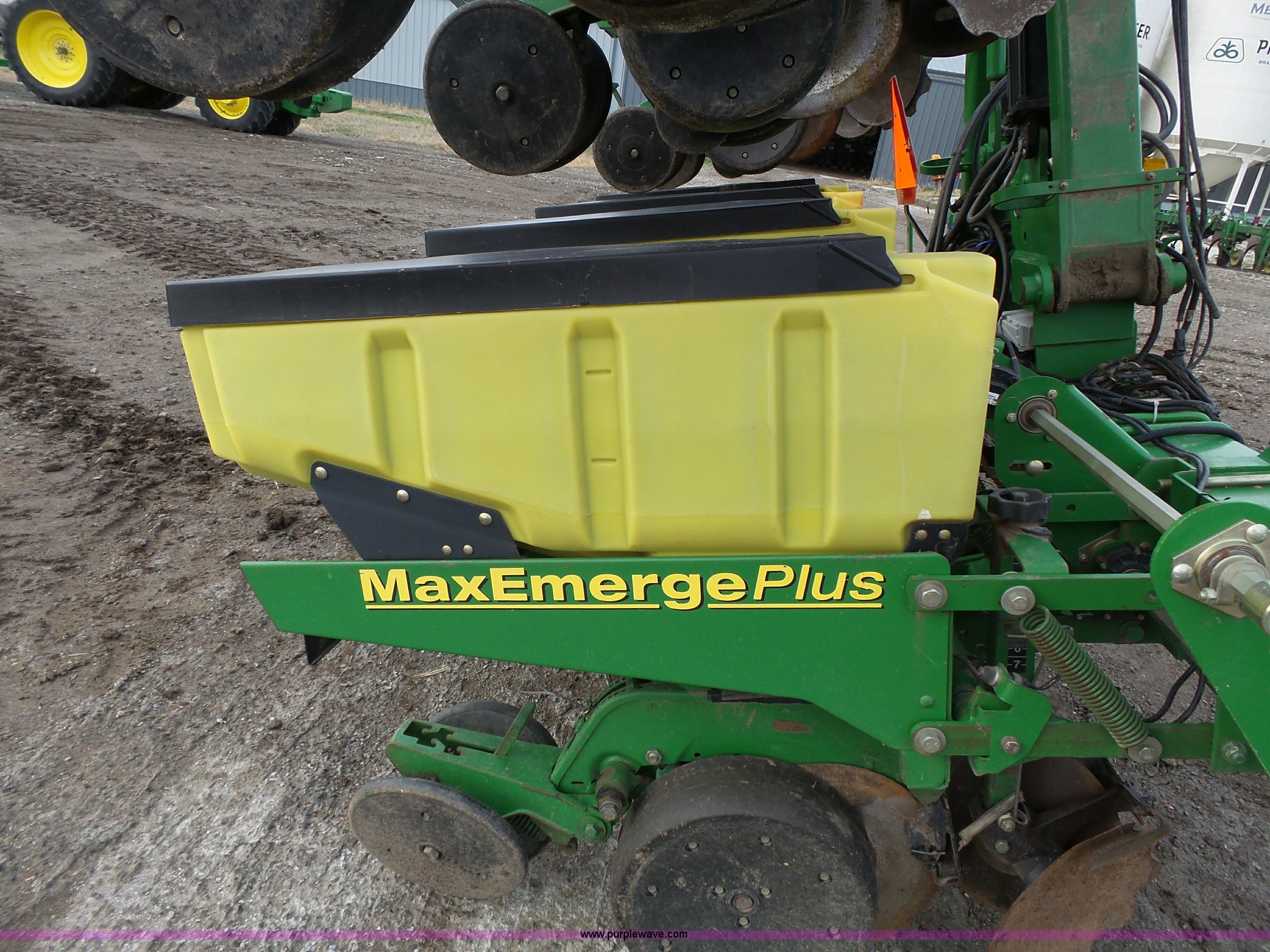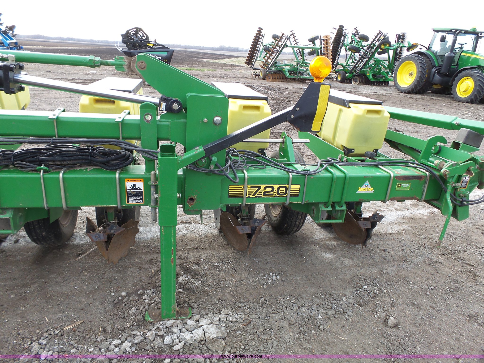 Purple Wave is selling a used Planter in Kansas. This item is a John Deere 1720 planter with the following: 25'W, Eight rows, 36" row spacing, Marker arms, Hydraulic stack fold, Max Emerge Plus individual seed hoppers, Three bushel capacity, Soybean seed meters, Double gauge wheels, Double rubber press closing system, Gen 2 equipped, Dual hydraulic driven, Used for swath control, Finger pickup units, Ridge and strip till capable, Flashers, Three point, (2) 7.60-15 transport tires, (2) 7.60-15 drive/outside tires, Additional parts included, Serial A01720R690213