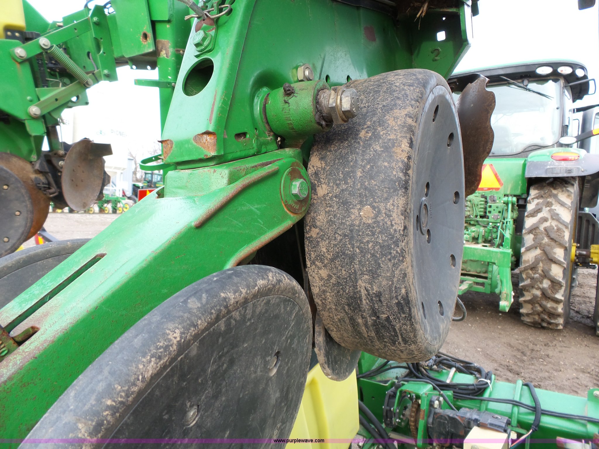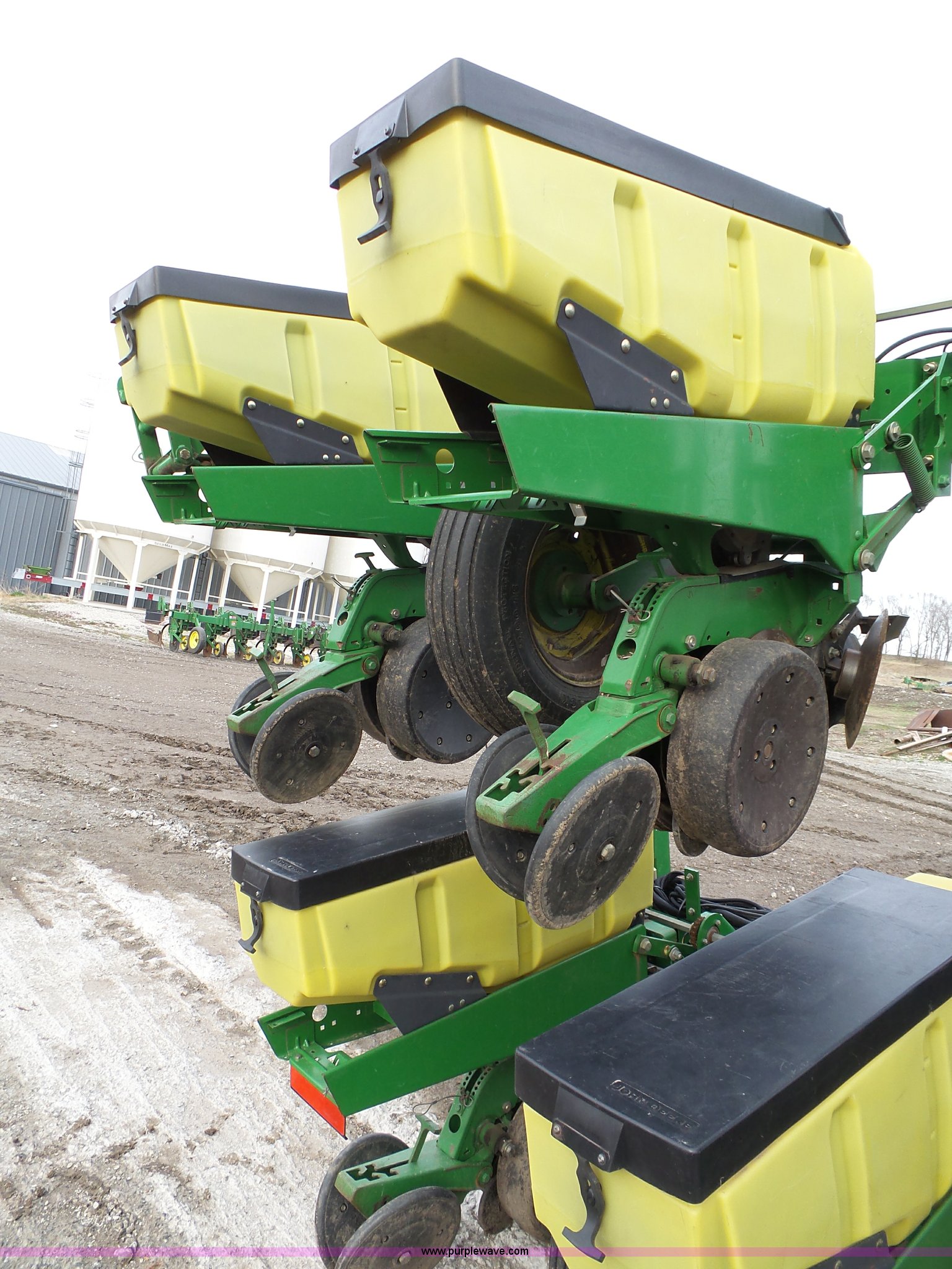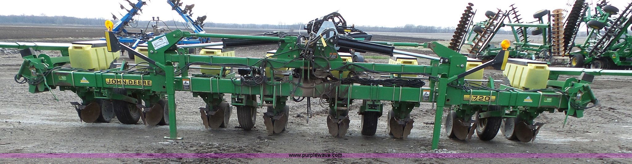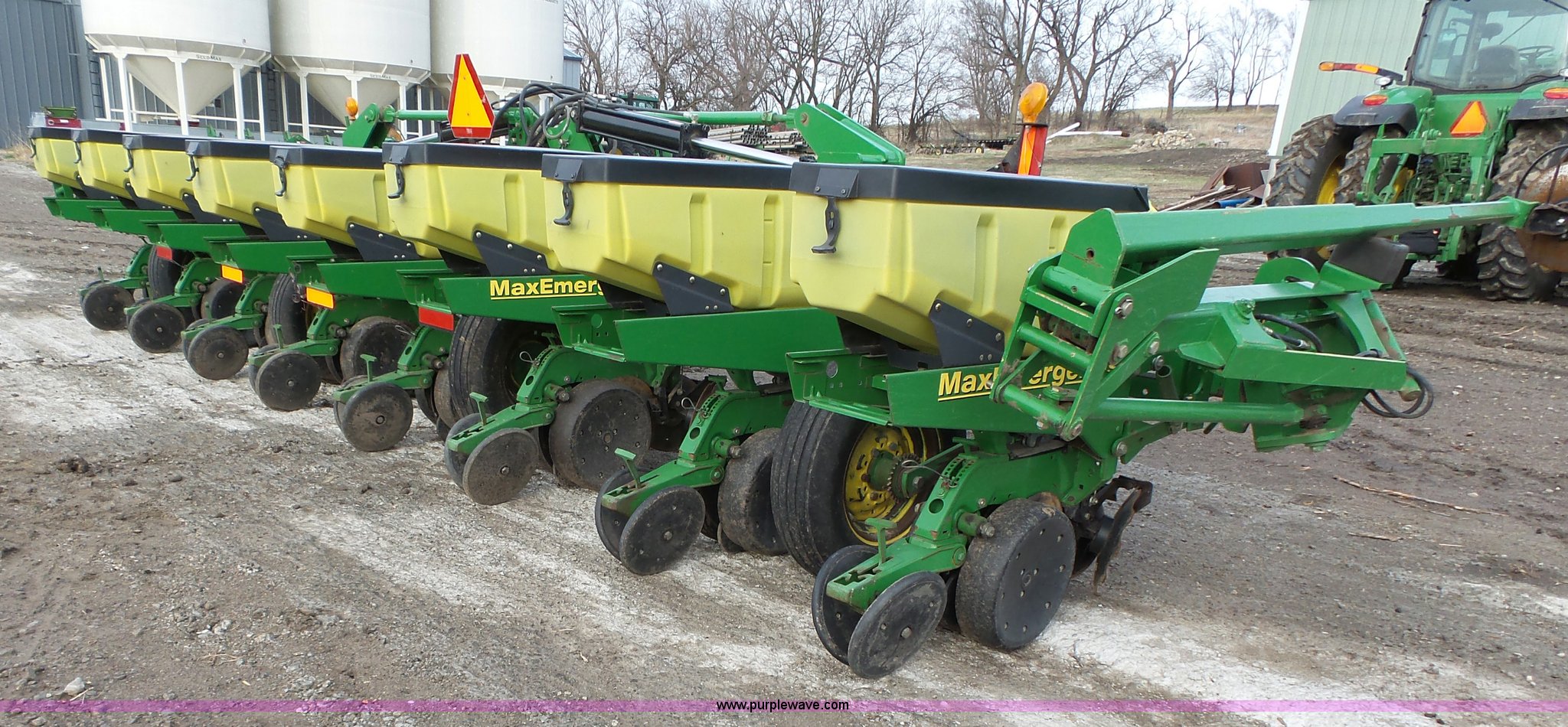 Purple Wave is selling a used Planter in Kansas. This item is a John Deere 1720 planter with the following: 25'W, Eight rows, 36" row spacing, Marker arms, Hydraulic stack fold, Max Emerge Plus individual seed hoppers, Three bushel capacity, Soybean seed meters, Double gauge wheels, Double rubber press closing system, Gen 2 equipped, Dual hydraulic driven, Used for swath control, Finger pickup units, Ridge and strip till capable, Flashers, Three point, (2) 7.60-15 transport tires, (2) 7.60-15 drive/outside tires, Additional parts included, Serial A01720R690213