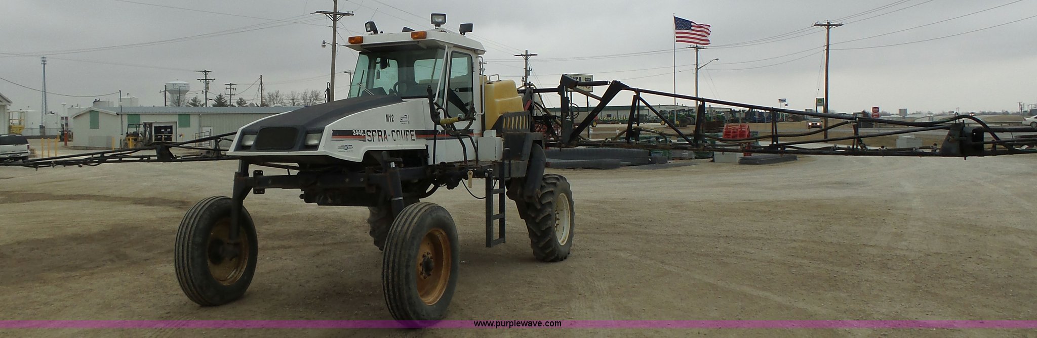 Purple Wave is selling a used Applicator Self Propelled in Missouri. This item is a 1998 SpraCoupe 3440 self-propelled sprayer with the following: 2,150 hours on meter, Perkins four cylinder turbo diesel engine, Manual transmission, 5F-1R gears, AC and heat, AM/FM, Suspension seat, Work lights, 300 gallon poly solution tank, 45 gallon poly rinse tank, 65'W boom, Five boom sections, Hydraulic boom fold, 20" nozzle spacing, Single nozzle bodies, Raven 440 spray controls, Hydraulic axle width adjust, 9.00-24 front row crop tires, 12.4-24 rear row crop tires, Hydraulic leak on steel line, Serial 209911354