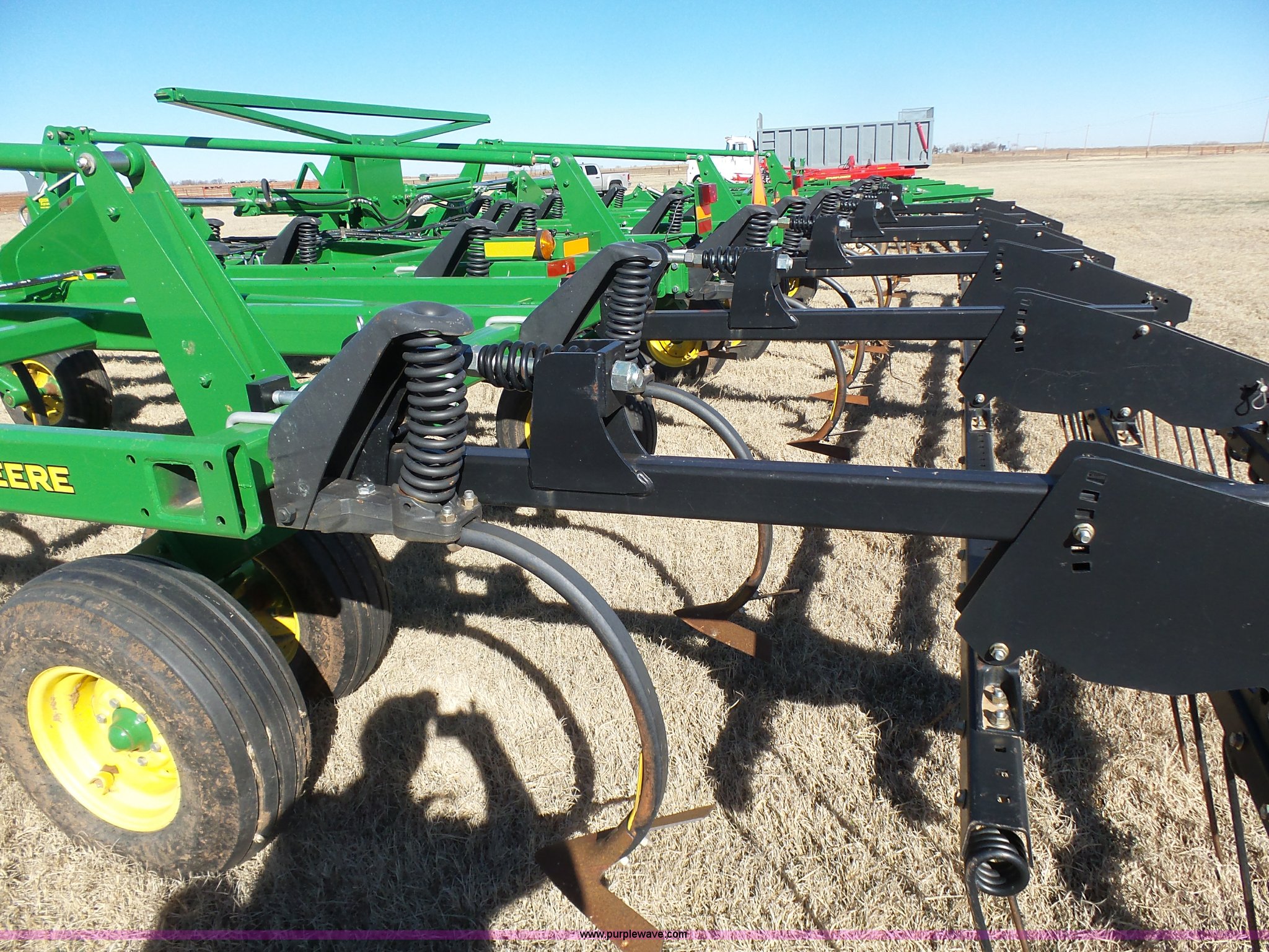 Purple Wave is selling a used Plow in Oklahoma. This item is a John Deere 2410 chisel plow with the following: 27'W, Three section, Spring flex C-shanks, 17" sweeps, Single point depth control, Hydraulic lift and fold, Three bar coil tine harrow, Transport lights, Floating slab hitch, Gauge wheels, Walking tandem dual wheels, 9.5L-15 tires, Serial 1N02410XJD0755113