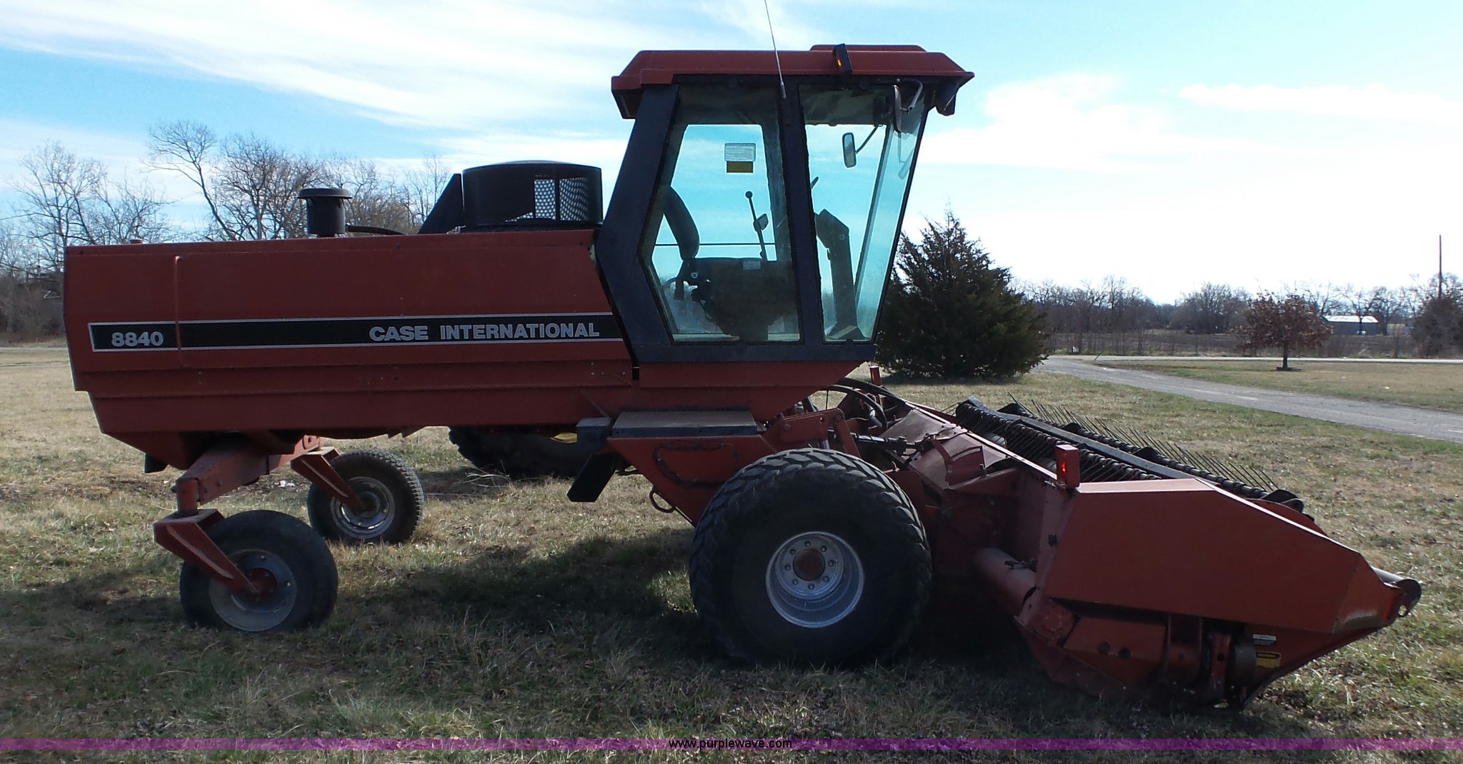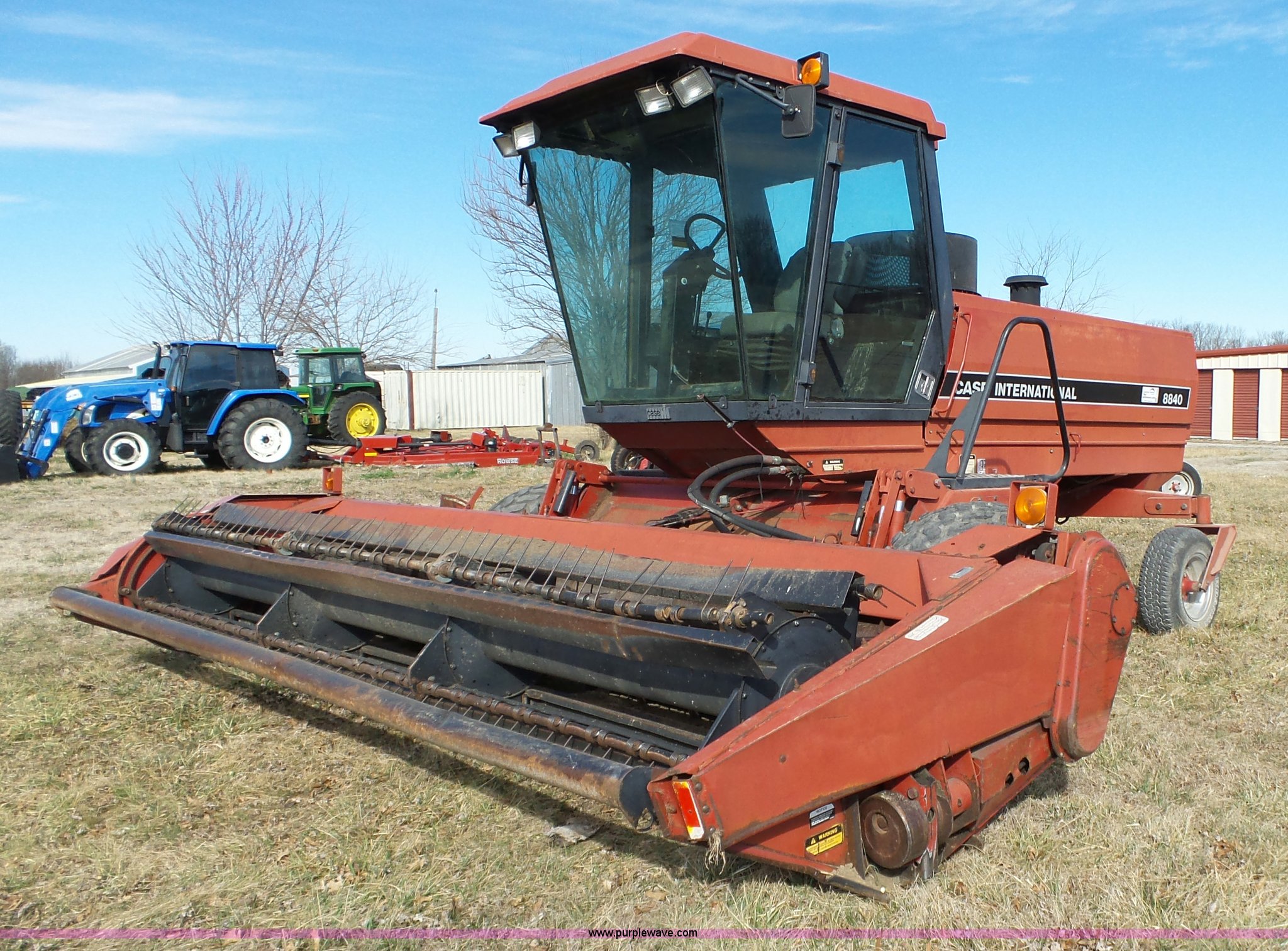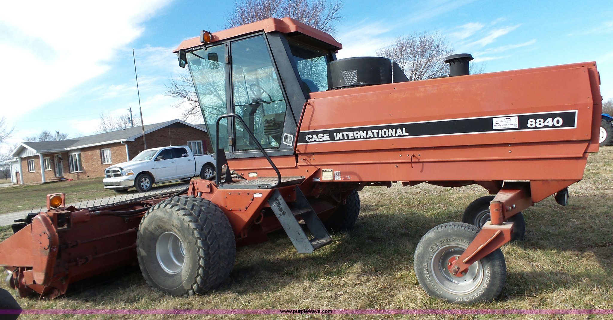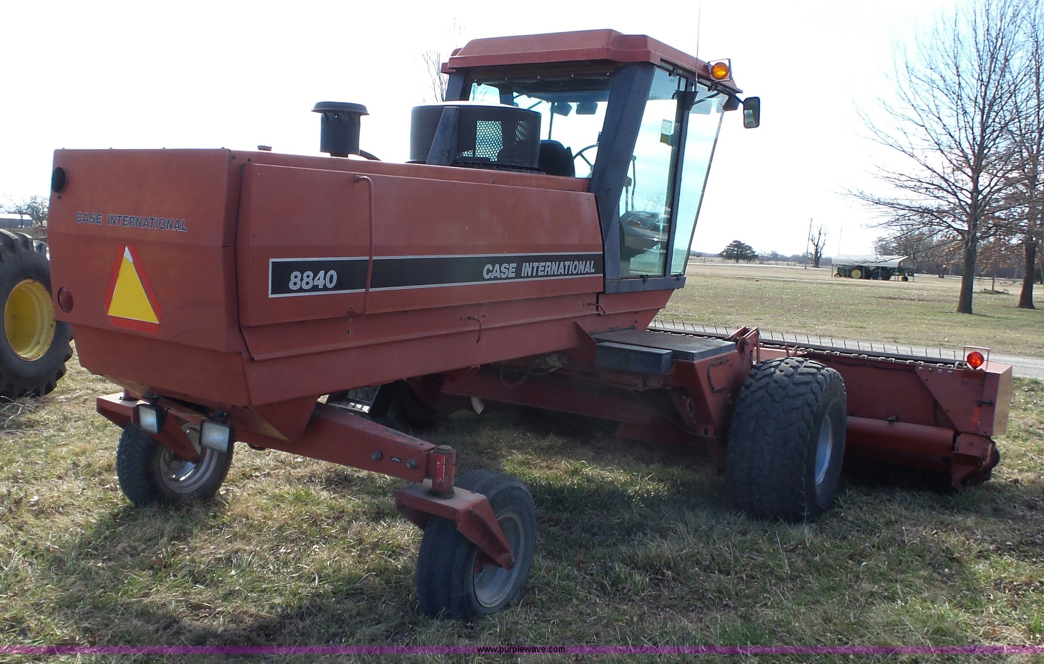 Purple Wave is selling a used Windrower Self Propelled in Kansas. This item is a 1994 Case IH 8840 self-propelled windrower with the following: 1,226 hours on meter, Case IH 4T-390 four cylinder turbo diesel engine, Serial 44966982, Hydrostatic transmission, AC and heat, AM/FM, Air suspension seat, Work lights, J.I. Case 8840 16'W sickle head, Steel/steel conditioners, Serial CFH0095158, 21.5L-16.1 front tires, 15" rear tires, Serial CFH0086293