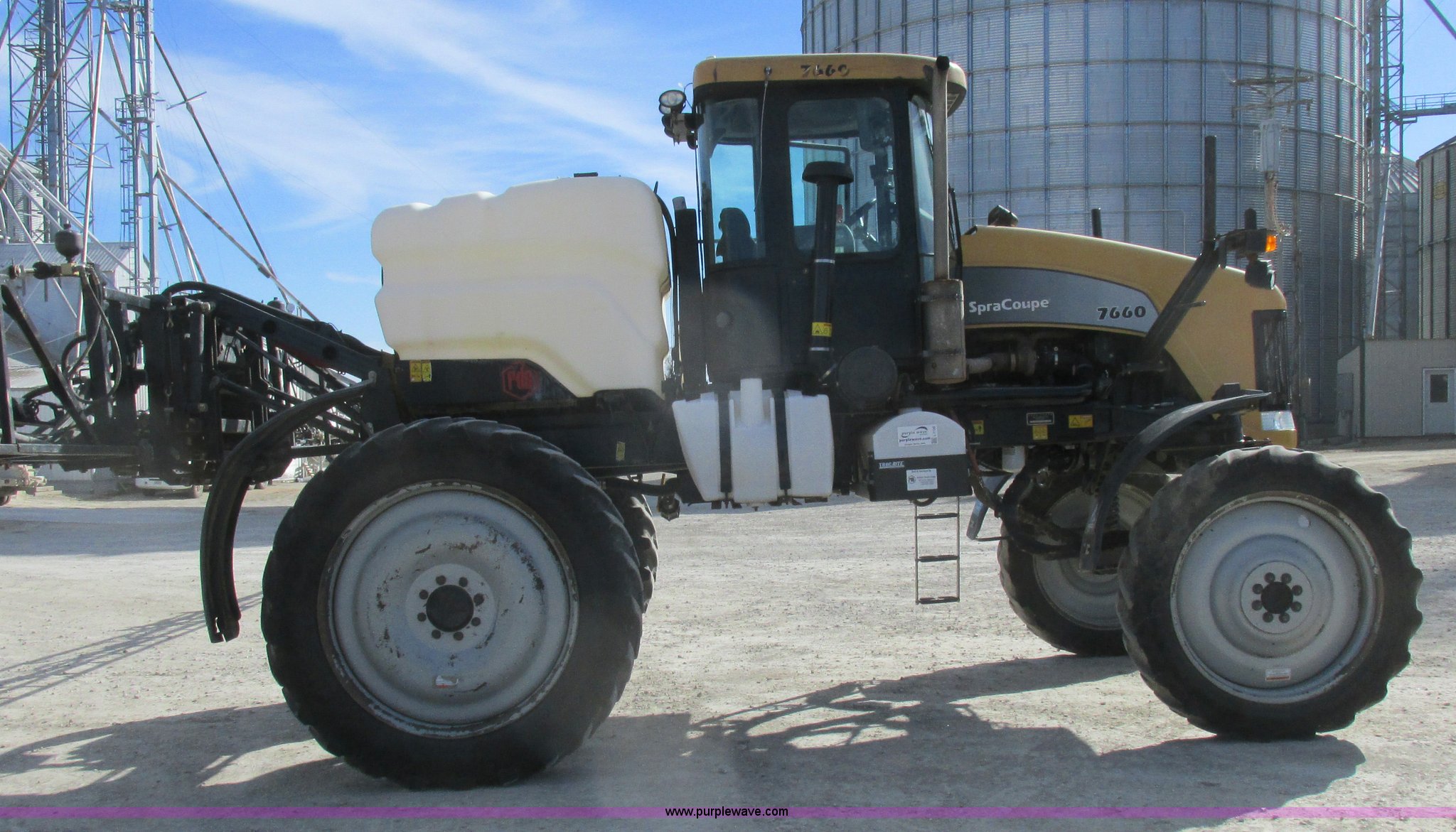 Purple Wave is selling a used Applicator Self Propelled in Missouri. This item is a 2010 SpraCoupe 7660 self-propelled applicator with the following: 3,488 hours on meter, Perkins six cylinder turbo diesel engine, Hydrostatic transmission, Four wheel drive, 725 gallon poly solution tank, Chemical eductor, Foam marker, Clean water tank, 90'W boom, Five boom sections, Hydraulic boom fold, 20" nozzle spacing, Three-way nozzle bodies, AC and heat, AM/FM, Air suspension seat, Work lights, Lightbar, Raven Viper Pro GPS monitor, GPS receiver, Auto steer, Rear view camera, 320/85R38 front tires, 380/90R46 rear tires, Serial AGCS7660VNV8P2009