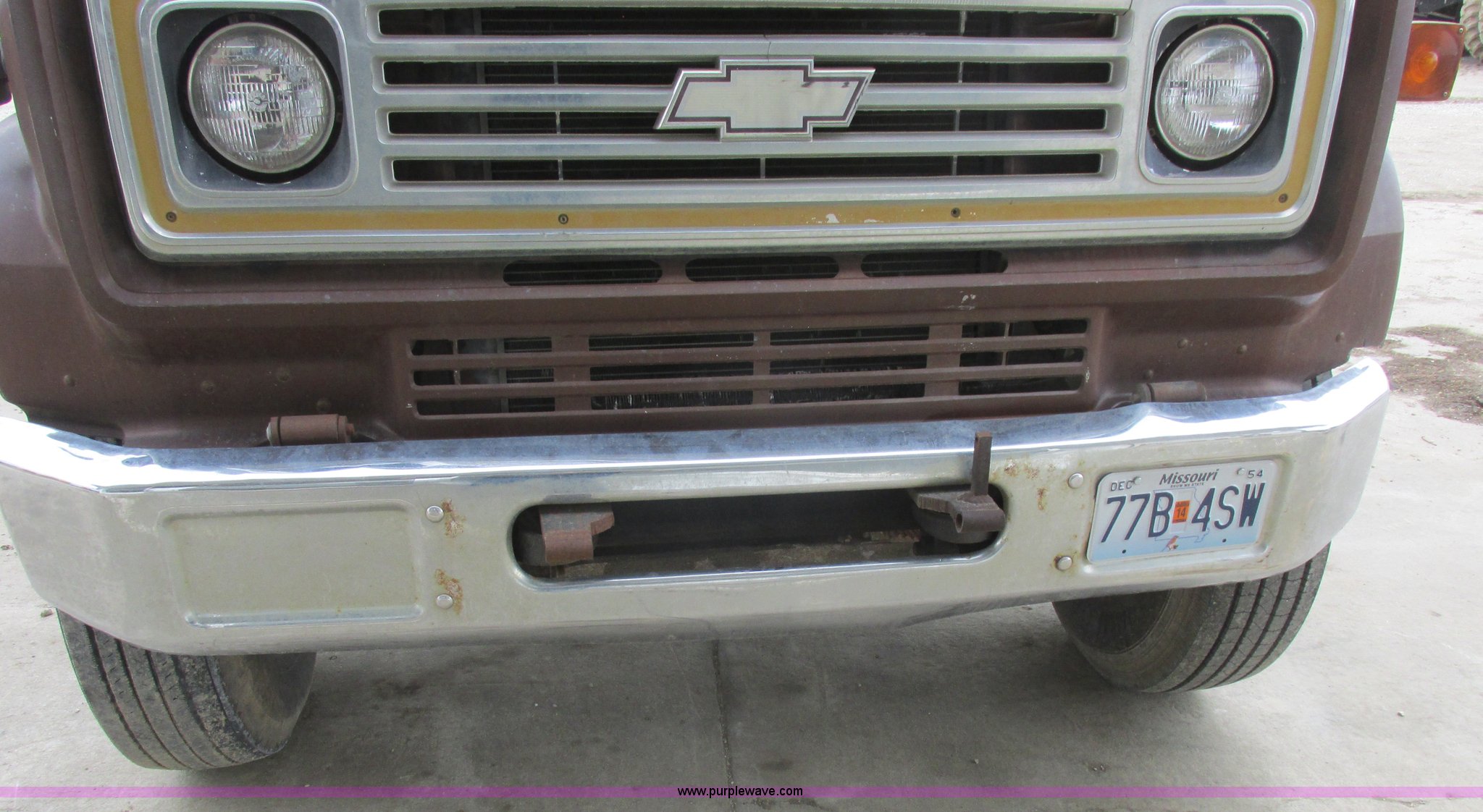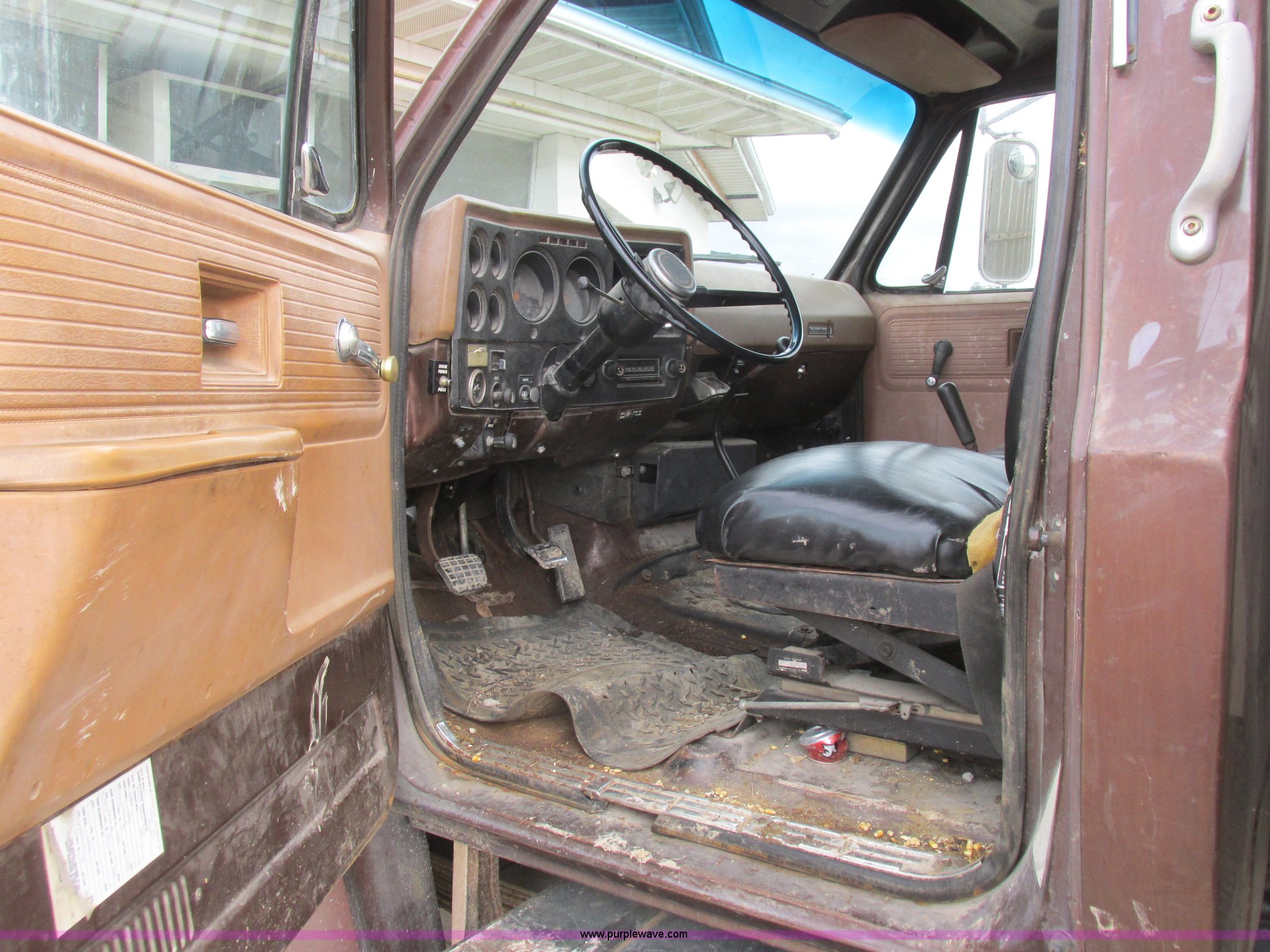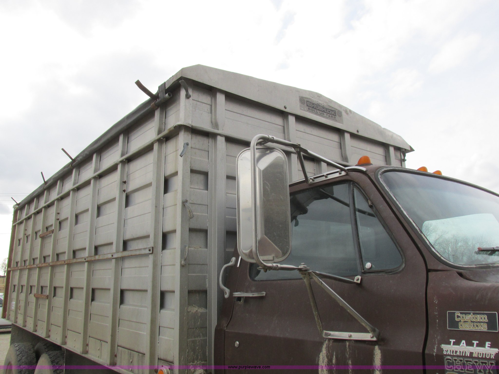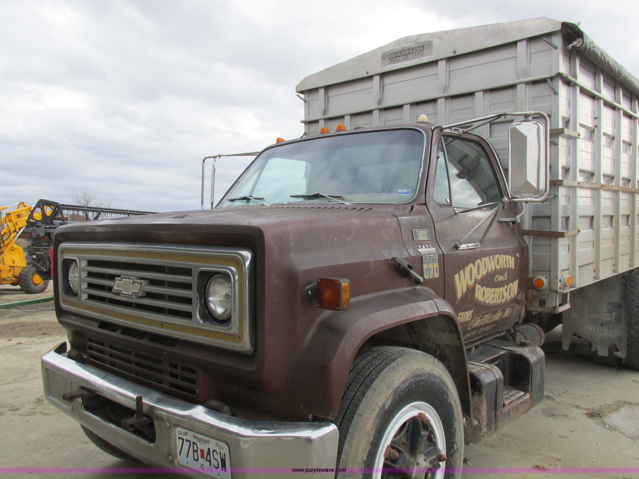 Purple Wave is selling a used Grain Truck in Missouri. This item is a 1979 Chevrolet C70 grain truck with the following: 86,715 miles on odometer, Eight cylinder gas engine, Five speed manual transmission, Tandem axle, Heat, AM, Suspension seat, PTO, 18'L x 8'W aluminum grain bed, 70" side height, Rollover tarp, Manual end gate, Dual fuel tanks, Pin hitch, Trailer wiring, Spring suspension, Hydraulic brakes, 11R22.5 tires, GVWR 40,500 lbs