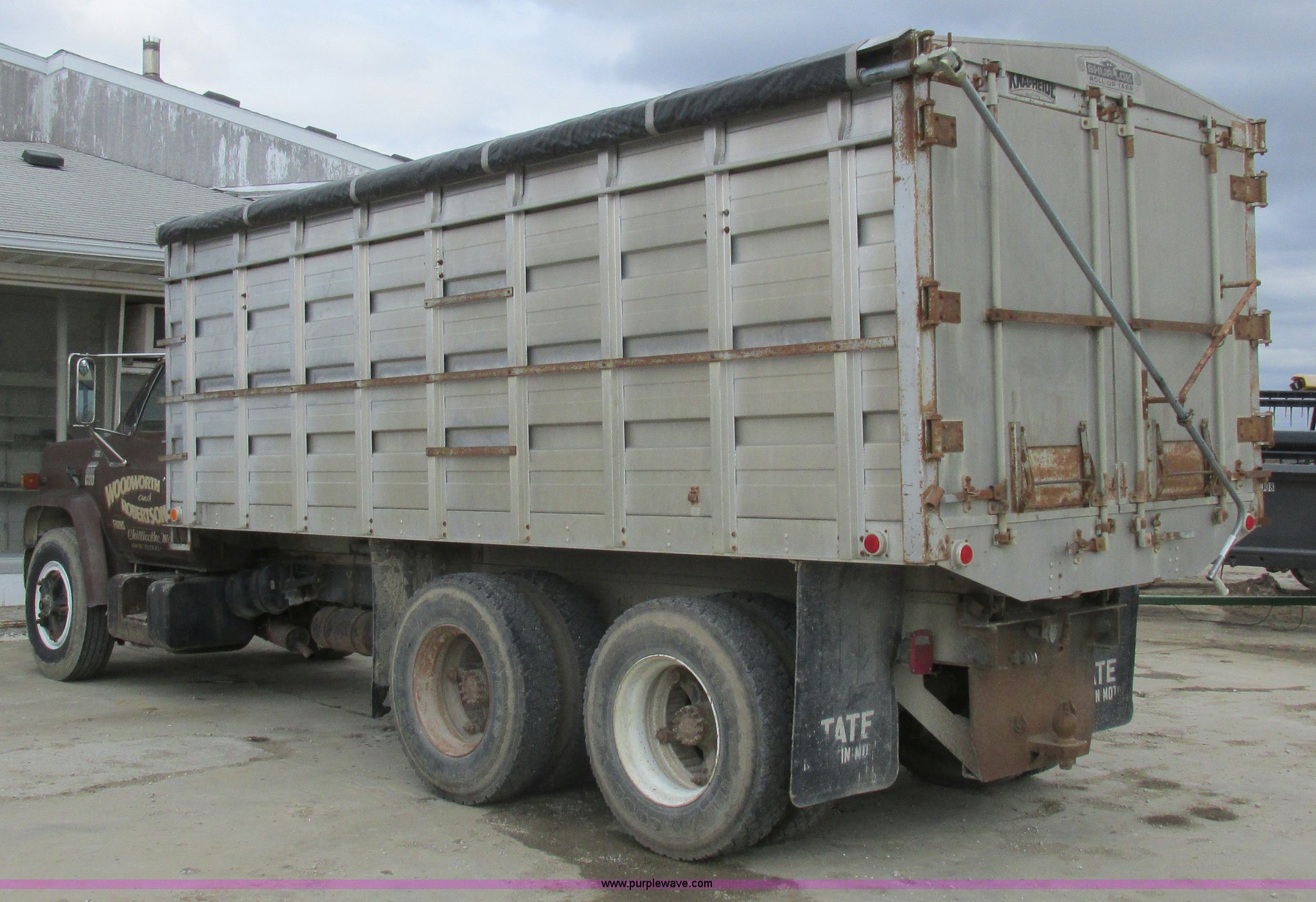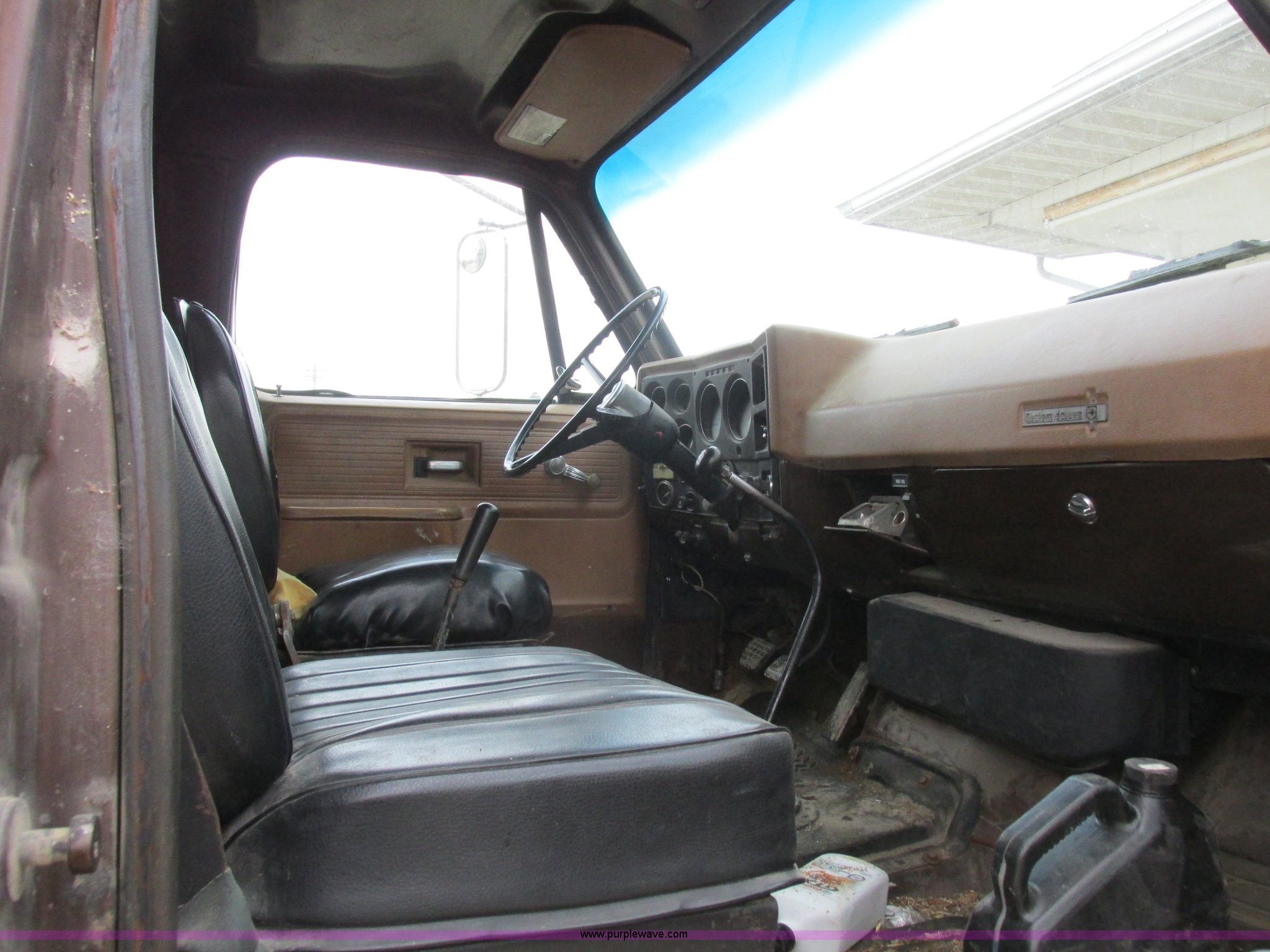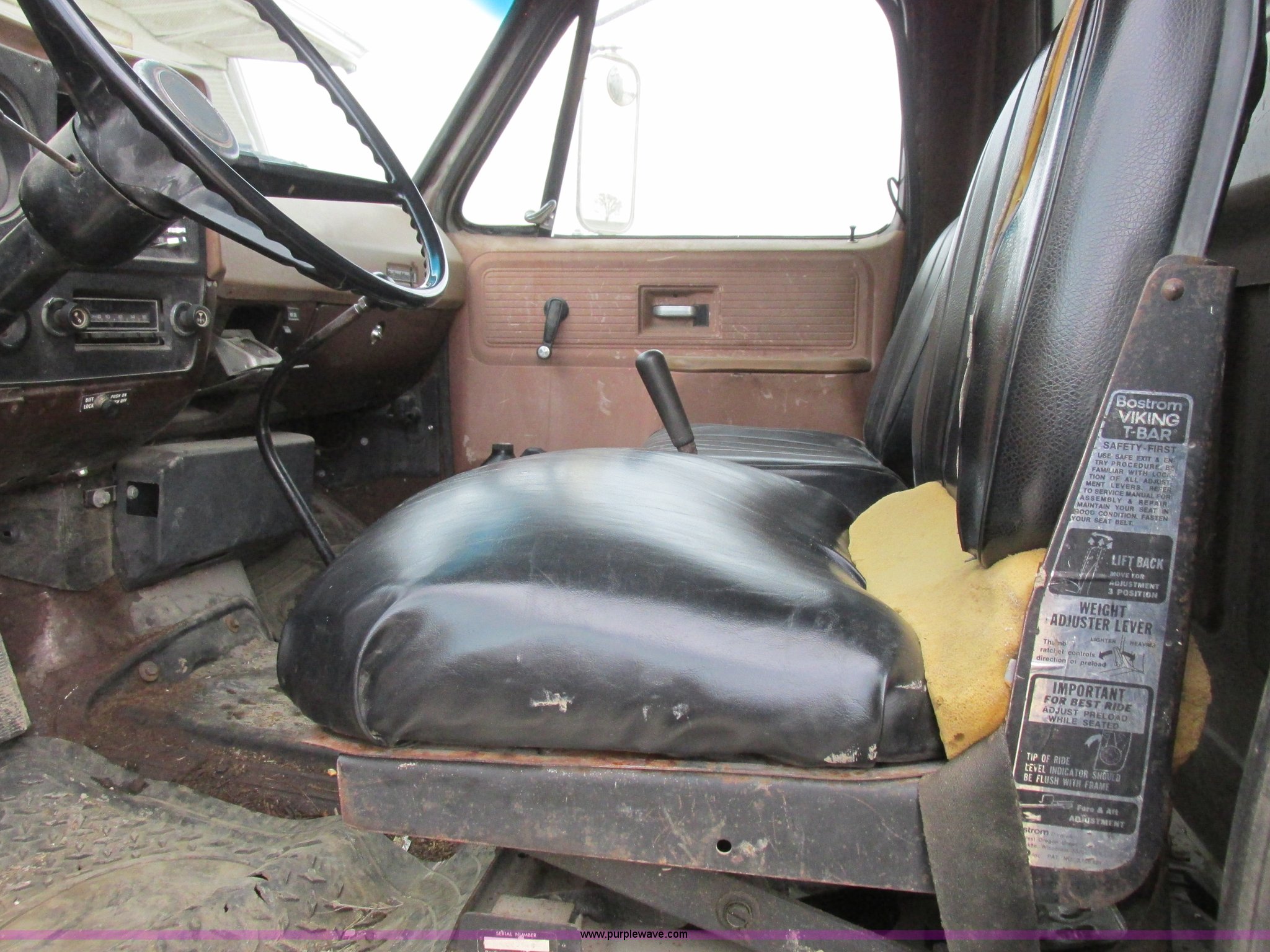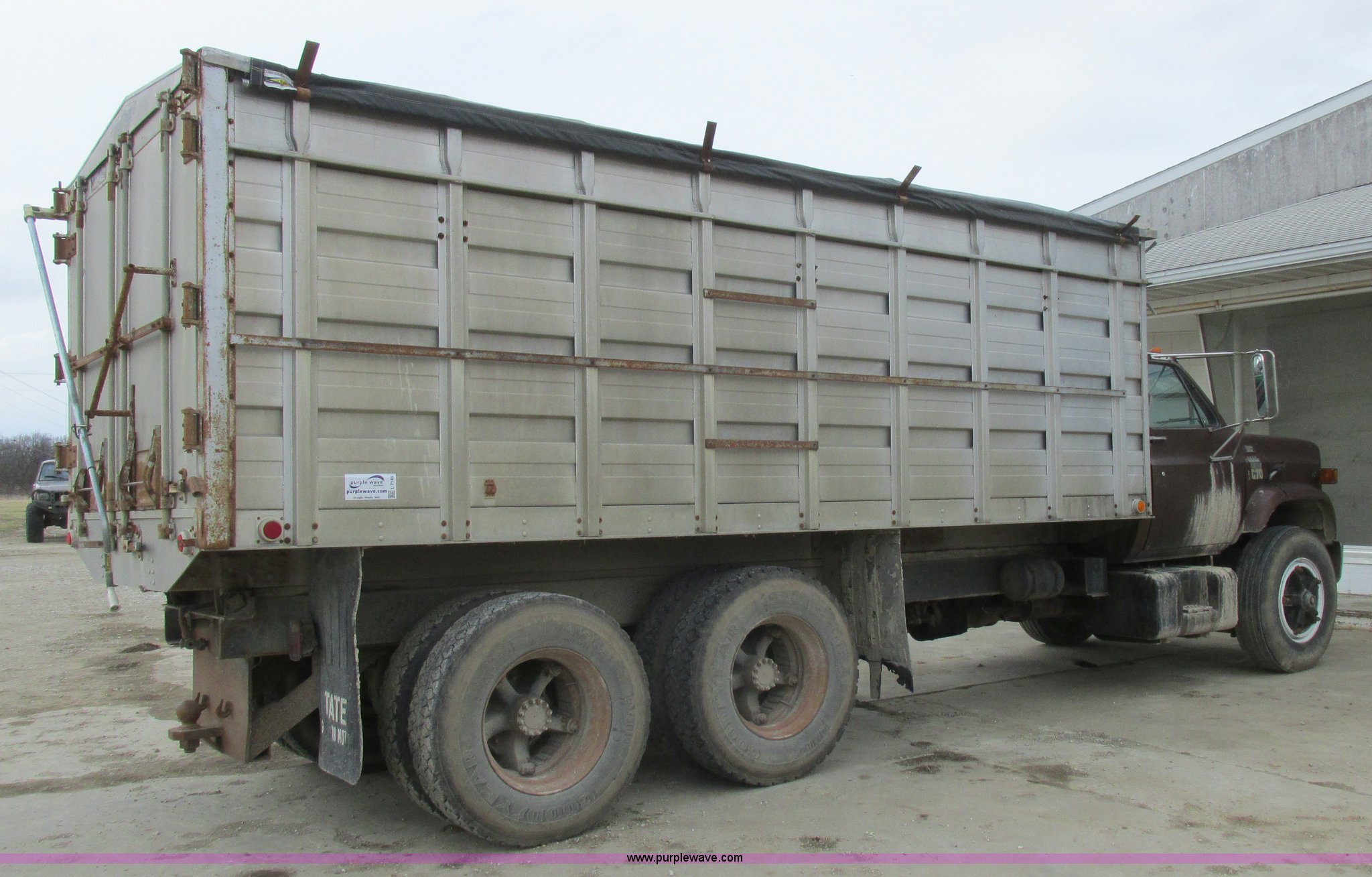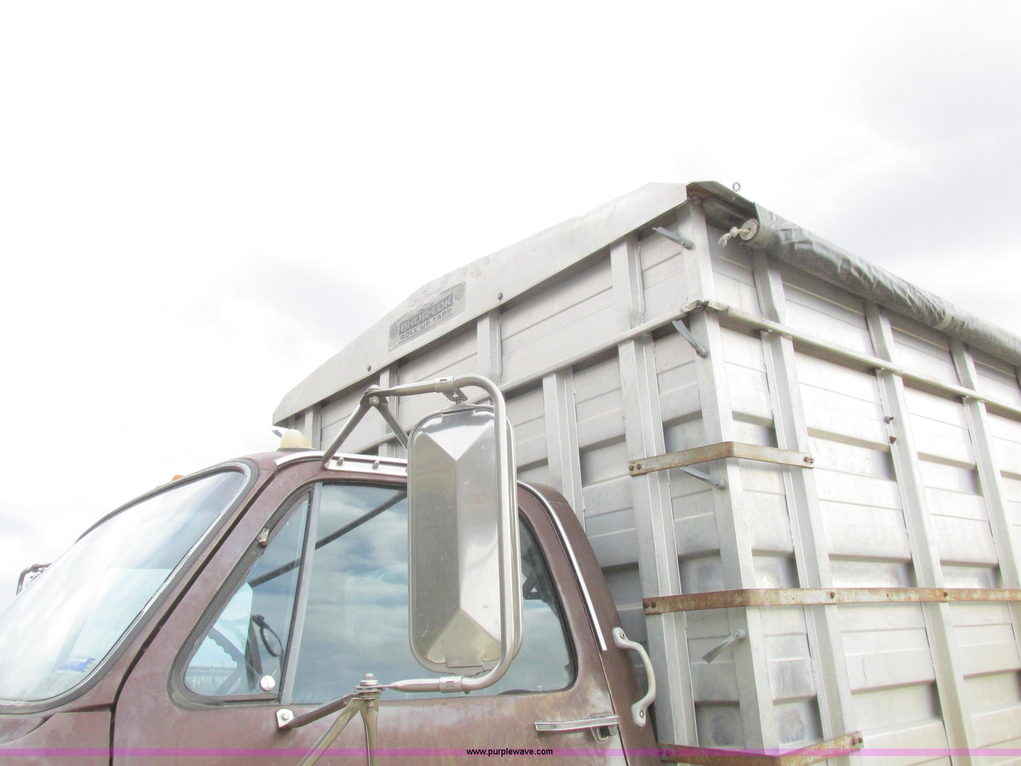 Purple Wave is selling a used Grain Truck in Missouri. This item is a 1979 Chevrolet C70 grain truck with the following: 86,715 miles on odometer, Eight cylinder gas engine, Five speed manual transmission, Tandem axle, Heat, AM, Suspension seat, PTO, 18'L x 8'W aluminum grain bed, 70" side height, Rollover tarp, Manual end gate, Dual fuel tanks, Pin hitch, Trailer wiring, Spring suspension, Hydraulic brakes, 11R22.5 tires, GVWR 40,500 lbs