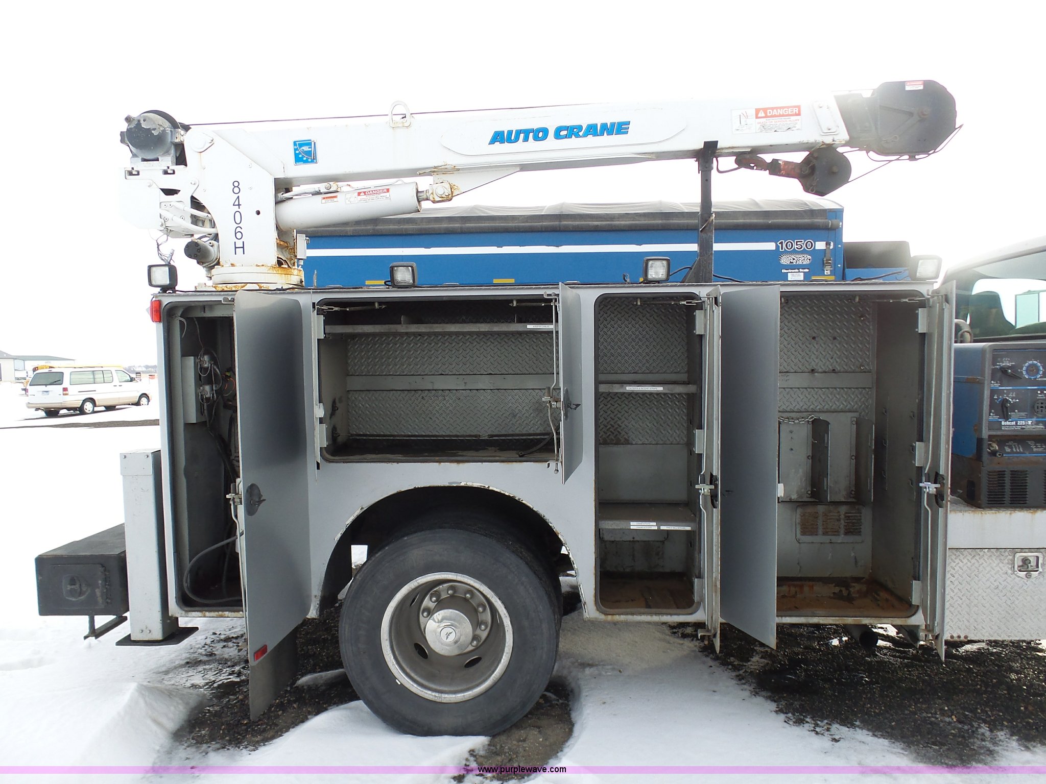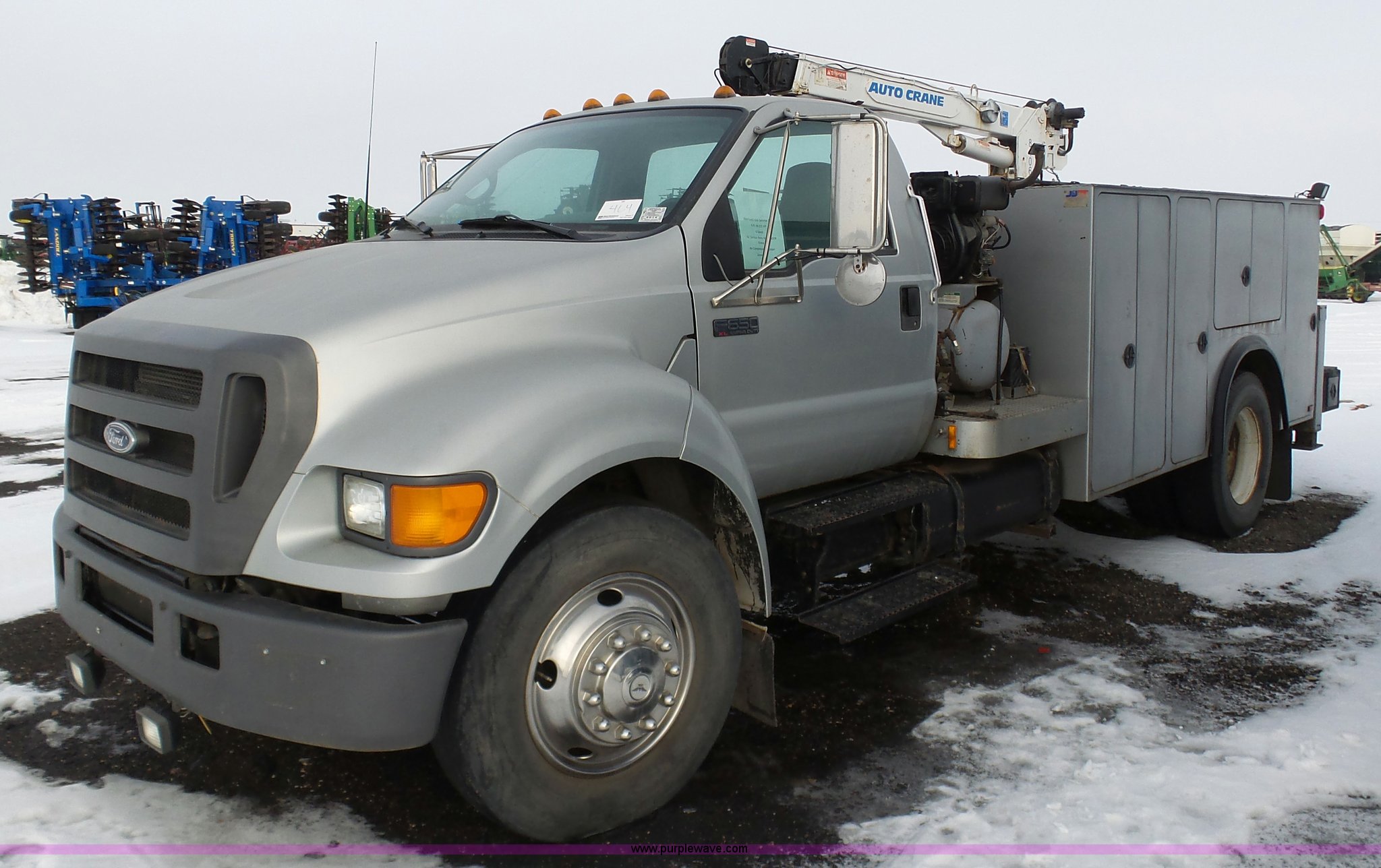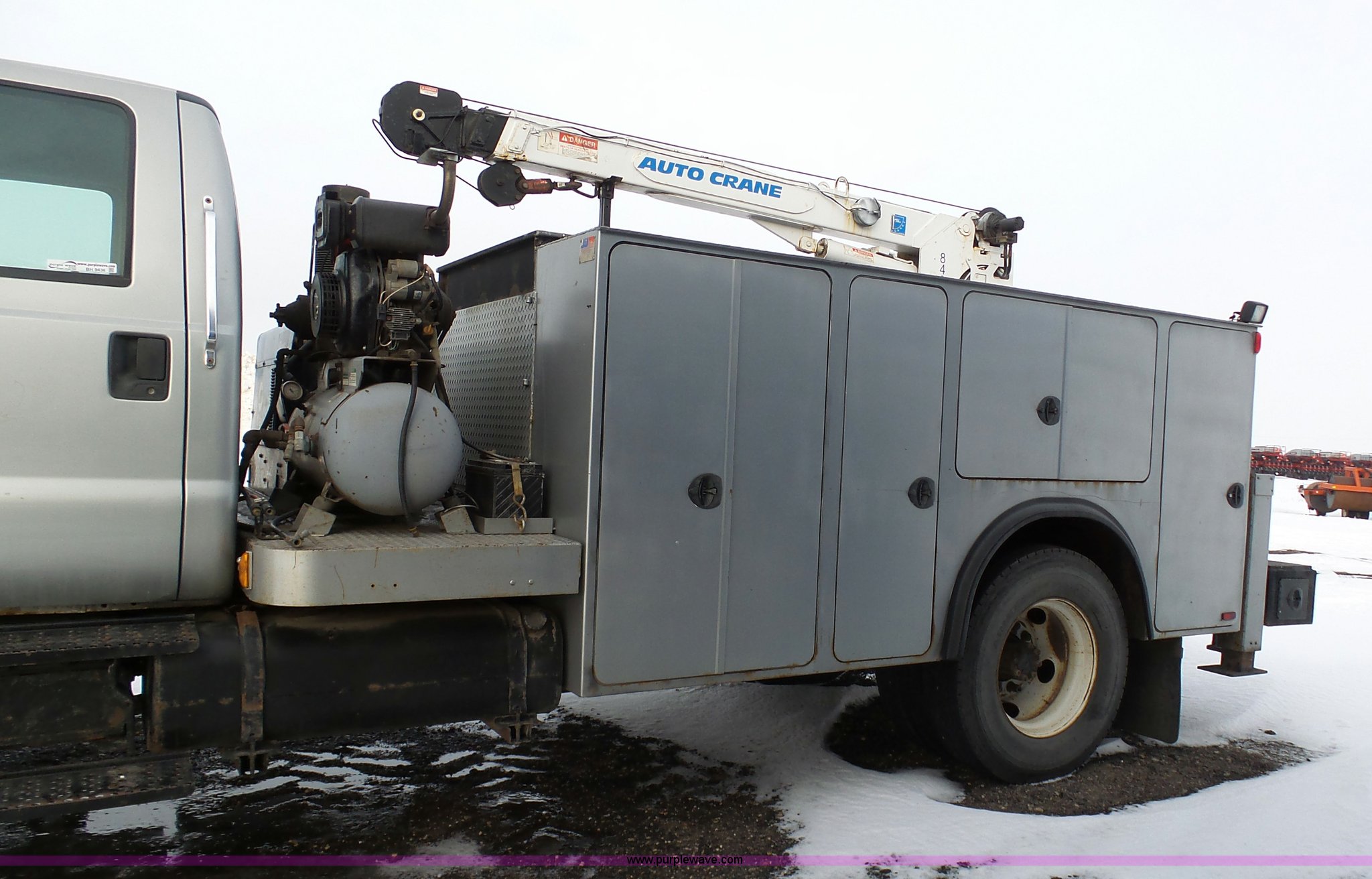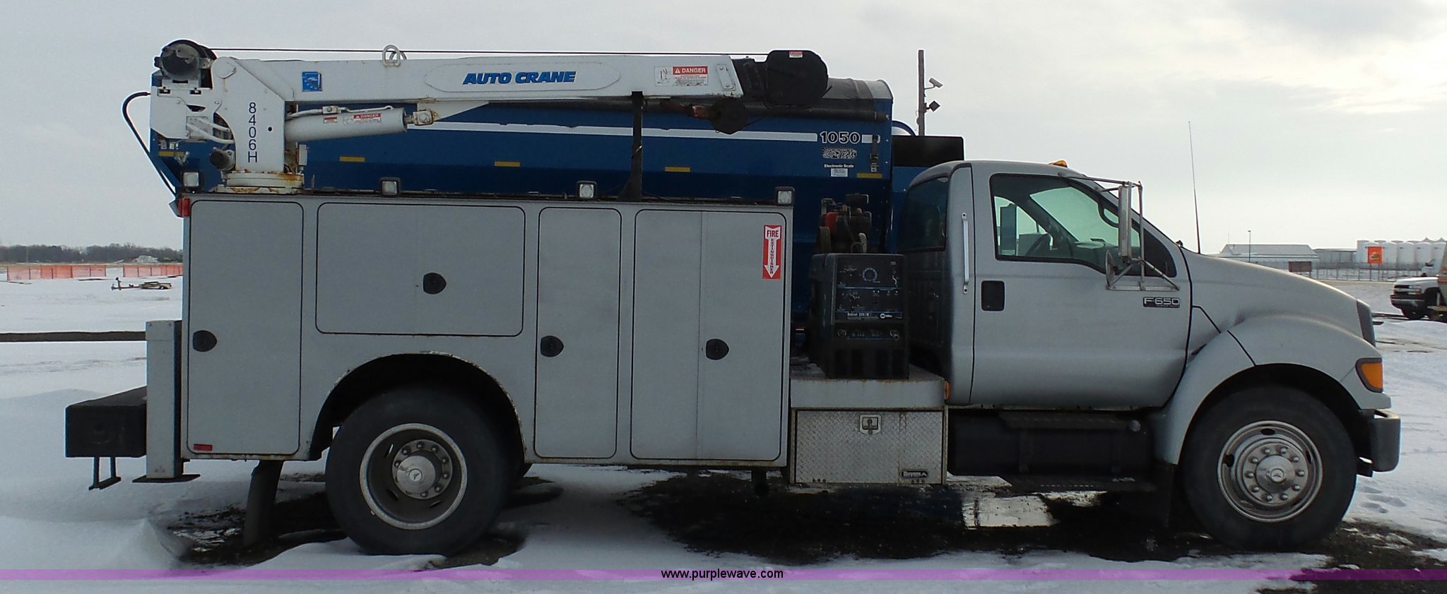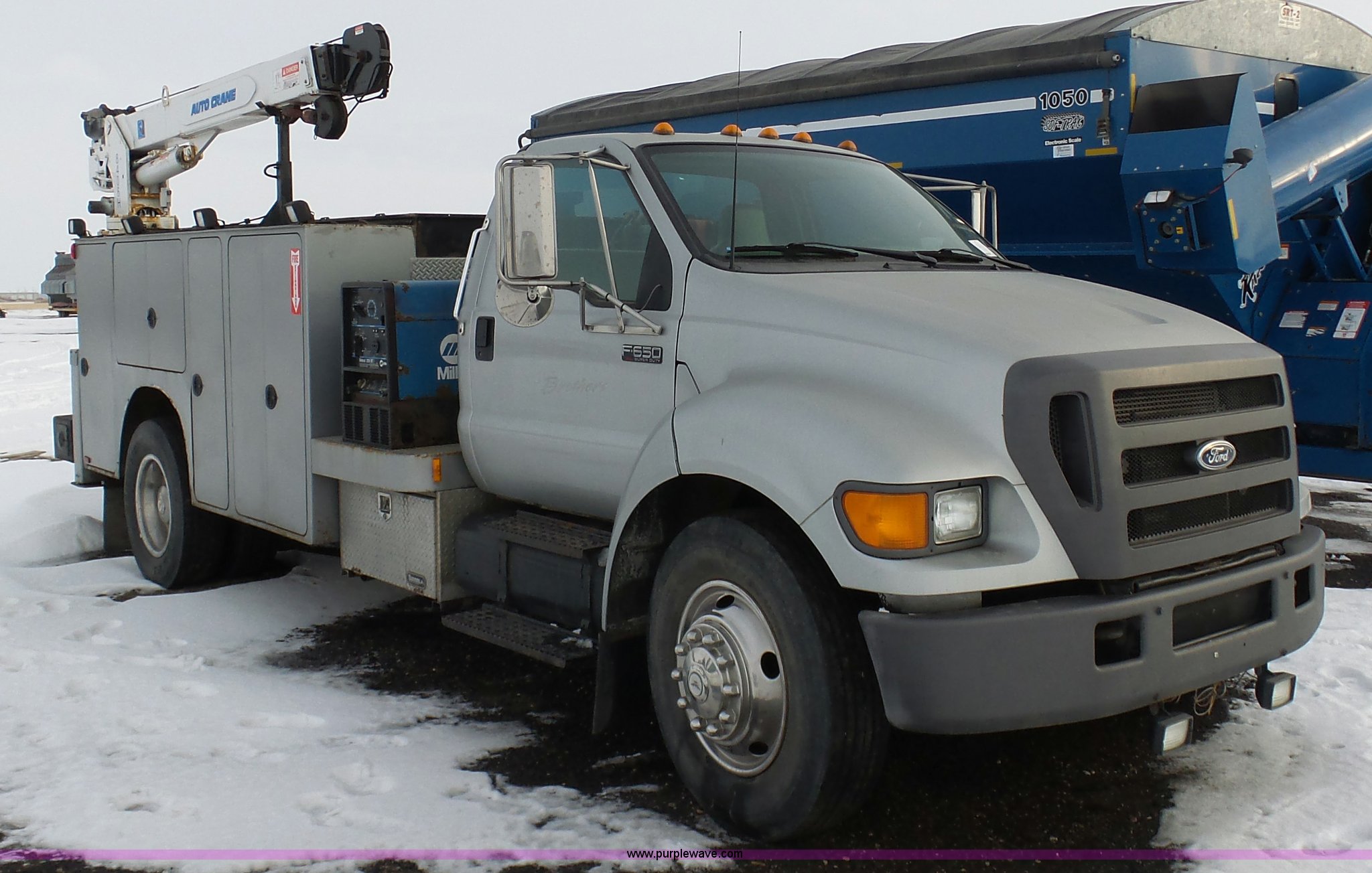 Purple Wave is selling a used Service Truck in South Dakota. This item is a 2004 Ford F650 Super Duty service truck with crane with the following: 270,071 miles on odometer, Cummins ISB 5.9L L6 turbo diesel engine, Six speed manual transmission, AC and heat, Cruise, AM/FM, Spring suspension seat, PTO, Service bed, Shelving, Slide out drawers, Work lights, Miller Bobcat 225NT welder/generator, 328 hours on meter, 240V outlet, (4) 120V outlets, Gardner Denver air compressor, Auto Crane 8406H crane, 8,000 lbs maximum lift capacity, Remote control, Outriggers, Receiver hitch, Spring suspension, Hydraulic brakes, 295/75R22.5 tires