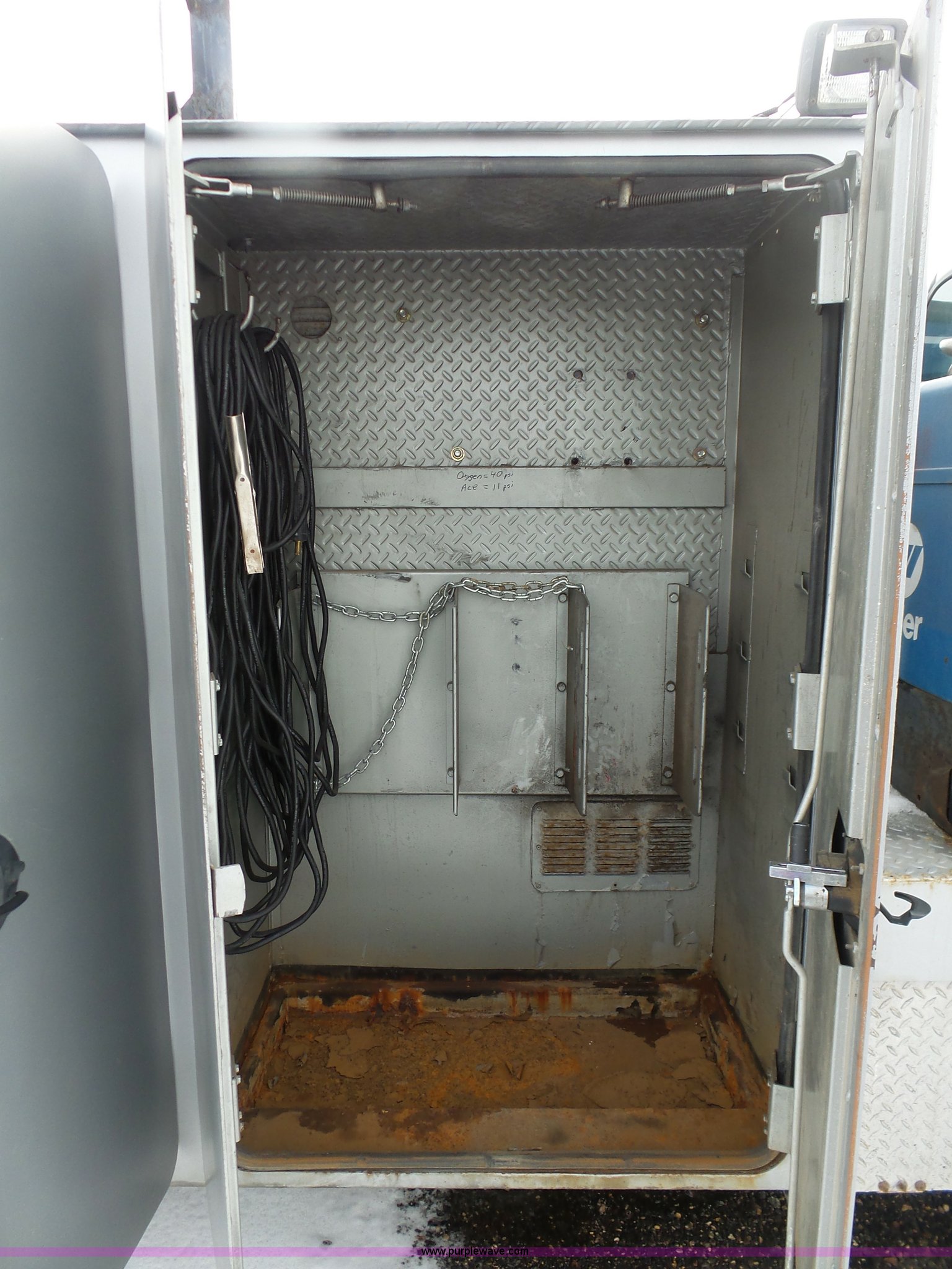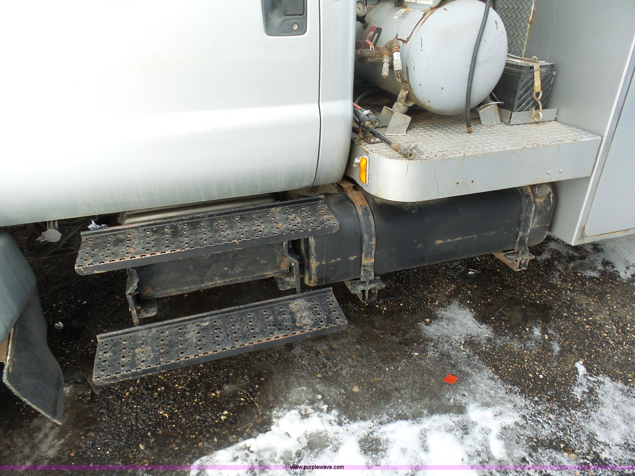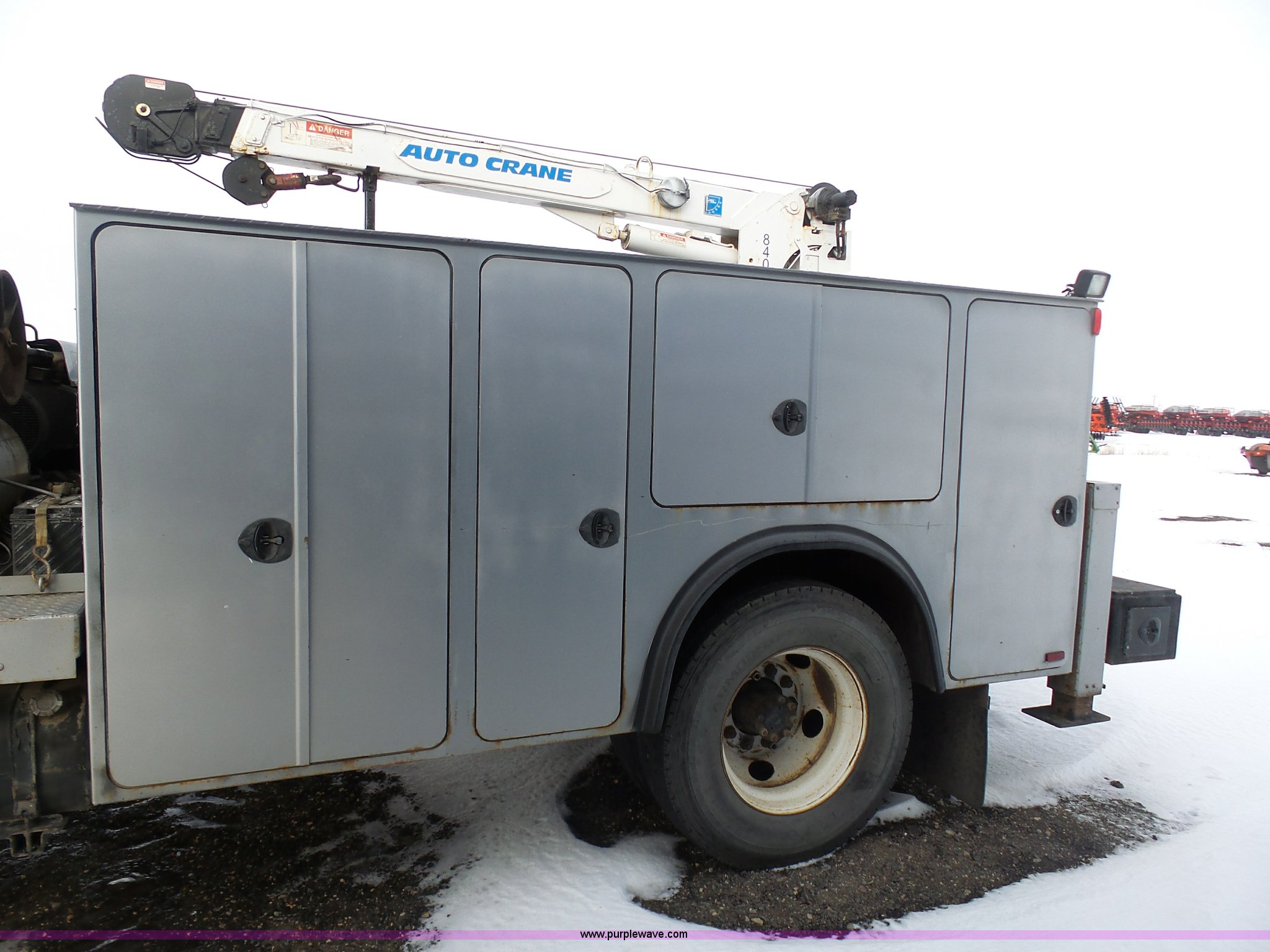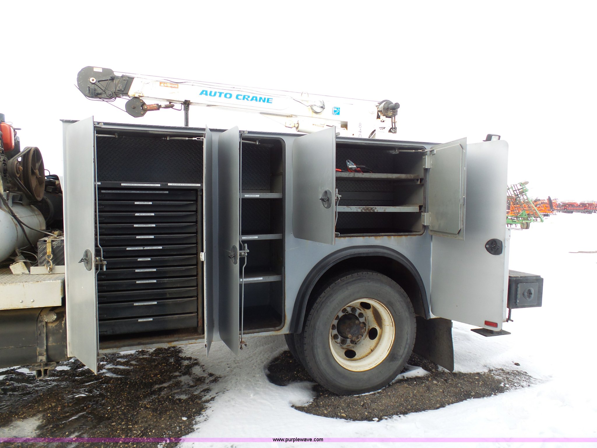 Purple Wave is selling a used Service Truck in South Dakota. This item is a 2004 Ford F650 Super Duty service truck with crane with the following: 270,071 miles on odometer, Cummins ISB 5.9L L6 turbo diesel engine, Six speed manual transmission, AC and heat, Cruise, AM/FM, Spring suspension seat, PTO, Service bed, Shelving, Slide out drawers, Work lights, Miller Bobcat 225NT welder/generator, 328 hours on meter, 240V outlet, (4) 120V outlets, Gardner Denver air compressor, Auto Crane 8406H crane, 8,000 lbs maximum lift capacity, Remote control, Outriggers, Receiver hitch, Spring suspension, Hydraulic brakes, 295/75R22.5 tires