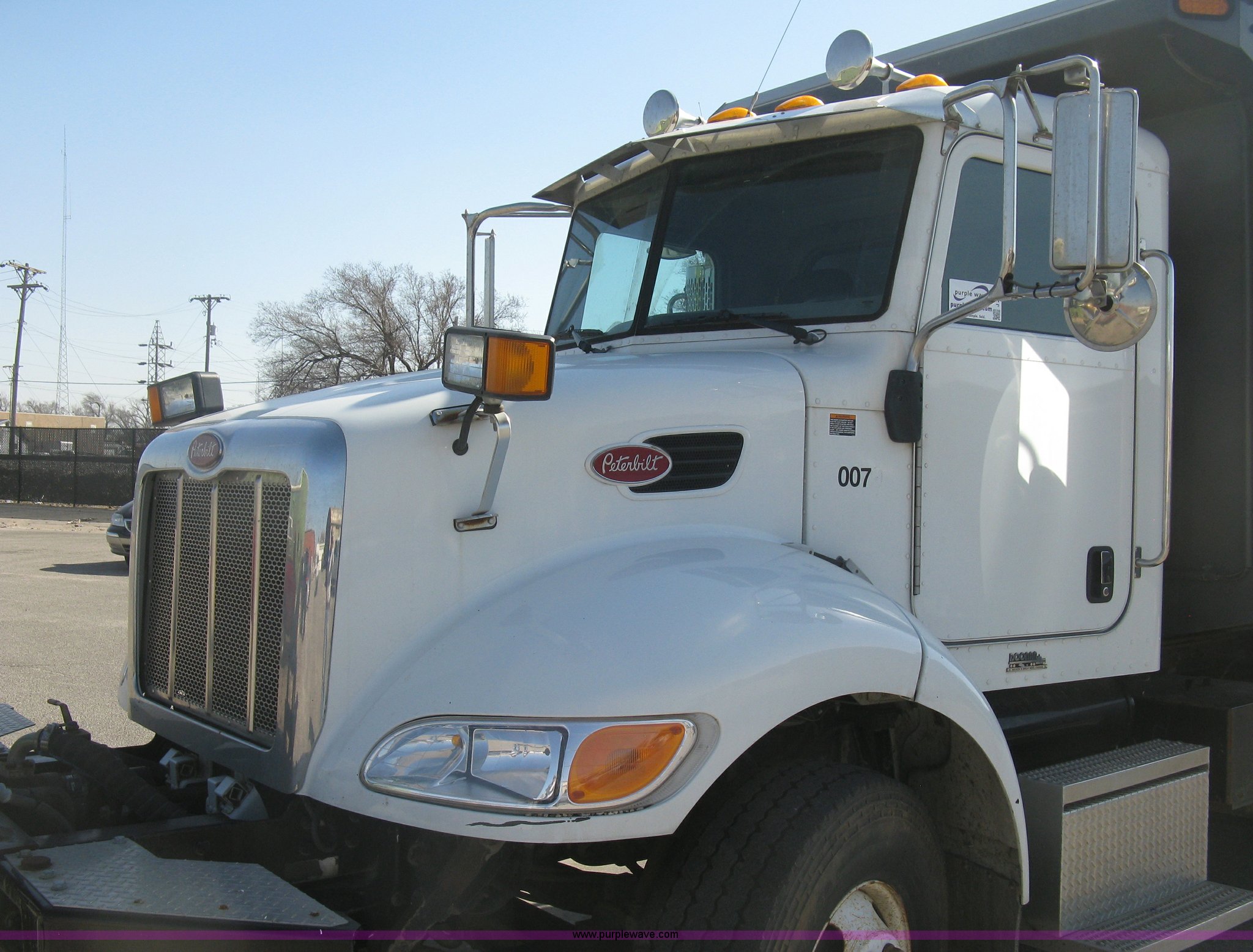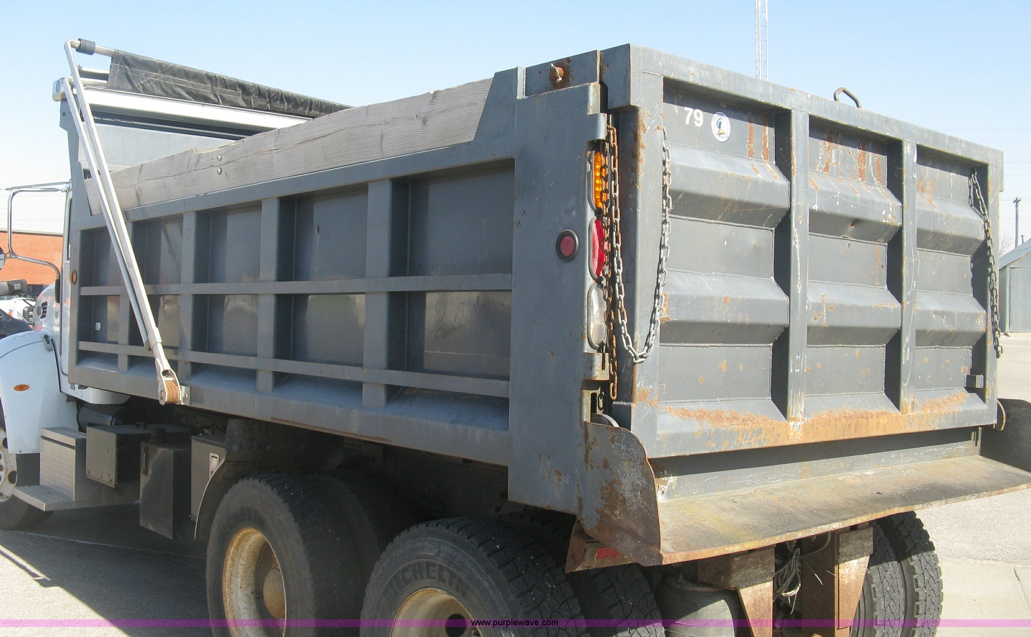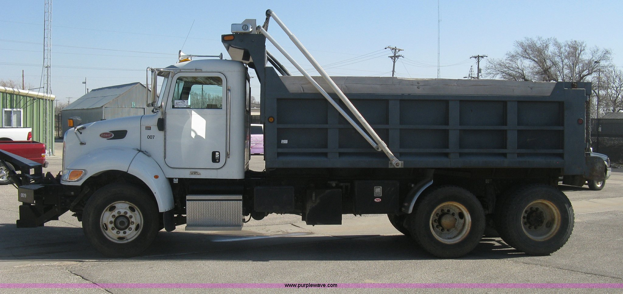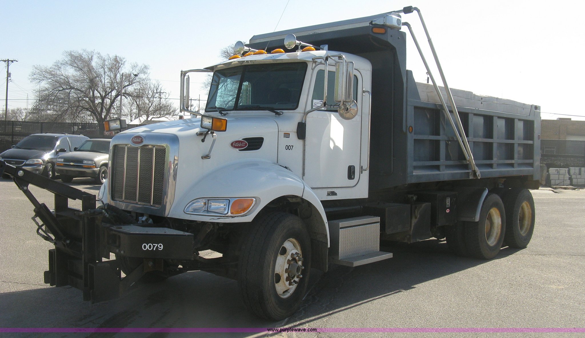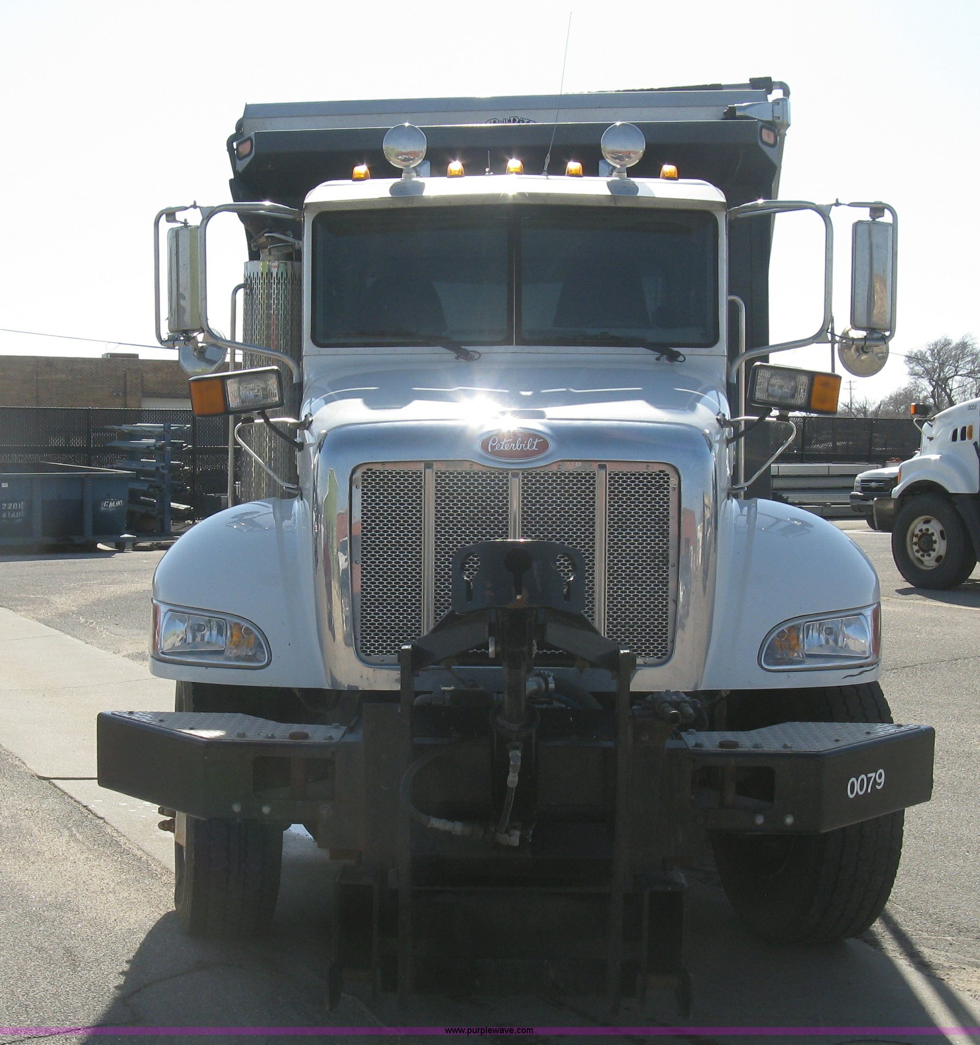 Purple Wave is selling a used Construction Dump Truck in Kansas. This item is a 2008 Peterbilt 340 dump truck with the following: 103,292 miles on odometer, 4,335 hours on meter, Paccac PX-8 8.3L L6 turbo diesel engine, Automatic transmission, Tandem axle, Full screw, AC and heat, Tilt, Telescoping steering wheel, Cruise, AM/FM, Heated mirrors, Air suspension seat, Block heater, Exterior visor, PTO, Dickey John controls, Joystick hoist control, Joystick plow control, Spreader control, Strobe, tarp, and tailgate control, Mabar DB153659 steel dump bed, 15'L x 8'W, 36" side height, 10" side board height, Single ram hoist, Air operated end gate, Roll-over tarp, Toolboxes, Single fuel tank, Rear air valve, Double frame, 210" wheelbase, Air suspension, Air brakes, Engine brake, 315/80R22.5 front tires, 11R22.5 rear tires, GVWR 58,000 lbs, FAWR 18,000 lbs, IAWR 20,000 lbs, RAWR 20,000 lbs, Recently installed plow frame, Unit# 0079