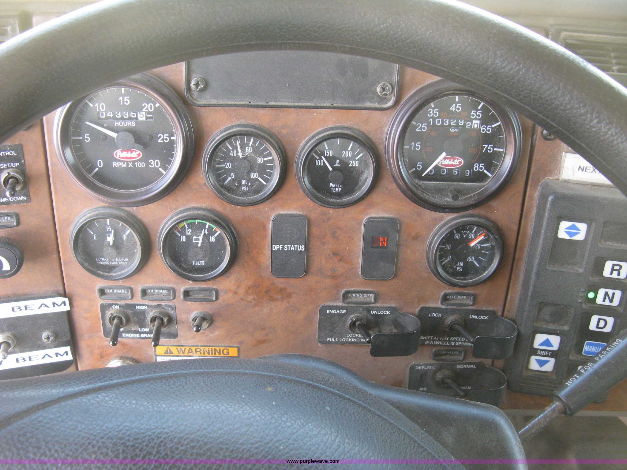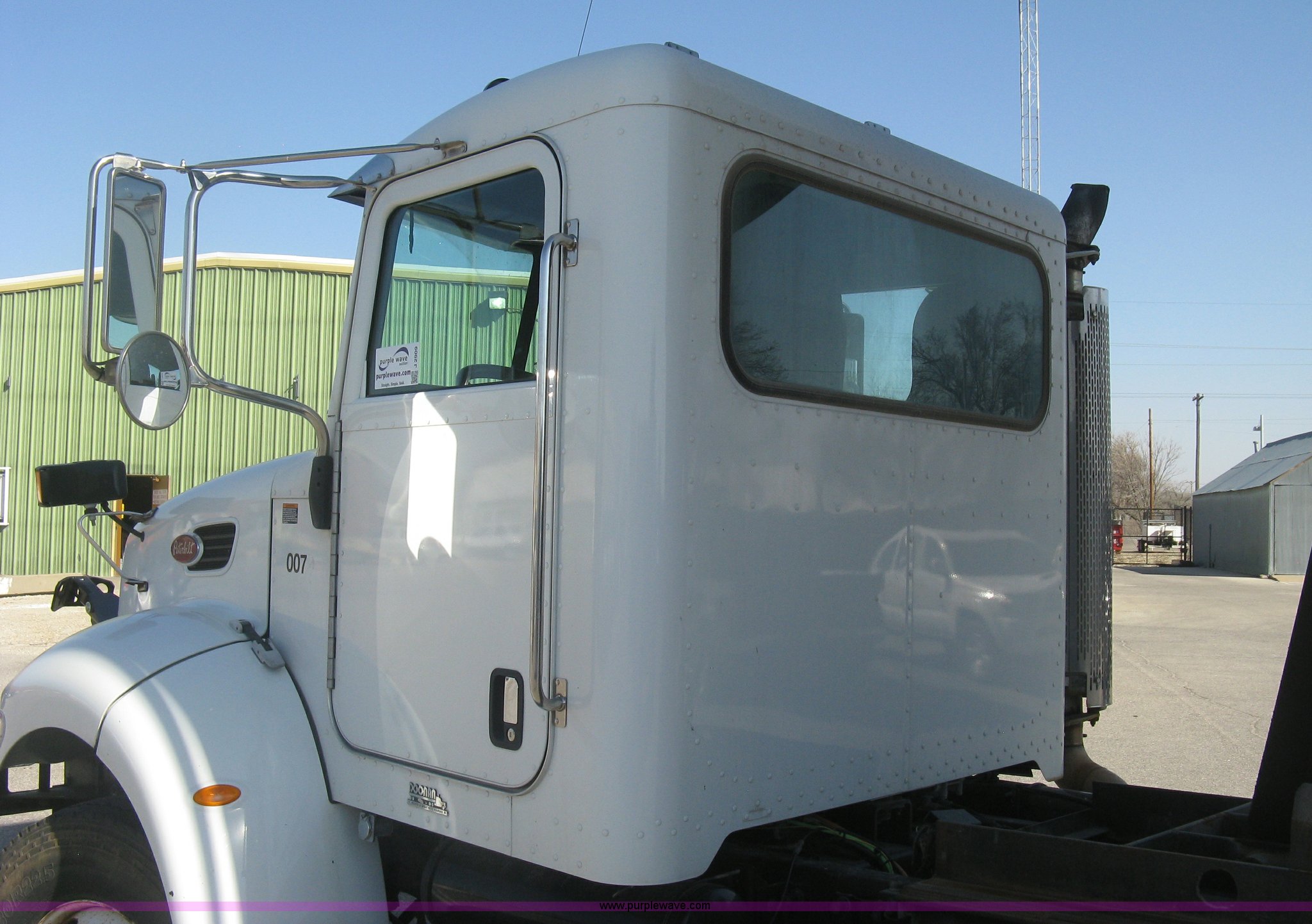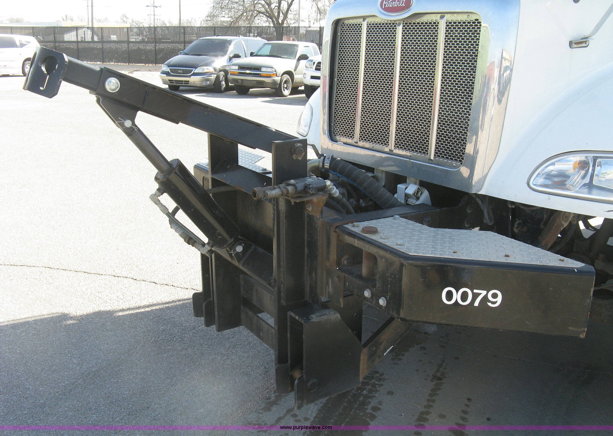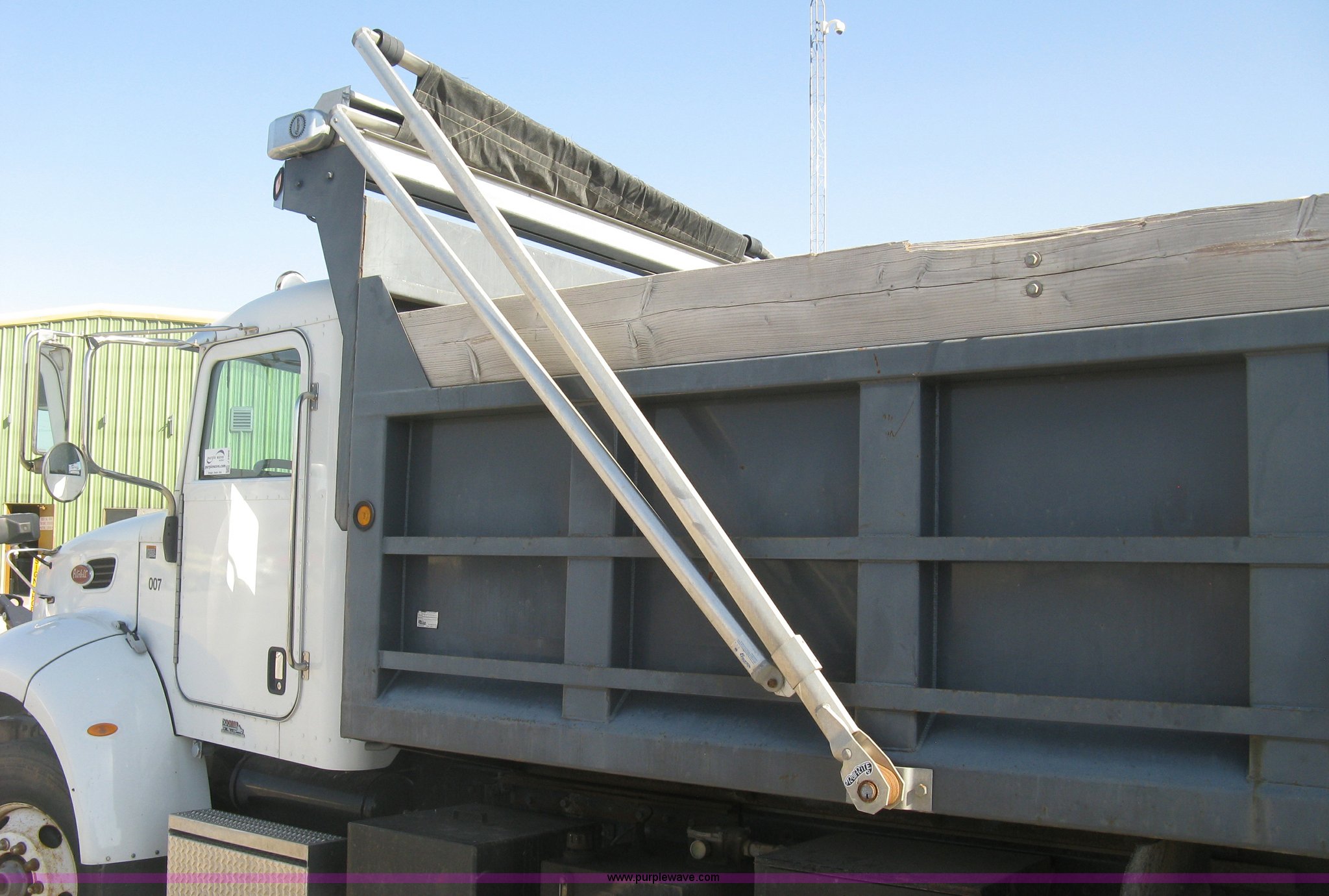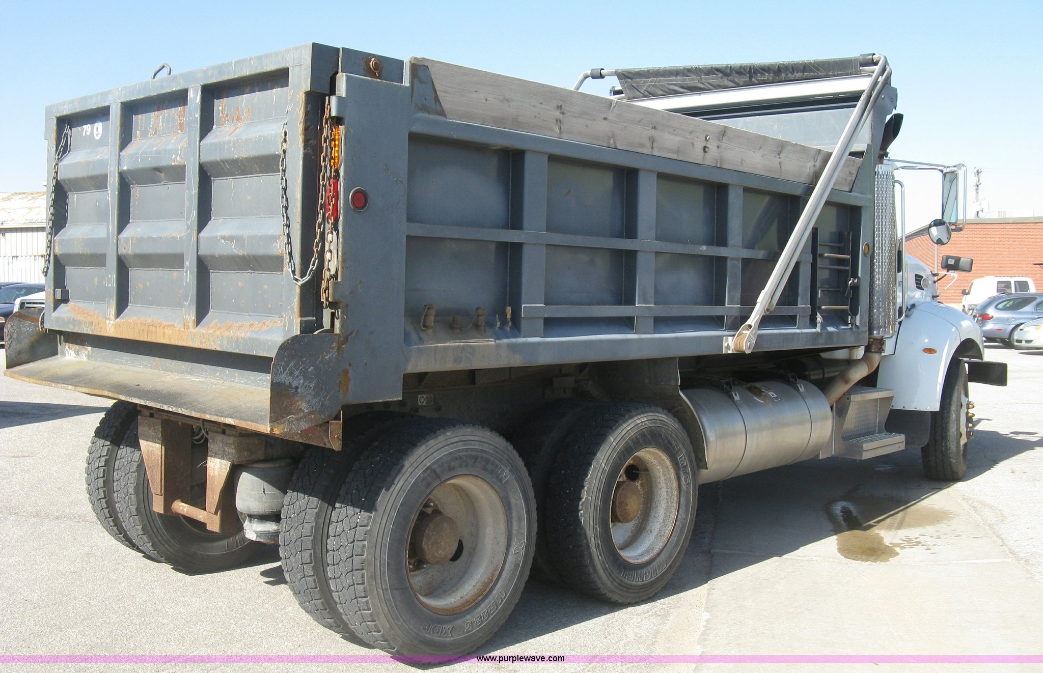 Purple Wave is selling a used Construction Dump Truck in Kansas. This item is a 2008 Peterbilt 340 dump truck with the following: 103,292 miles on odometer, 4,335 hours on meter, Paccac PX-8 8.3L L6 turbo diesel engine, Automatic transmission, Tandem axle, Full screw, AC and heat, Tilt, Telescoping steering wheel, Cruise, AM/FM, Heated mirrors, Air suspension seat, Block heater, Exterior visor, PTO, Dickey John controls, Joystick hoist control, Joystick plow control, Spreader control, Strobe, tarp, and tailgate control, Mabar DB153659 steel dump bed, 15'L x 8'W, 36" side height, 10" side board height, Single ram hoist, Air operated end gate, Roll-over tarp, Toolboxes, Single fuel tank, Rear air valve, Double frame, 210" wheelbase, Air suspension, Air brakes, Engine brake, 315/80R22.5 front tires, 11R22.5 rear tires, GVWR 58,000 lbs, FAWR 18,000 lbs, IAWR 20,000 lbs, RAWR 20,000 lbs, Recently installed plow frame, Unit# 0079