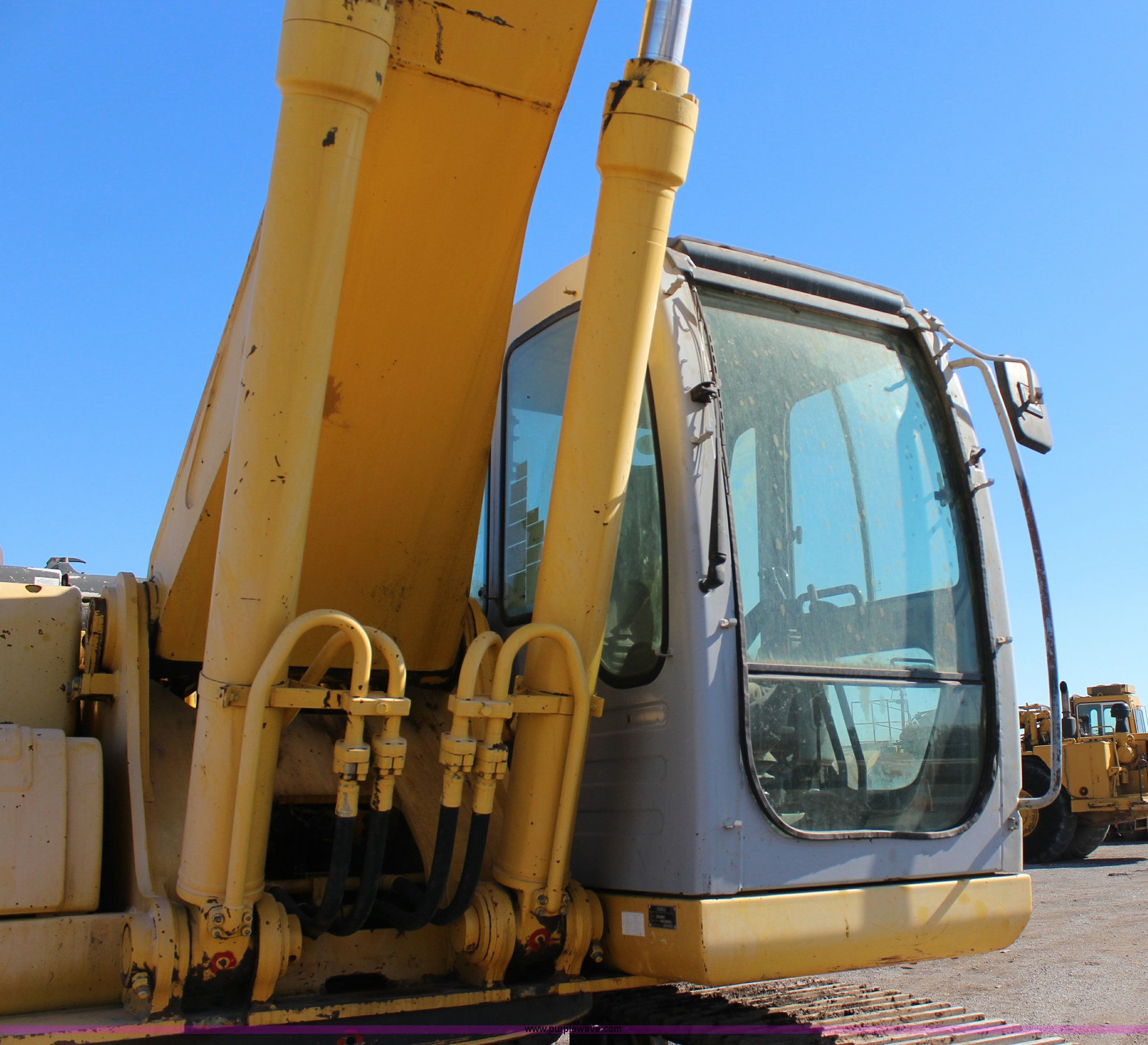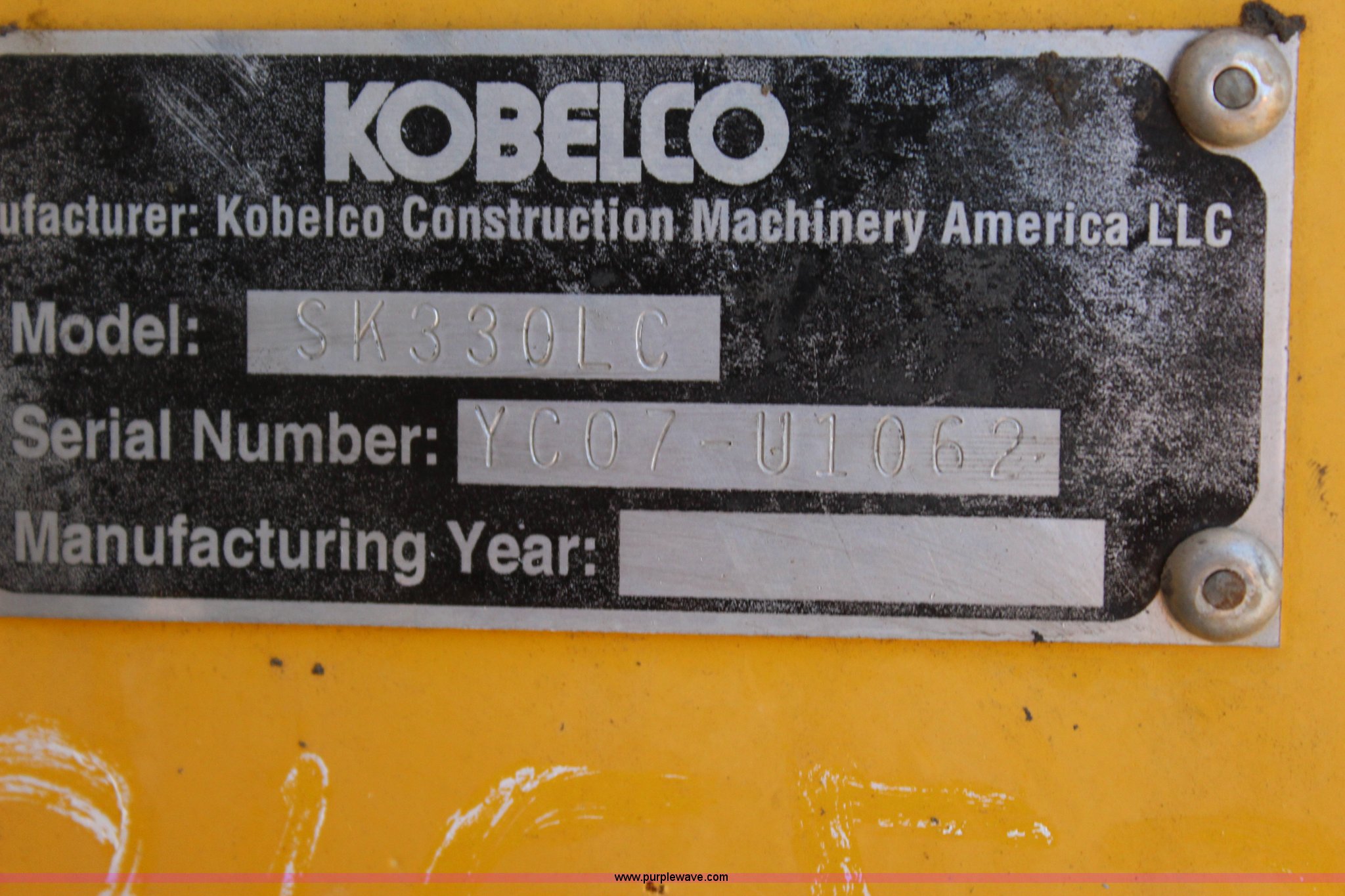 Purple Wave is selling a used Hydraulic Excavator in Oklahoma. This item is a 2005 Kobelco SK330LC excavator with the following: 8,836 hours on meter, Mitsubishi 6D16-TLU2D 7.54L six cylinder turbo diesel engine, Two speed hydrostatic transmission, EROPS, AC and heat, AM/FM, Air suspension seat, Wipers, Front work lights, Standard boom, 13' stick length, Auxiliary hydraulics, Eaco 54"W bucket, Bolt-on cutting edge, (6) bolt-on teeth, 31.5"W steel triple grouser track pads, 77,800 lbs. base operating weight, RPM drops when running, Serial YC07-U1062, Unit# 20.405L