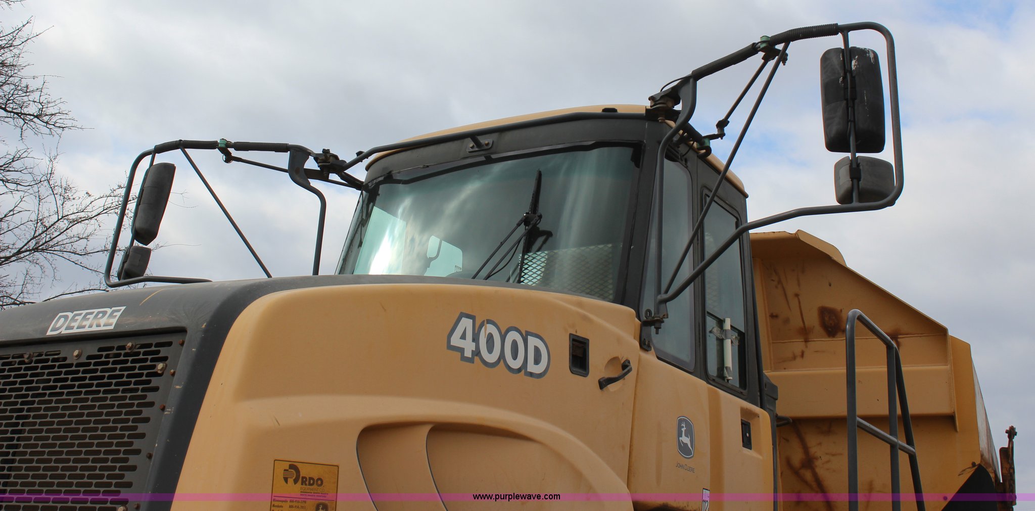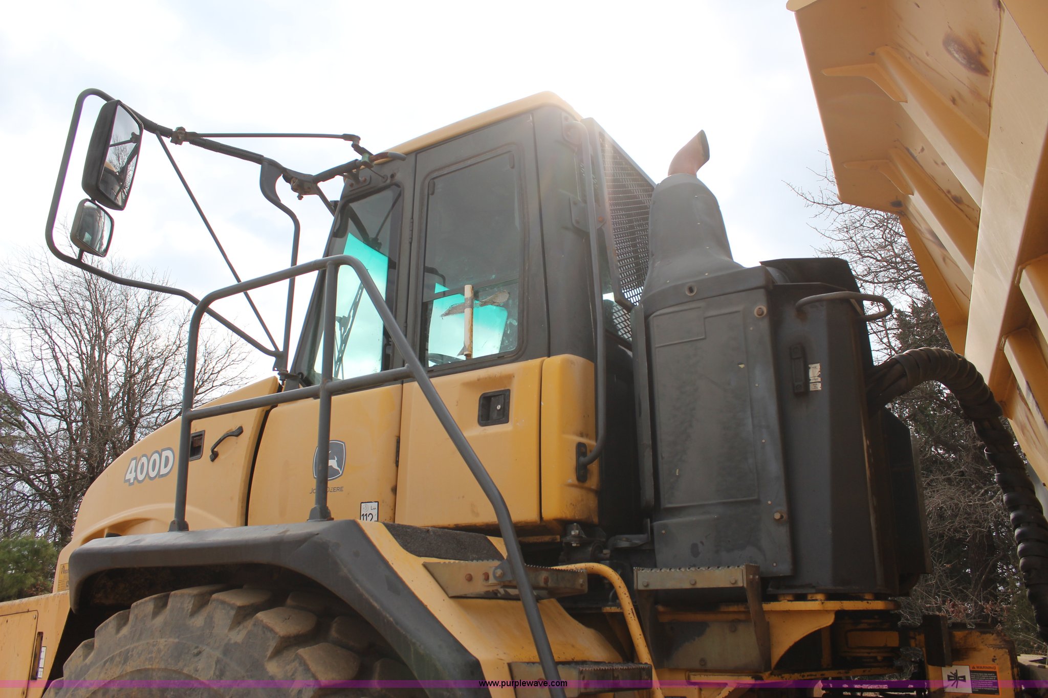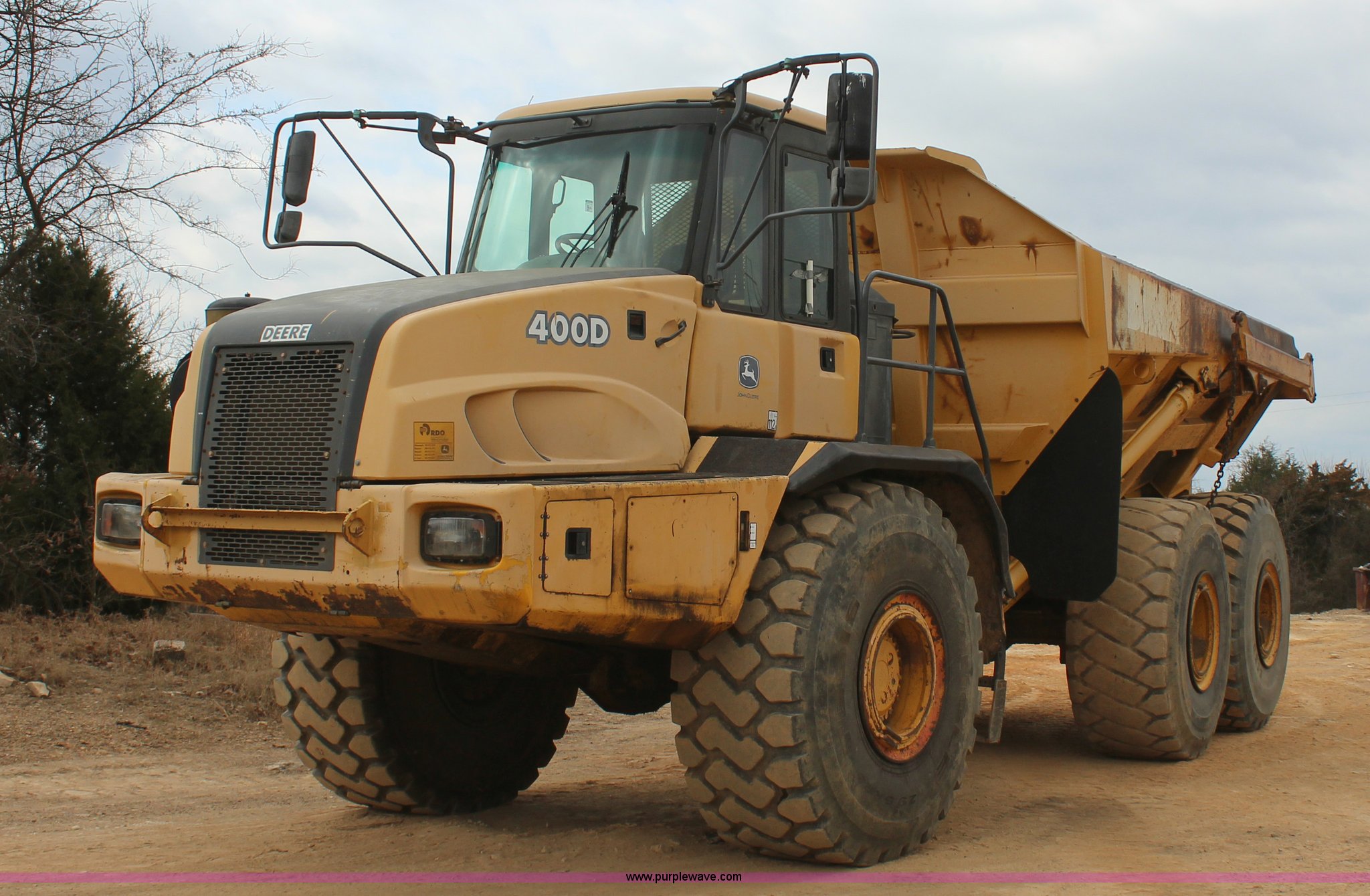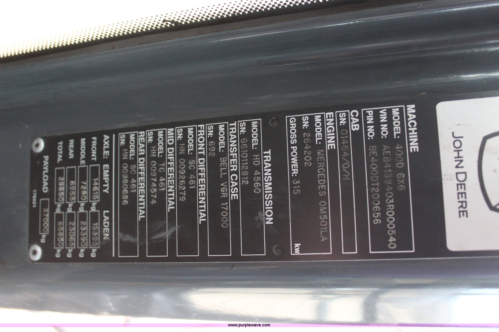 Purple Wave is selling a used Articulated Haul Truck in Oklahoma. This item is a 2003 John Deere 400D articulated haul truck with the following: 16,027 hours on meter, Mercedes-Benz six cylinder turbo diesel engine, Block heater, Automatic transmission, AC and heat, AM/FM, Tilt, Telescoping steering wheel, Air suspension seat, Power and heated mirrors, Engine brake, John Deere bed, 40 ton capacity, Steel construction, Mechanical end gate, Wheel weights, Pin hitch, Single fuel tank, Tandem axle, 29.5R25 tires, 65,960 lbs. base operating weight, (5) tires recently replaced, Serial BE400DT200656