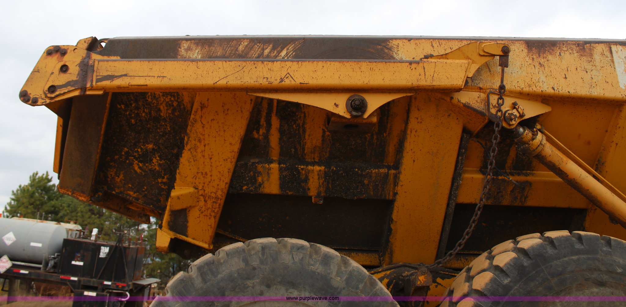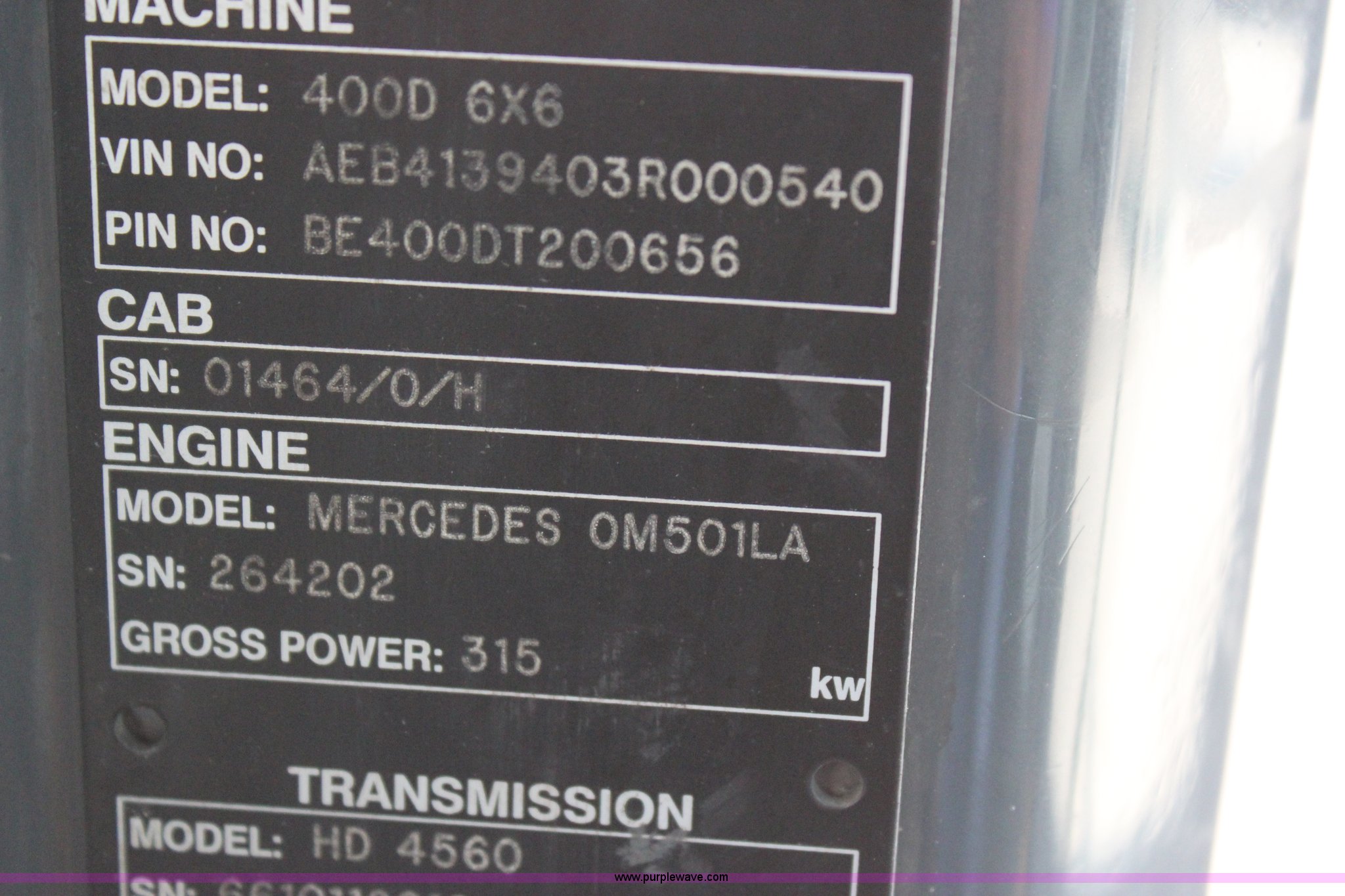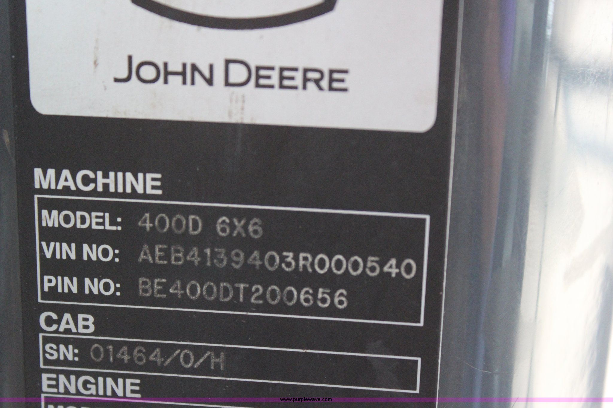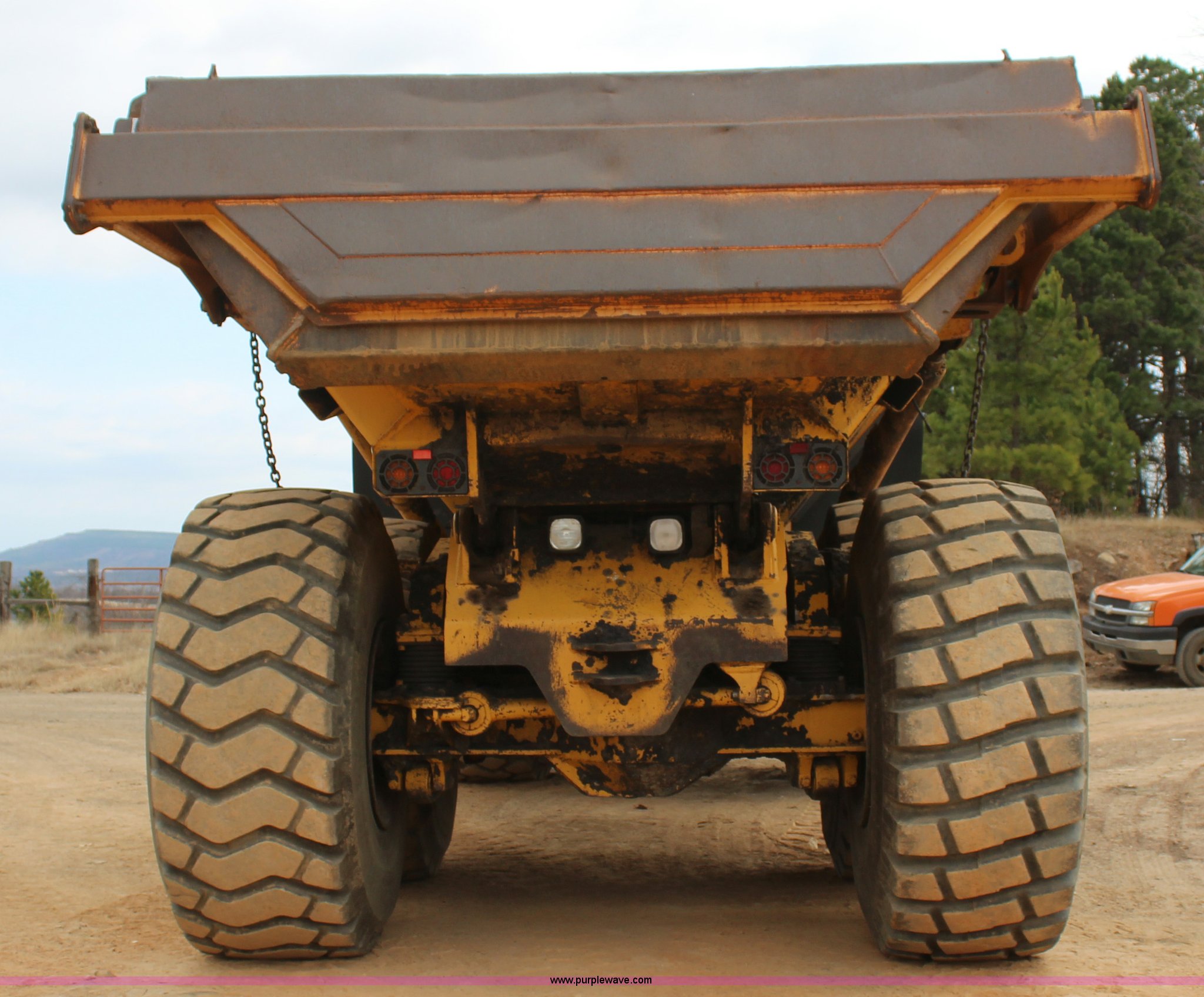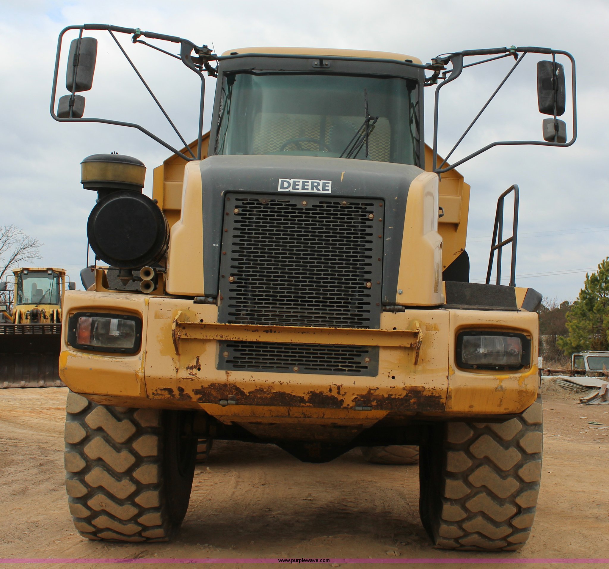 Purple Wave is selling a used Articulated Haul Truck in Oklahoma. This item is a 2003 John Deere 400D articulated haul truck with the following: 16,027 hours on meter, Mercedes-Benz six cylinder turbo diesel engine, Block heater, Automatic transmission, AC and heat, AM/FM, Tilt, Telescoping steering wheel, Air suspension seat, Power and heated mirrors, Engine brake, John Deere bed, 40 ton capacity, Steel construction, Mechanical end gate, Wheel weights, Pin hitch, Single fuel tank, Tandem axle, 29.5R25 tires, 65,960 lbs. base operating weight, (5) tires recently replaced, Serial BE400DT200656