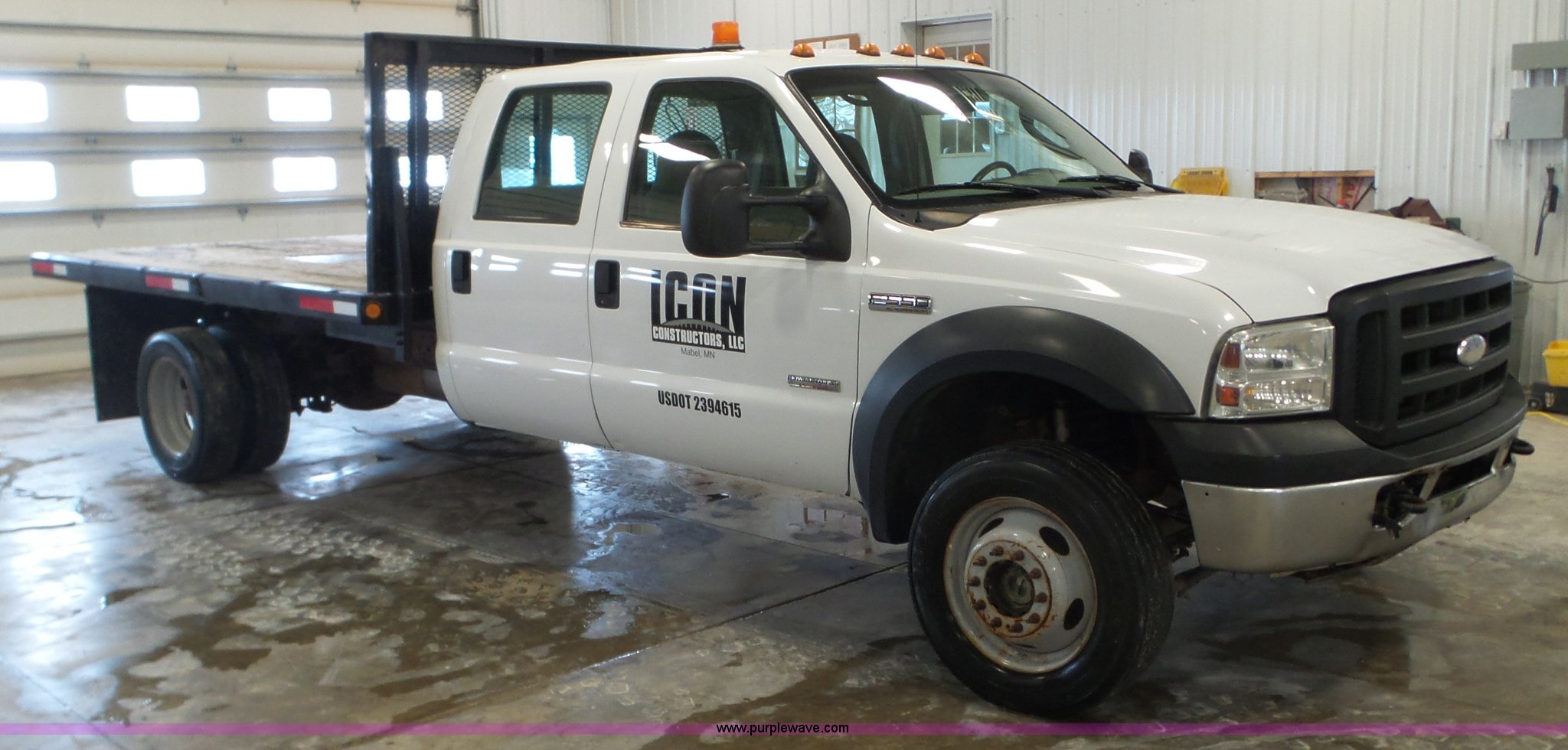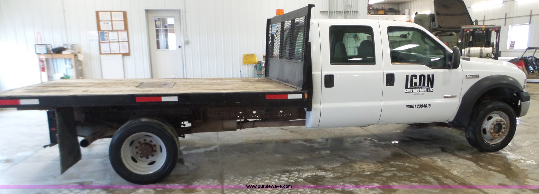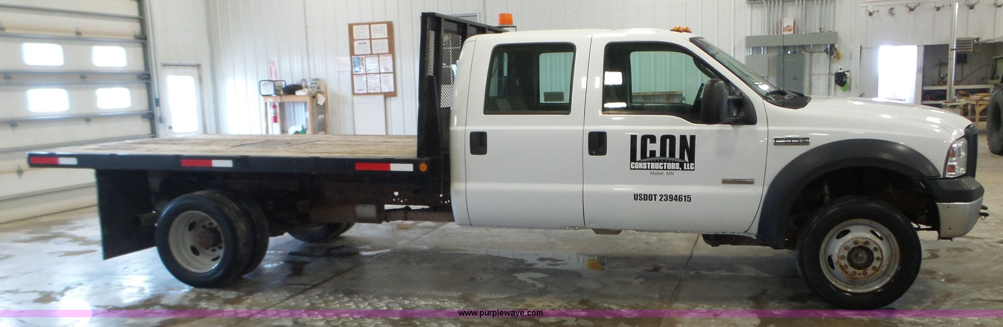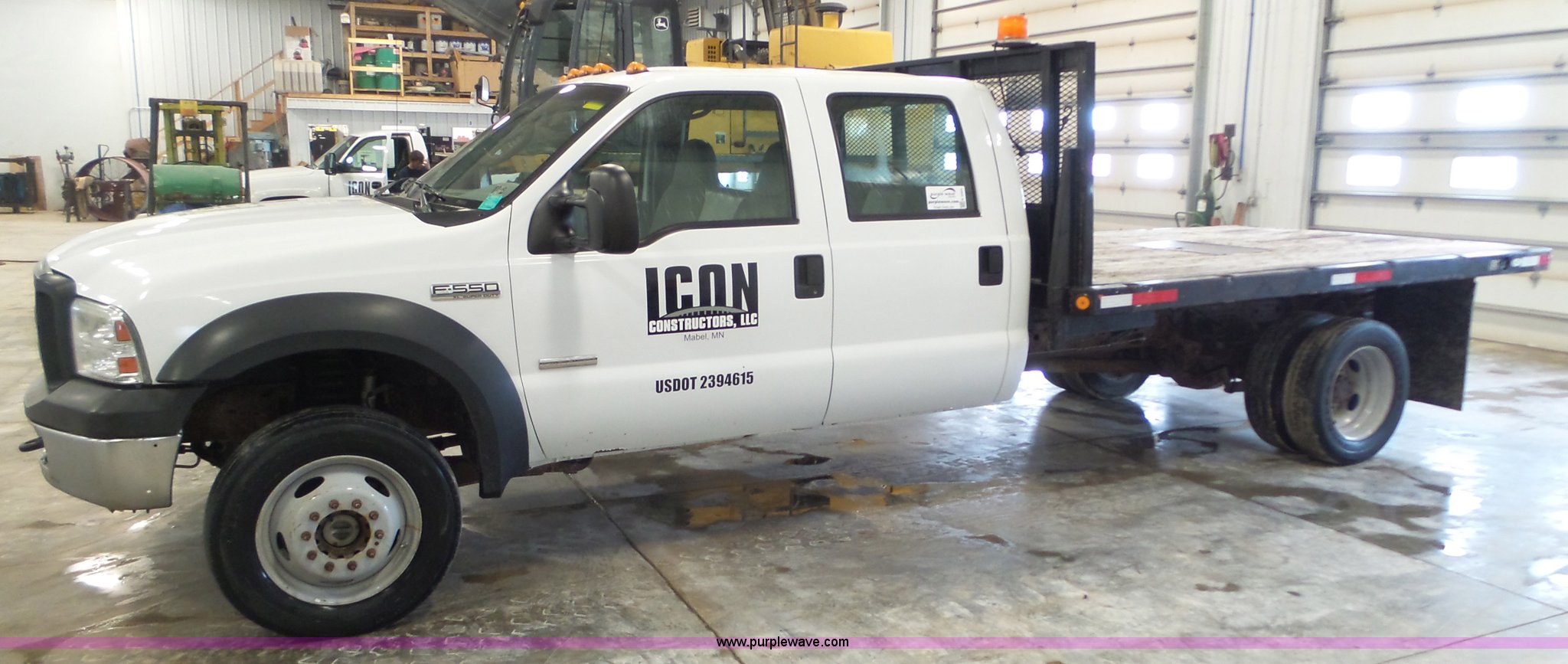 2007 Ford F550 Super Duty Crew Cab flatbed truck. 114,056 miles on odometer, 6.0L V8 OHV 32V turbo diesel engine, Automatic transmission, Four wheel drive, AC and heat, Tilt, Cruise, AM/FM/CD, Manual windows and locks, Cloth interior, Front tow hooks, 12'L x 8'W flatbed Gooseneck ball, Receiver hitch, 225/75R19.5 tires. Title distribution may be delayed up to 14 days from verification of funds. 1FDAW57P17EA87614. Icon Constructors, LLC. 13498 County Rd 28. Mabel, MN 55954