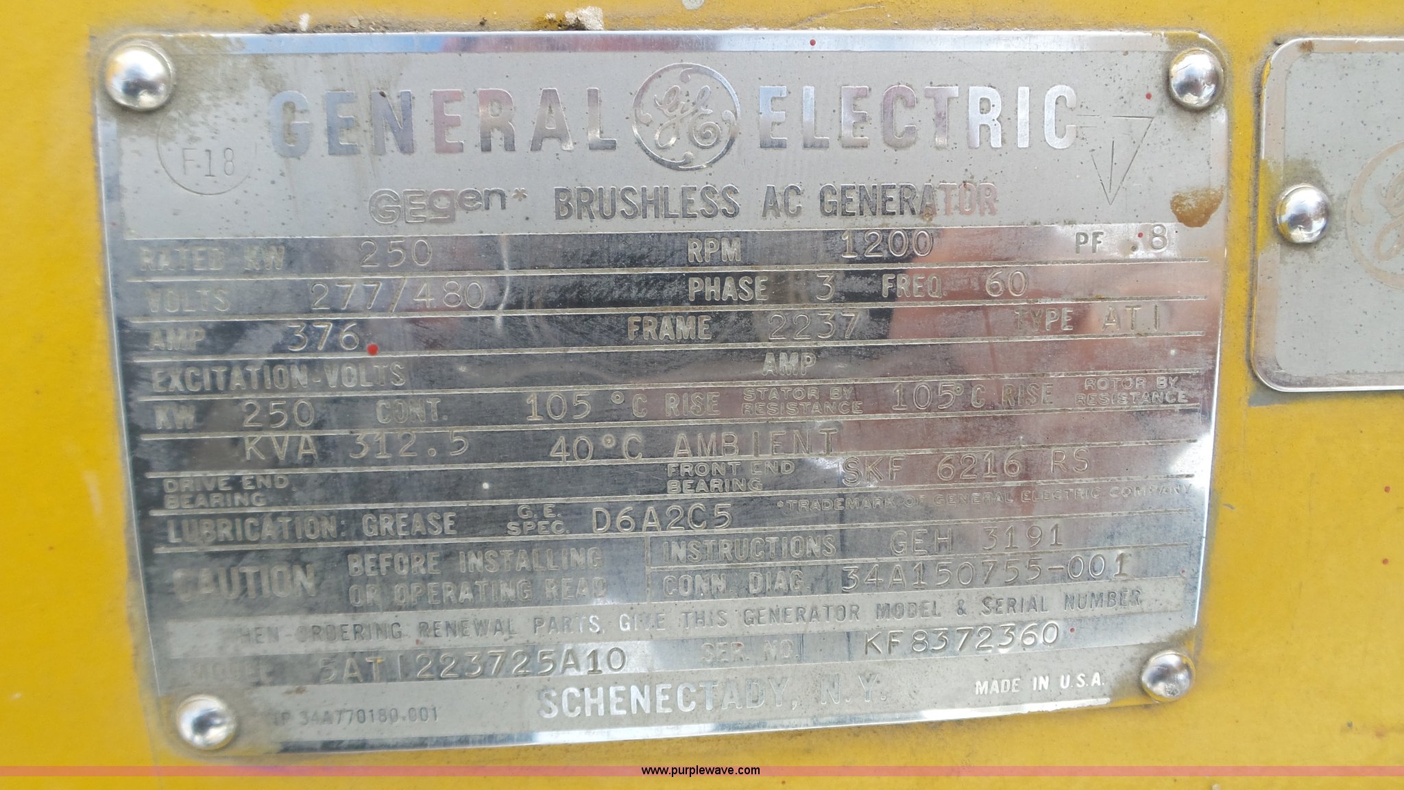 Caterpillar G398 generator. Caterpillar G398 12 cylinder natural gas engine 500 HP, Serial 73B777, General Electric generator unit Model 5AT/223725A10, 250 kW, Three phase, 277/480V, (2) batteries, Exhaust, Manuals included, Approx. 28 hours on meter of switch gear that has been removed, Operational when removed from service on February 26,2016, Serial 73B777. Wapasha Construction. 927 E King St. Winona, MN 55987