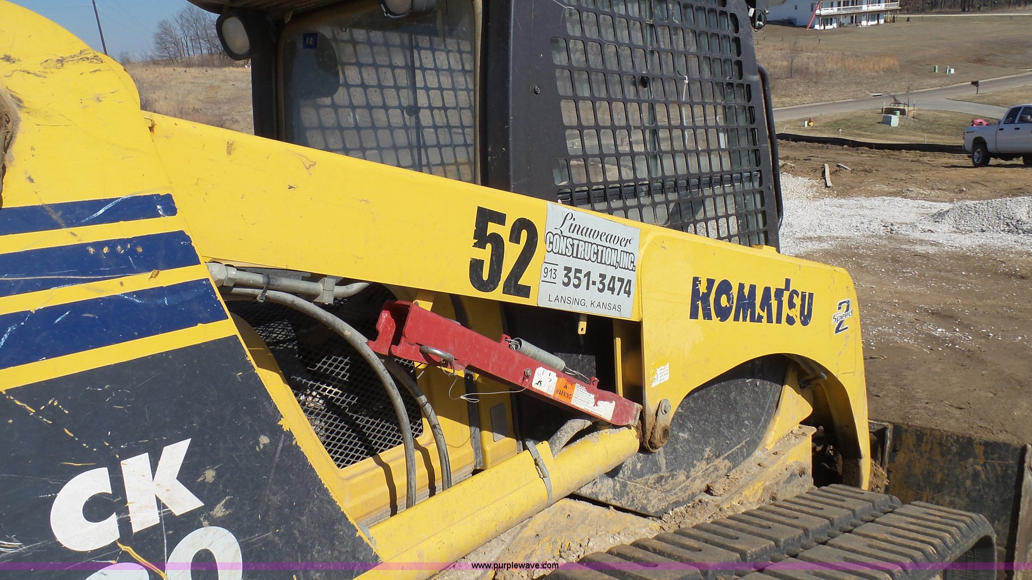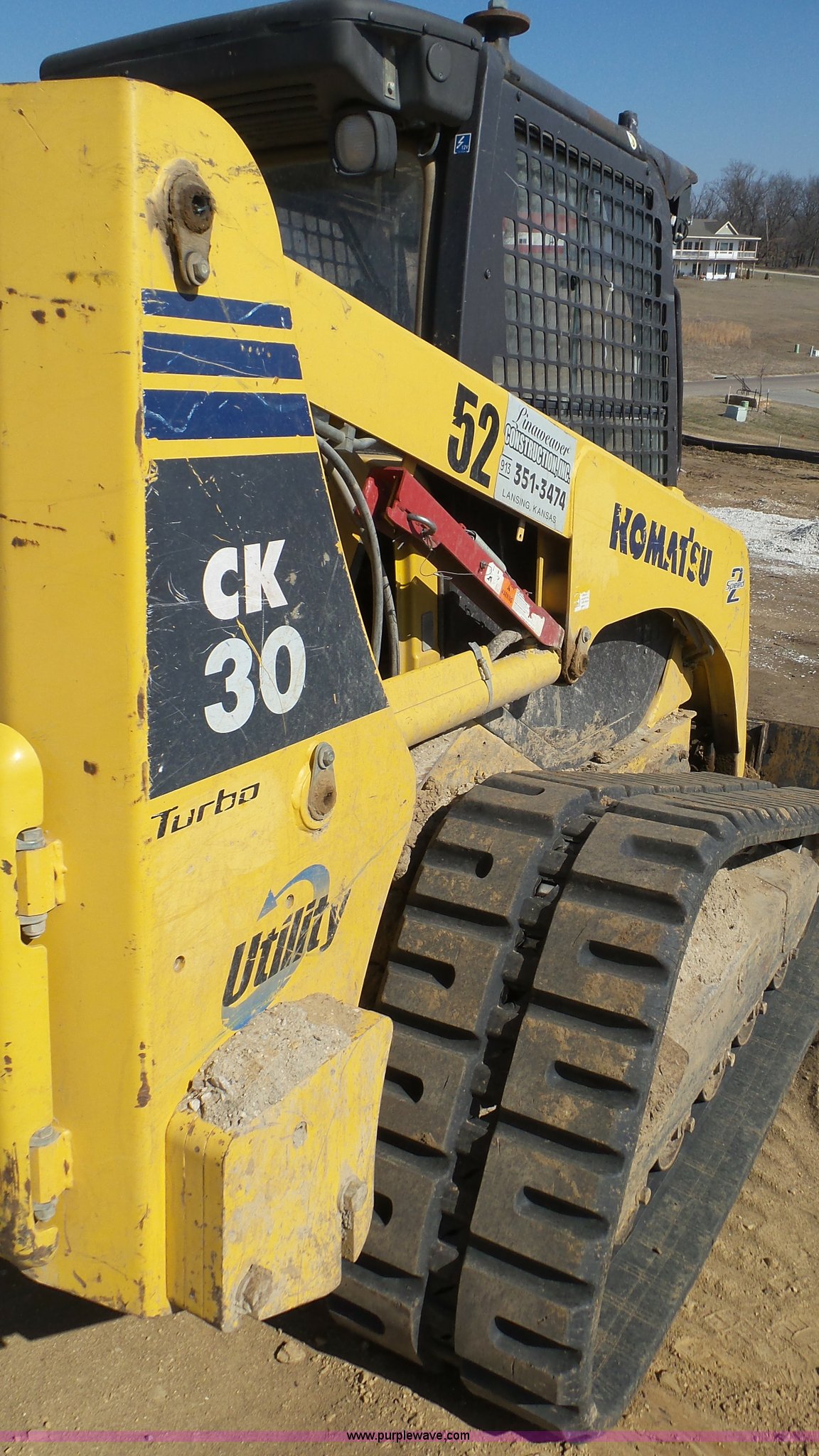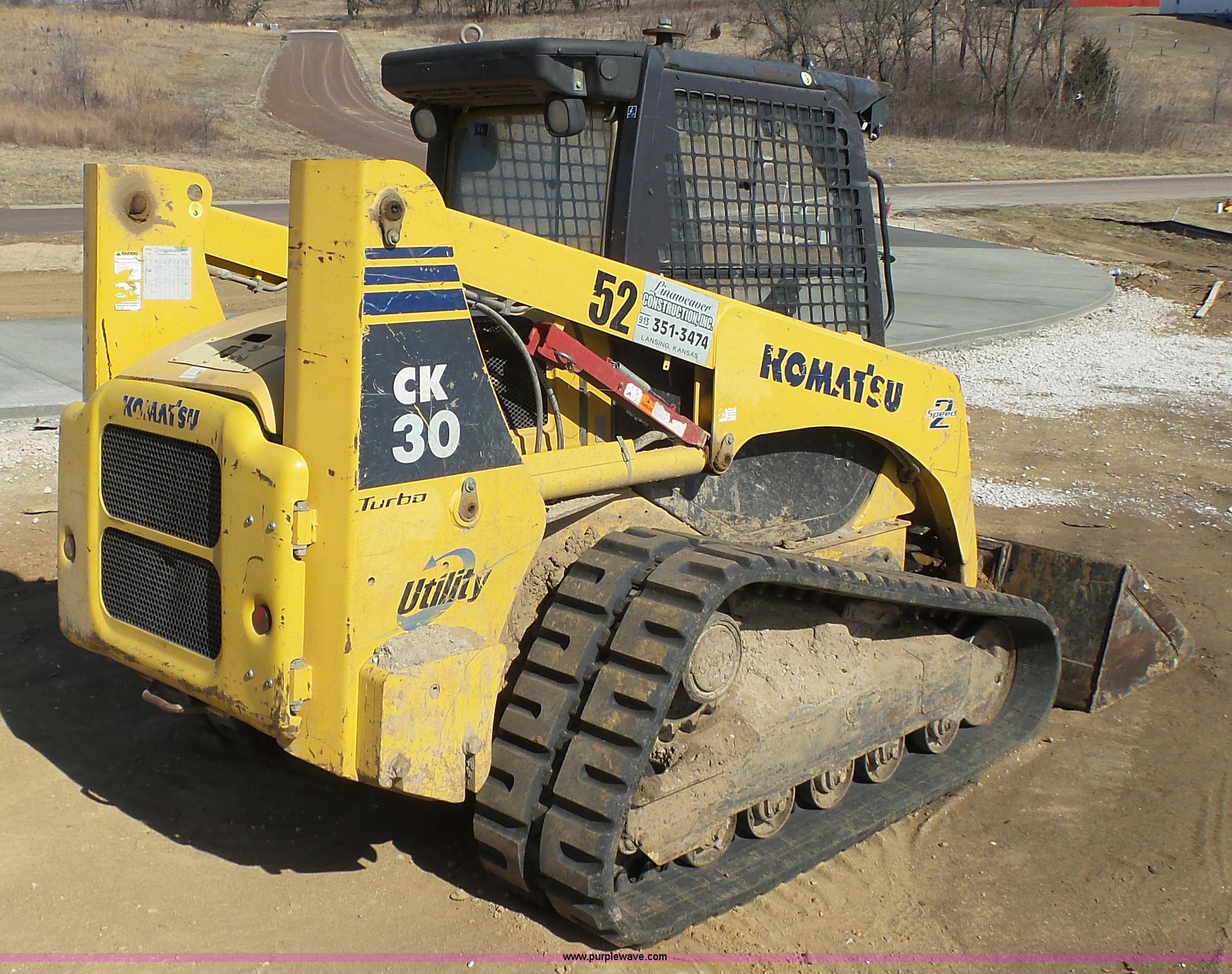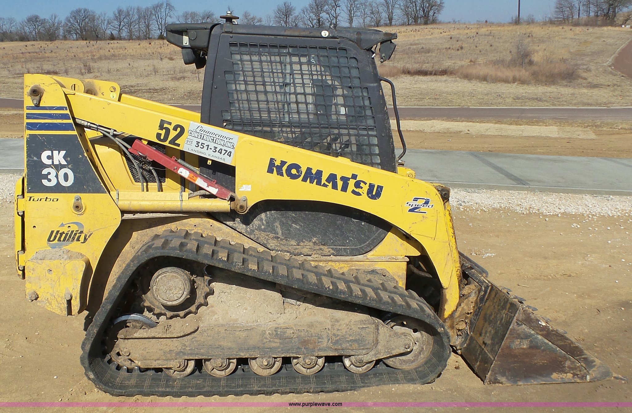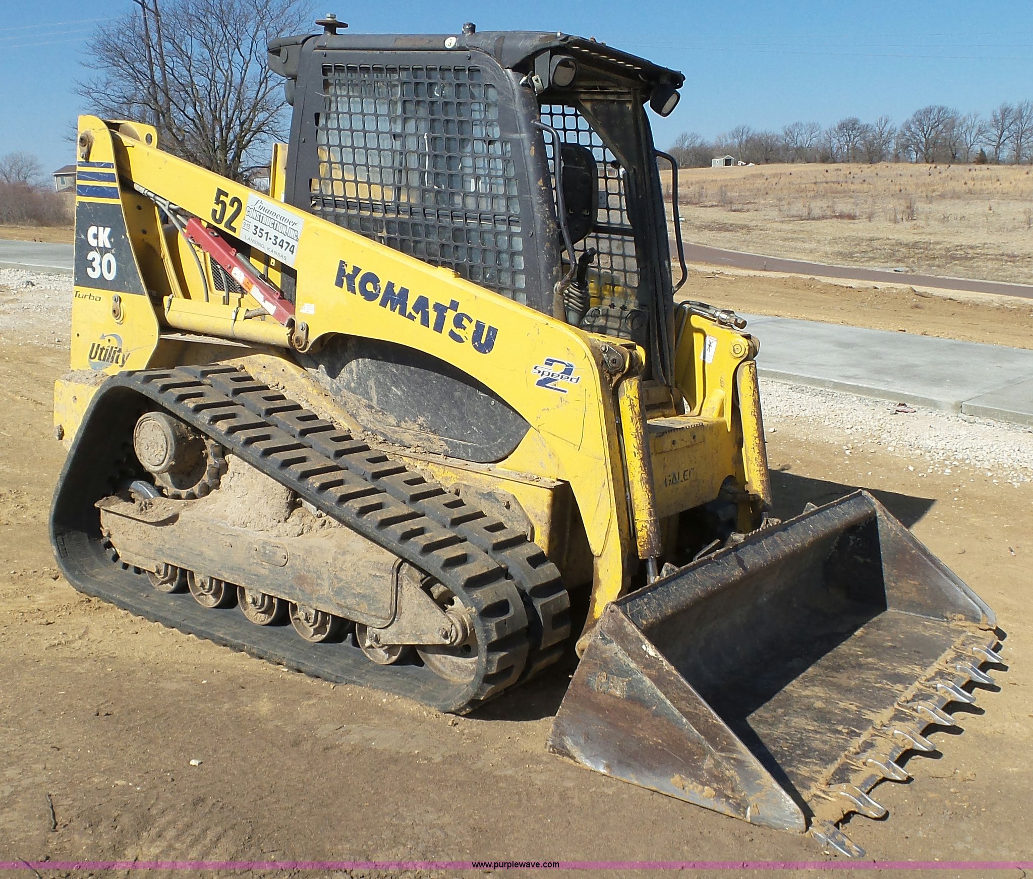 Purple Wave is selling a used Tracked Skid Steer Loader in Kansas. This item is a 2008 Komatsu CK30-1 skid steer with the following: 3,888 hours on meter, Komatsu 3.3L four cylinder diesel engine, 84 HP, Two speed hydrostatic transmission, Enclosed cab, AC and heat, Joystick controls, Spring suspension seat, Auxiliary hydraulics, Counterweights, 17.5"W tracks, 9,546 lbs. base operating weight, Bucket pictured is not included, Bucket will be provided, No door, Serial A30723