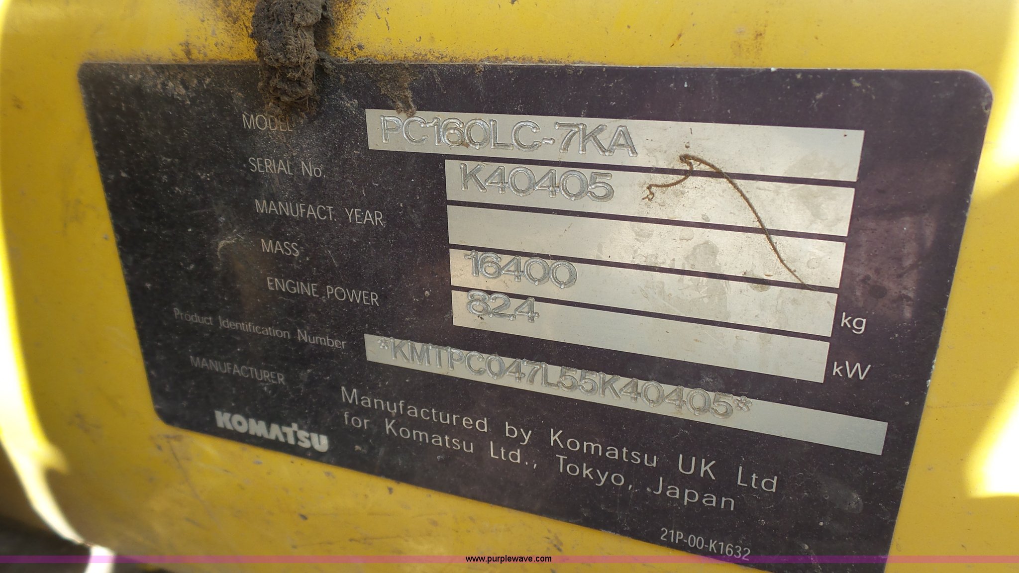Purple Wave is selling a used Hydraulic Excavator in Kansas. This item is a 2004 Komatsu PC160LC-7KA excavator with the following: 7,240 hours on meter, Komatsu 4.5L four cylinder diesel engine, 121 HP, Hydrostatic transmission, EROPS, AC and heat, AM/FM, Suspension seat, Standard boom, 8.5' stick length, Esco 36"W bucket, (5) weld-on teeth, 0.81 cu. yd. capacity, 24"W steel triple grouser track pads, Serial K40405